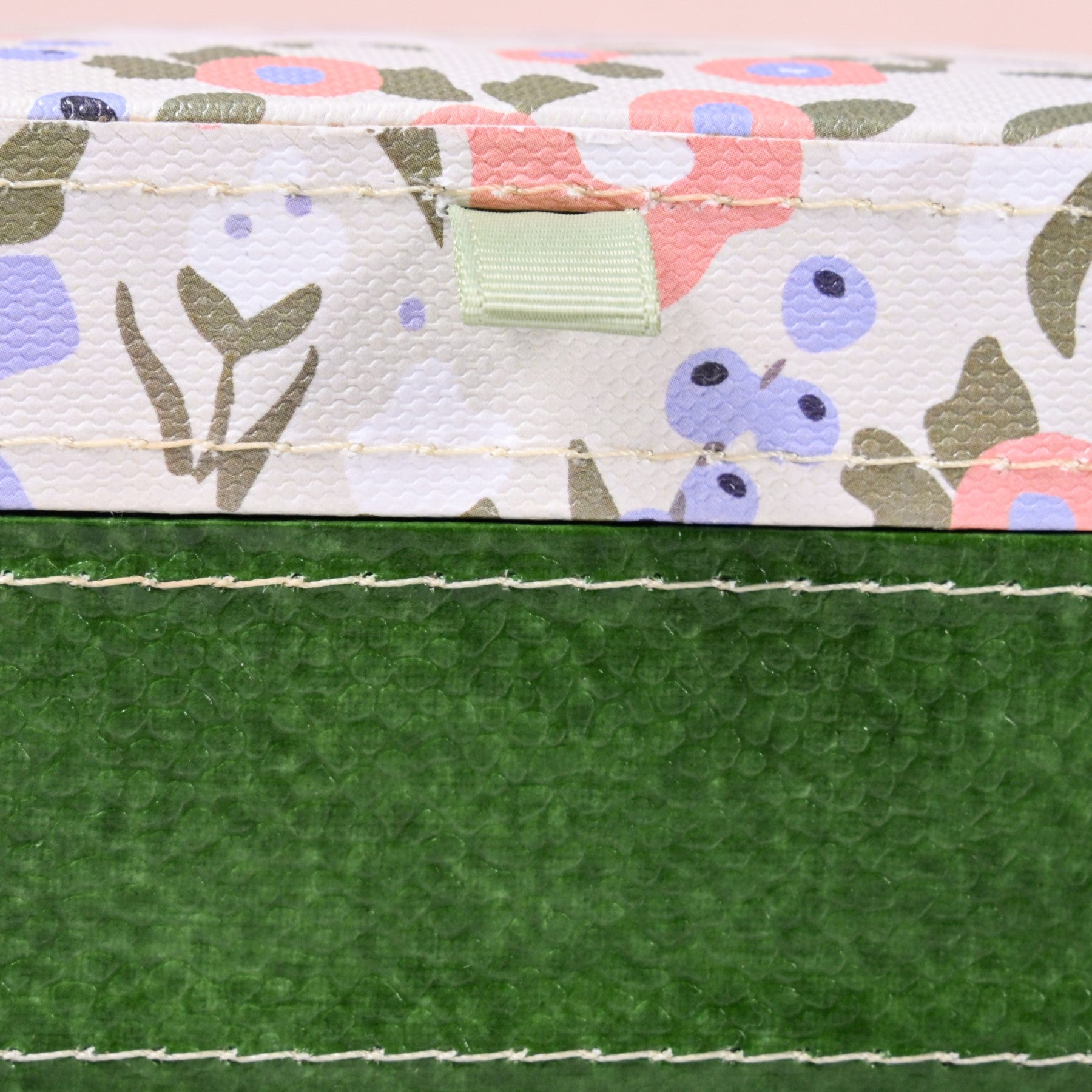 Design: Crafted with a durable yet lightweight fibreboard frame and lined with a soft green suede-like material, this box ensures your jewellery stays scratch-free. The outer surface flaunts a playful floral print featuring daisies, wild berries, and pastel blooms on the light green-toned base, giving it a fresh, feminine touch. Inside, you’ll find ring rolls, square compartments for earrings and studs, and a full mirror on the inner lid for added convenience. The attached mirror makes styling and accessorising fuss-free, while the clasp keeps your treasures secure wherever you go. The base of the box is dark green, complementing the floral print.