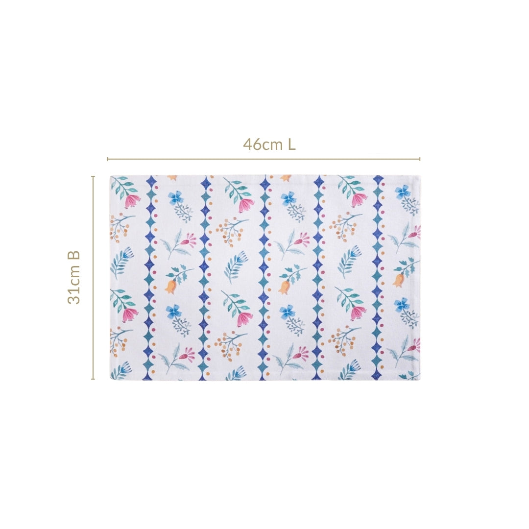 Design: Bring a touch of floral charm to your dining space with this reversible four-seater cotton table mat set. The design features graceful vertical rows of floral and botanical illustrations in muted hues of rose pink, mustard yellow, slate blue, and sage green. Each motif is framed between scalloped borders in deep teal and navy, while playful multicoloured dots dance along the edges, adding a lively contrast. Crafted from pure cotton, the fabric may shrink 5–6% after washing but returns to shape with a warm iron. Set against a soft off-white background, the pattern feels both nostalgic and contemporary, perfect for adding warmth and character to everyday dining or special occasions.