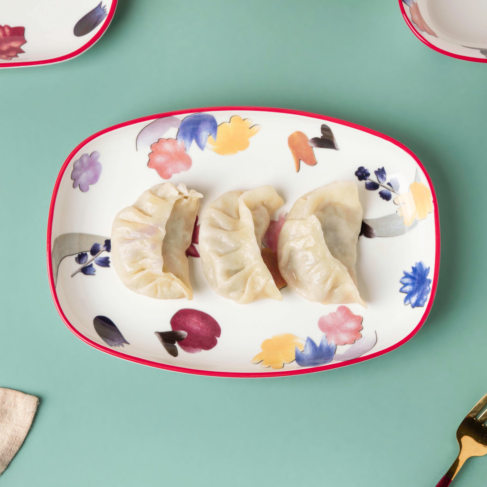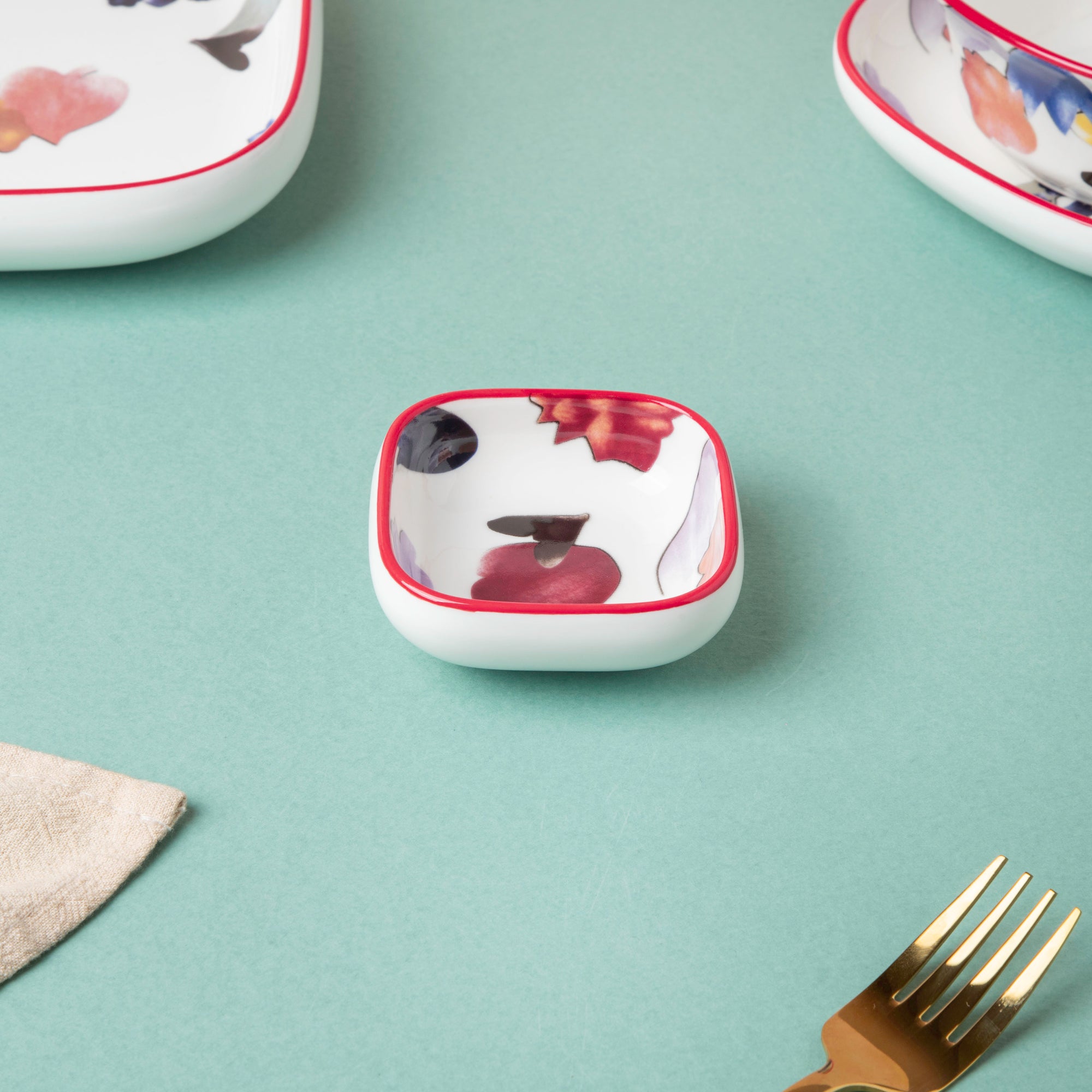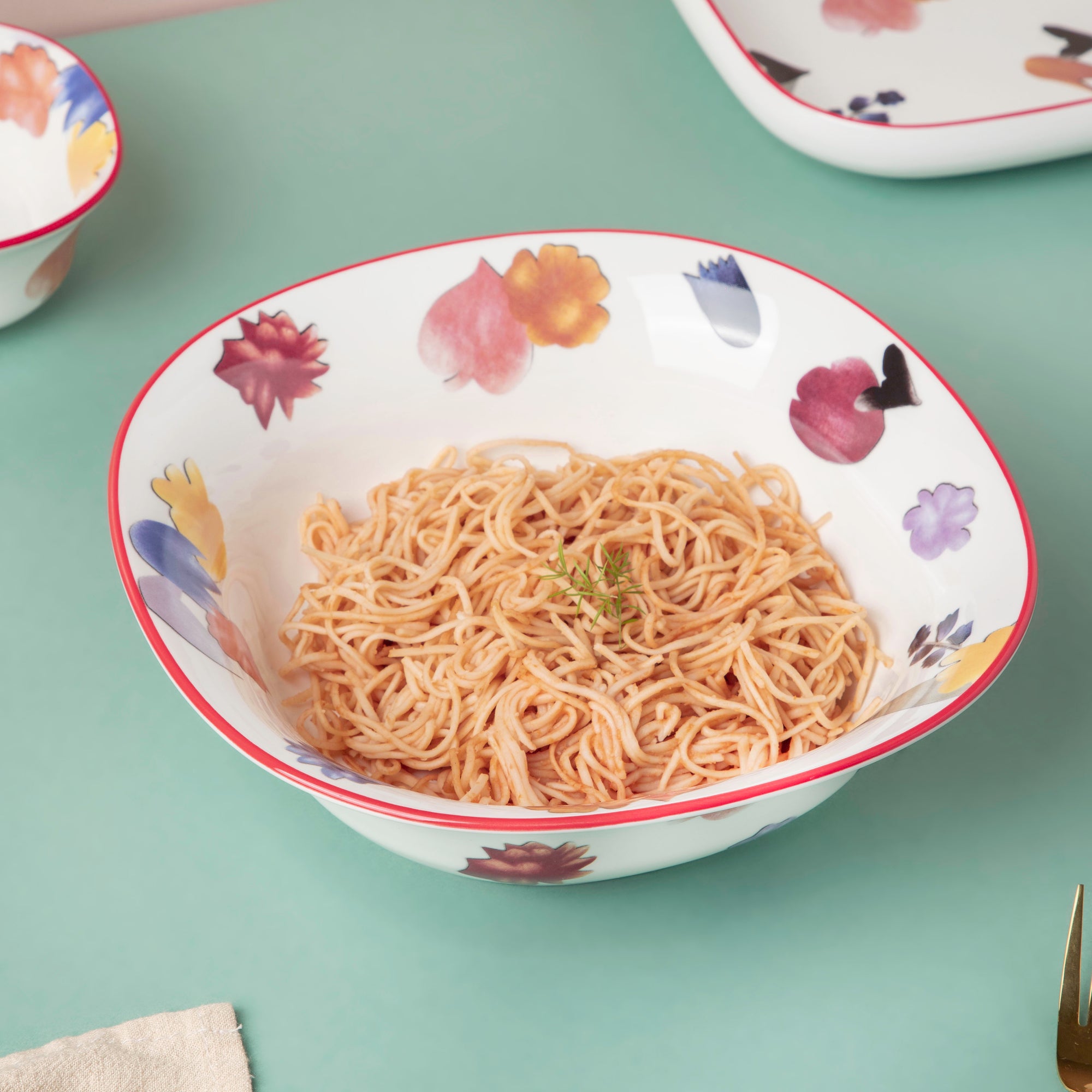 Flowers have always been the center of aromatic freshness and modest gifting. With its eternal attribute to bloom a sparkling smile in an instant, the Florista collection is crafted using high-quality ceramic and prints of blooms. Organize the Florista bowls and plates on the table, much like an arrangement of petals sprinkled for a special occasion. The collection holds 6 dinner plates of 9 inches, 6 snack plates of 7.5 inches, 6 dip dishes, 6 soup bowls, 1 deep dish of 7.5 inches,1 long plate of 10 inches, and 3 serving bowls of 9 inches.