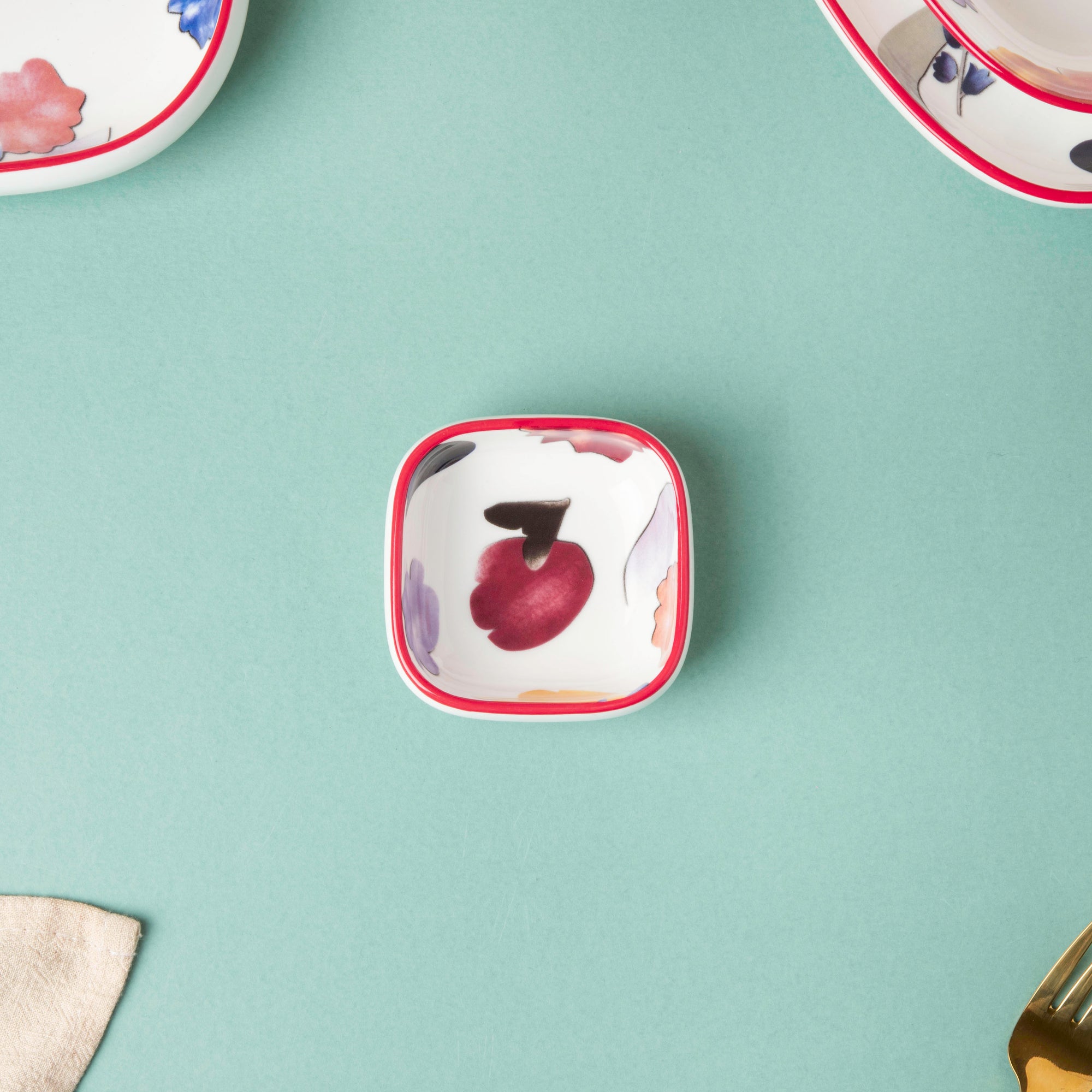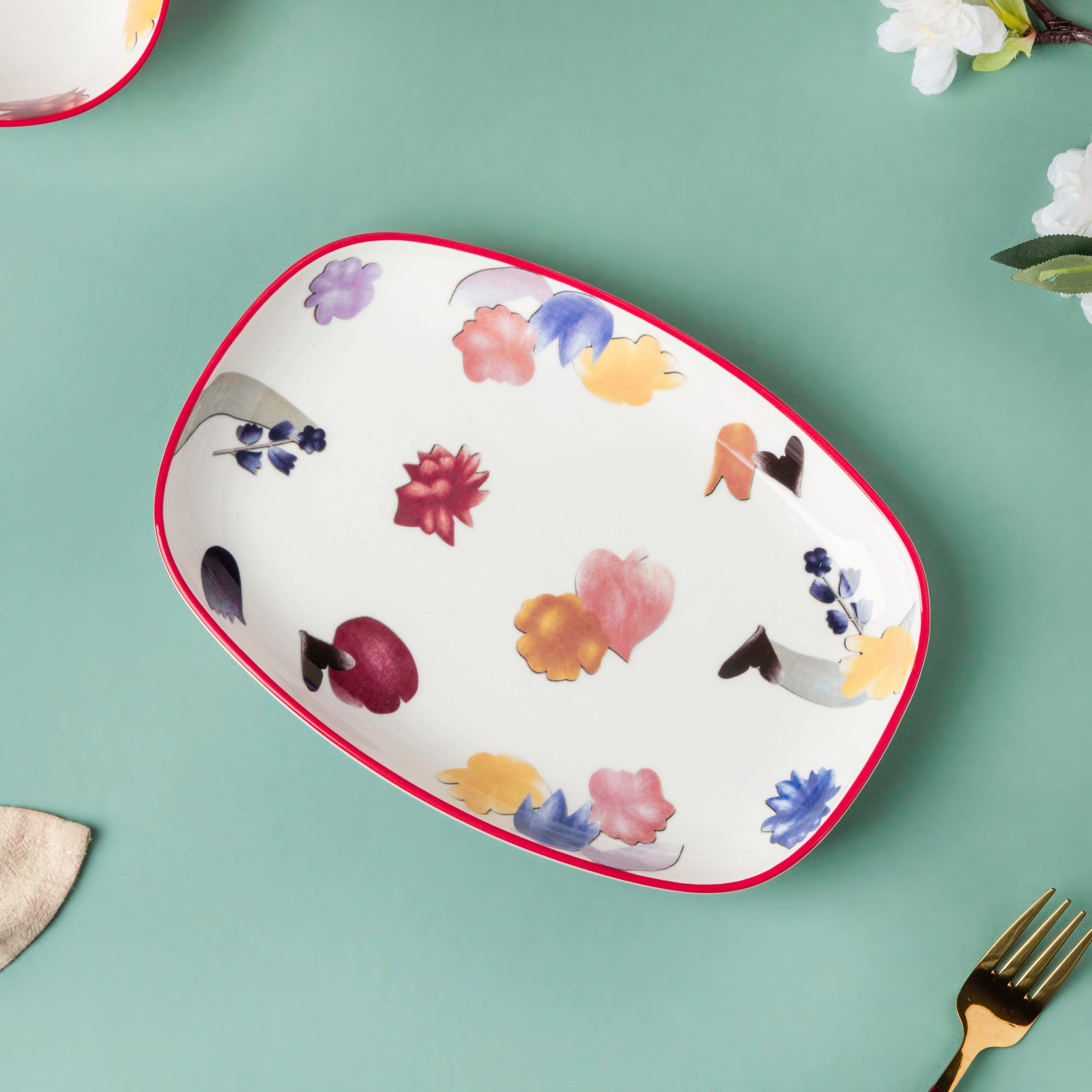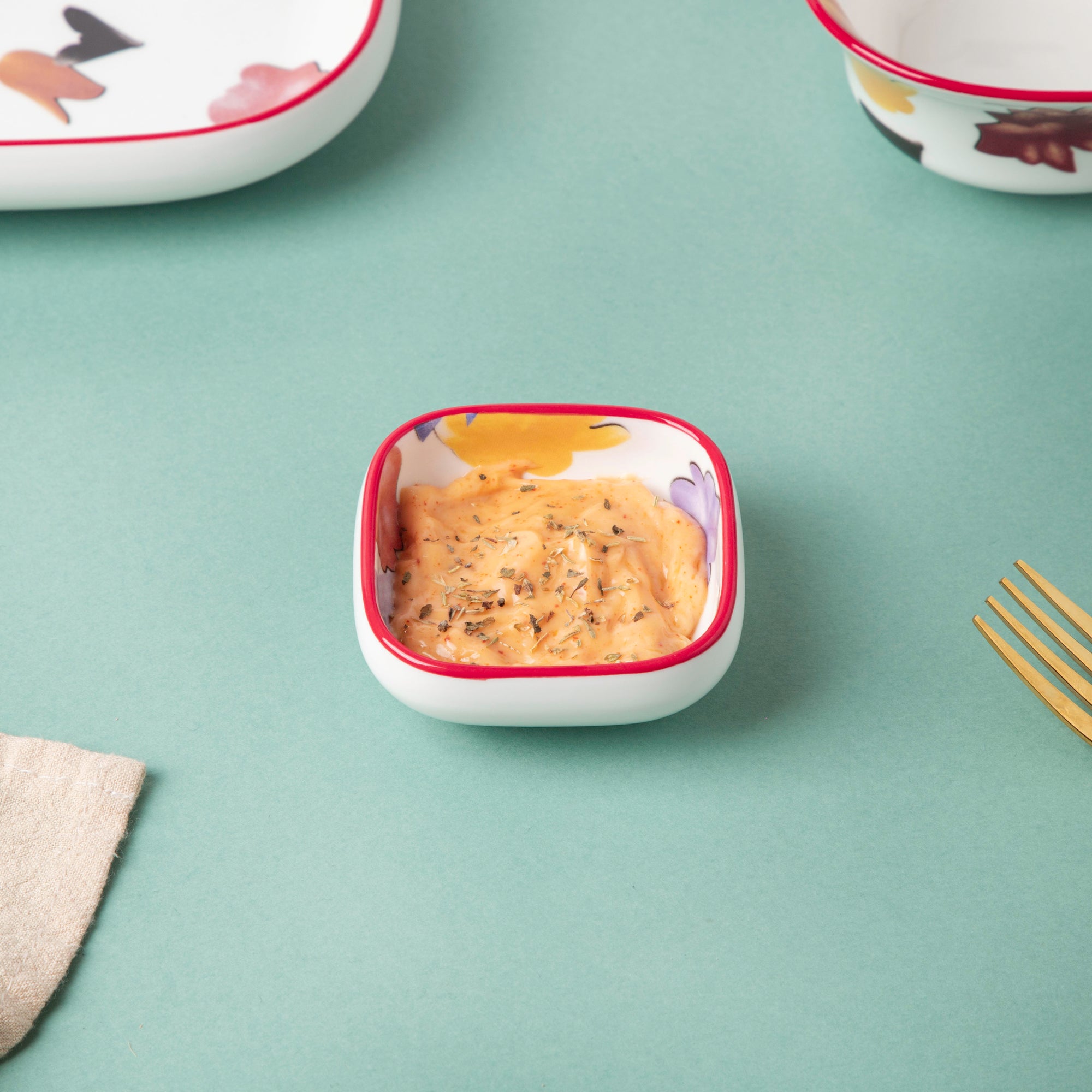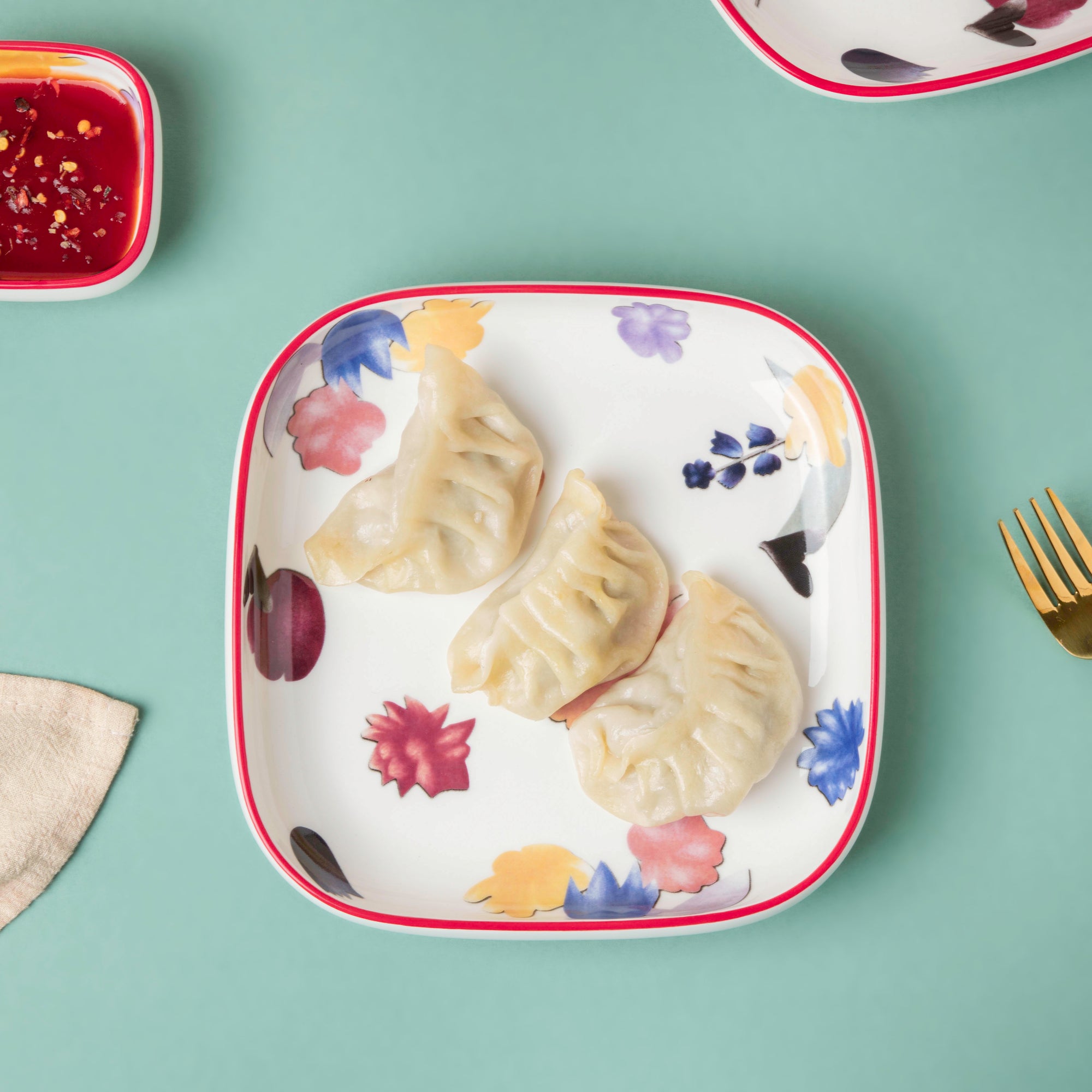 Flowers have always been the center of aromatic freshness and modest gifting. With its eternal attribute to bloom a sparkling smile in an instant, the Florista collection is crafted using high-quality ceramic and prints of blooms. Organize the Florista bowls and plates on the table, much like an arrangement of petals sprinkled for a special occasion. The collection holds 6 dinner plates of 9 inches, 6 snack plates of 7.5 inches, 6 dip dishes, 6 soup bowls, 1 deep dish of 7.5 inches,1 long plate of 10 inches, and 3 serving bowls of 9 inches.