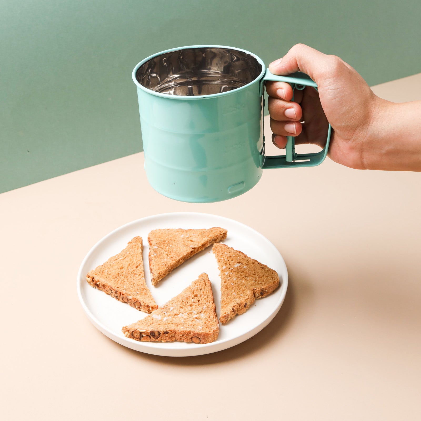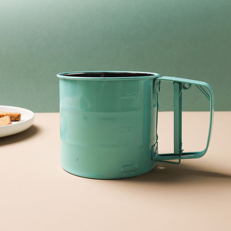 A flour sifter made of metal with an exterior mint colour is apt to sieve dry powder ingredients like flour, powdered sugar, different masala mixes which are dry and and need to be sprinkled into the preparation. The large handle provides great grip and makes the tool really easy to use, and it also makes cooking a really fun activity. It prevents spillage and helps in quickly sifting flour and other ingredients