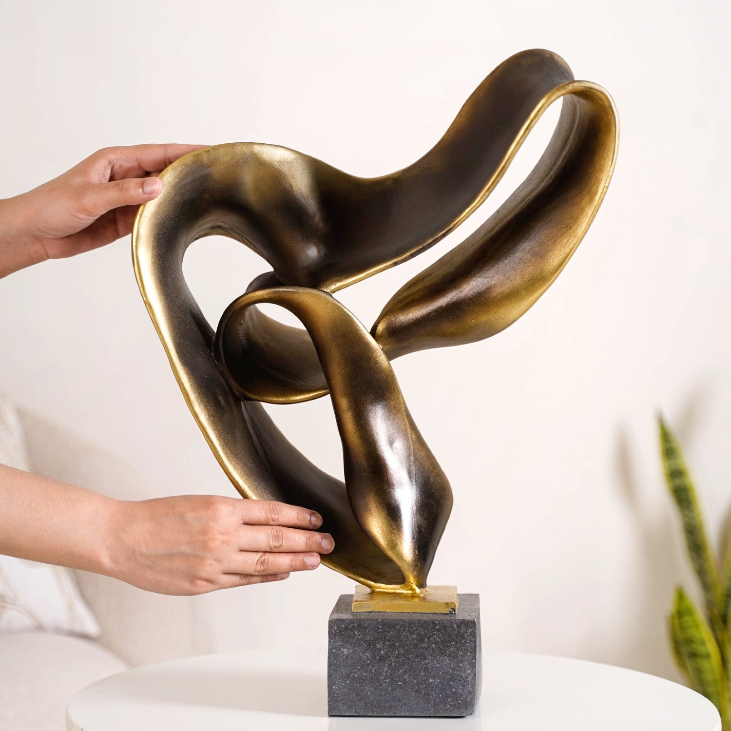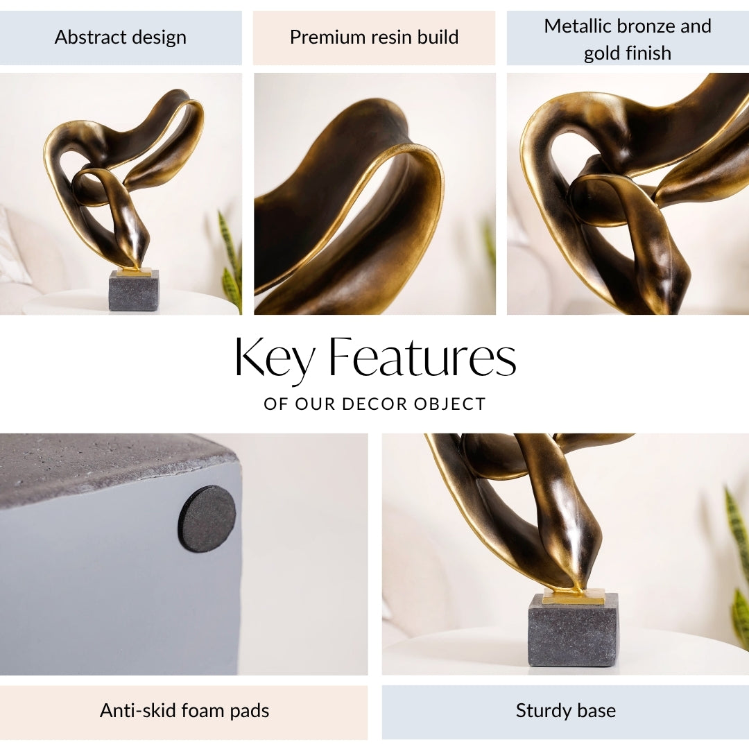 Design: This contemporary resin decor piece features a fluid, ribbon-like structure crafted in metallic tones of deep bronze and gold. Its abstract loops and curves create a sense of motion, with smooth edges highlighted by a subtle golden outline. Mounted on a sturdy square stone-textured base, the sculpture balances artistry and stability. Its sleek yet organic form makes it ideal for modern interiors, from office spaces to stylish living rooms.