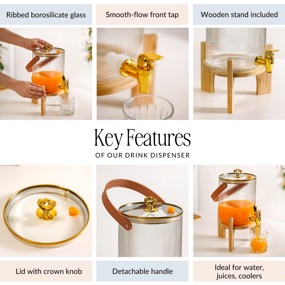 Design: The dispenser features a tall cylindrical body crafted from clear ribbed borosilicate glass that showcases beverages beautifully. A lid topped with a crown-shaped decorative knob adds a refined detail, complemented by a silicone vent that ensures smooth, pressure-free pouring. A sleek tap sits at the base for easy dispensing, while a detachable handle offers optional portability. The wooden stand lifts the dispenser for a balanced, modern, and visually striking presentation.