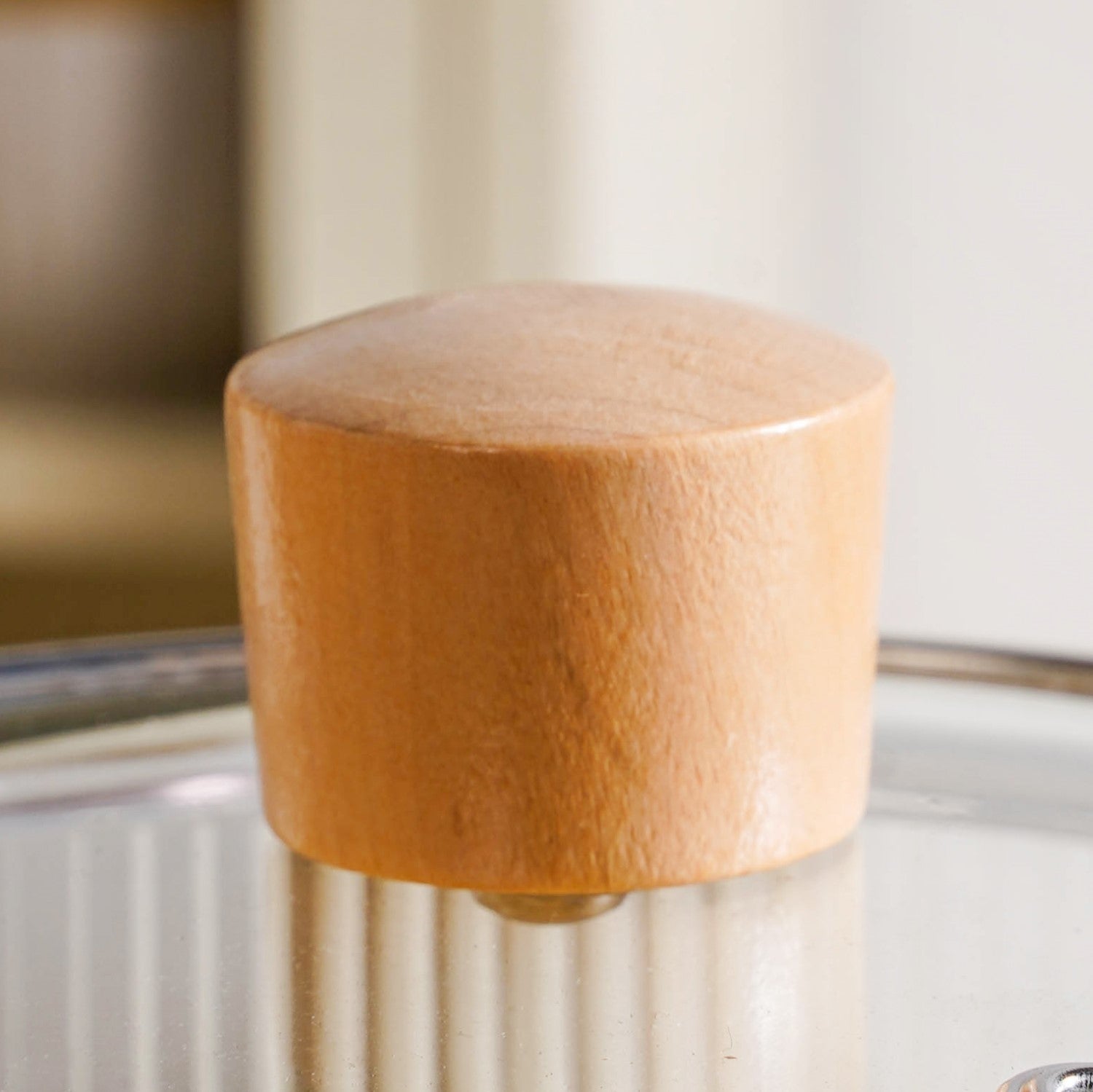 Design: This pot features a shiny borosilicate glass body that allows you to keep an eye on your food while it simmers. The ribbed interior adds texture while adding a sense of rhythmic movement. The two side handles offer a round silhouette, and the slightly domed lid with a smooth wooden knob lends a natural touch to this modern glass form.