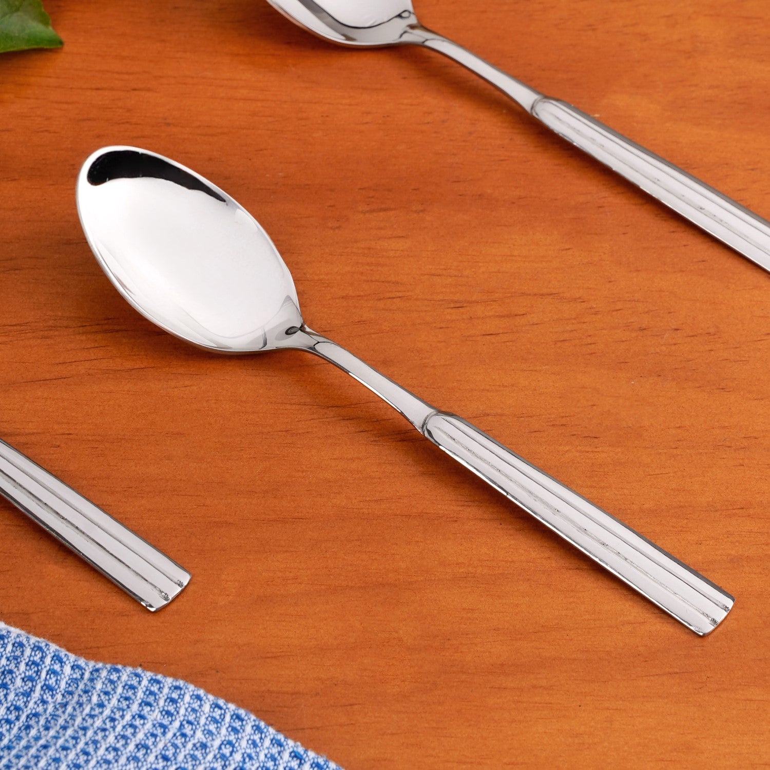 Design: Crafted in lustrous stainless steel, this twelve-piece cutlery set features six spoons and forks with elegant, fluted handles that taper subtly. The design is sleek and modern, with clean vertical grooves adding texture and grip to the handle without compromising on minimalist sophistication. The spoon boasts a rounded bowl with smooth edges, while the fork has sharply defined tines for a precise finish. Highly polished for a mirror-like shine, this set blends contemporary aesthetics with attention to detail.