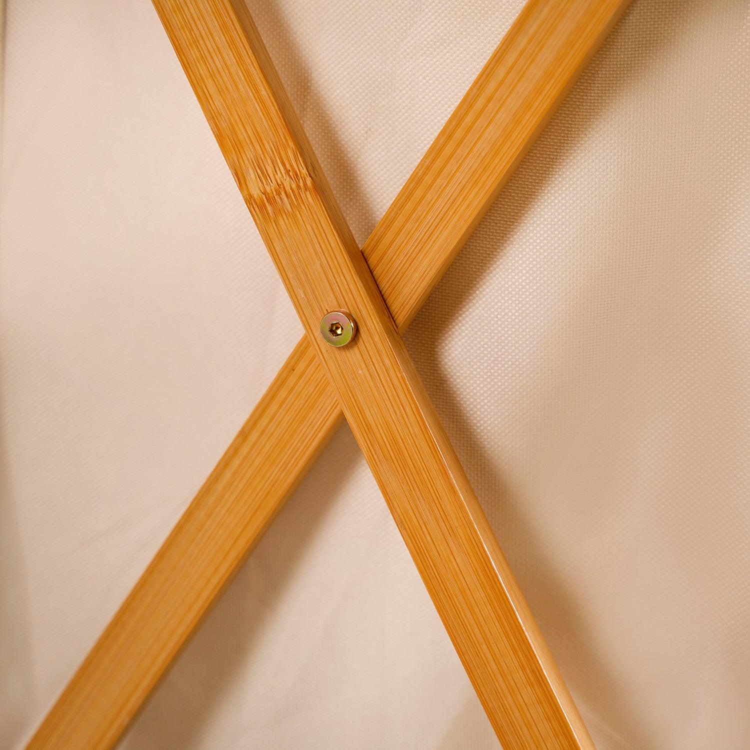 Design: This basket features a foldable X-frame structure made from light brown bamboo wood, celebrated for its strength and natural appeal. The visible wood grain adds a handcrafted finish, making it a beautiful fit for interiors ranging from minimal and modern to rustic and cosy. Suspended within the frame is a soft yet structured light beige nylon basket that complements your space without drawing too much attention. The fold-over flap lid with velcro keeps contents neatly concealed, while soft seams and gently rounded edges bring a sense of warmth and ease to the design.