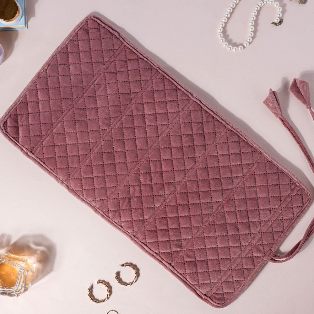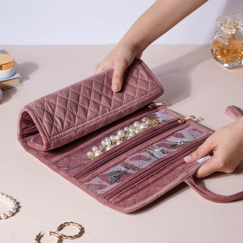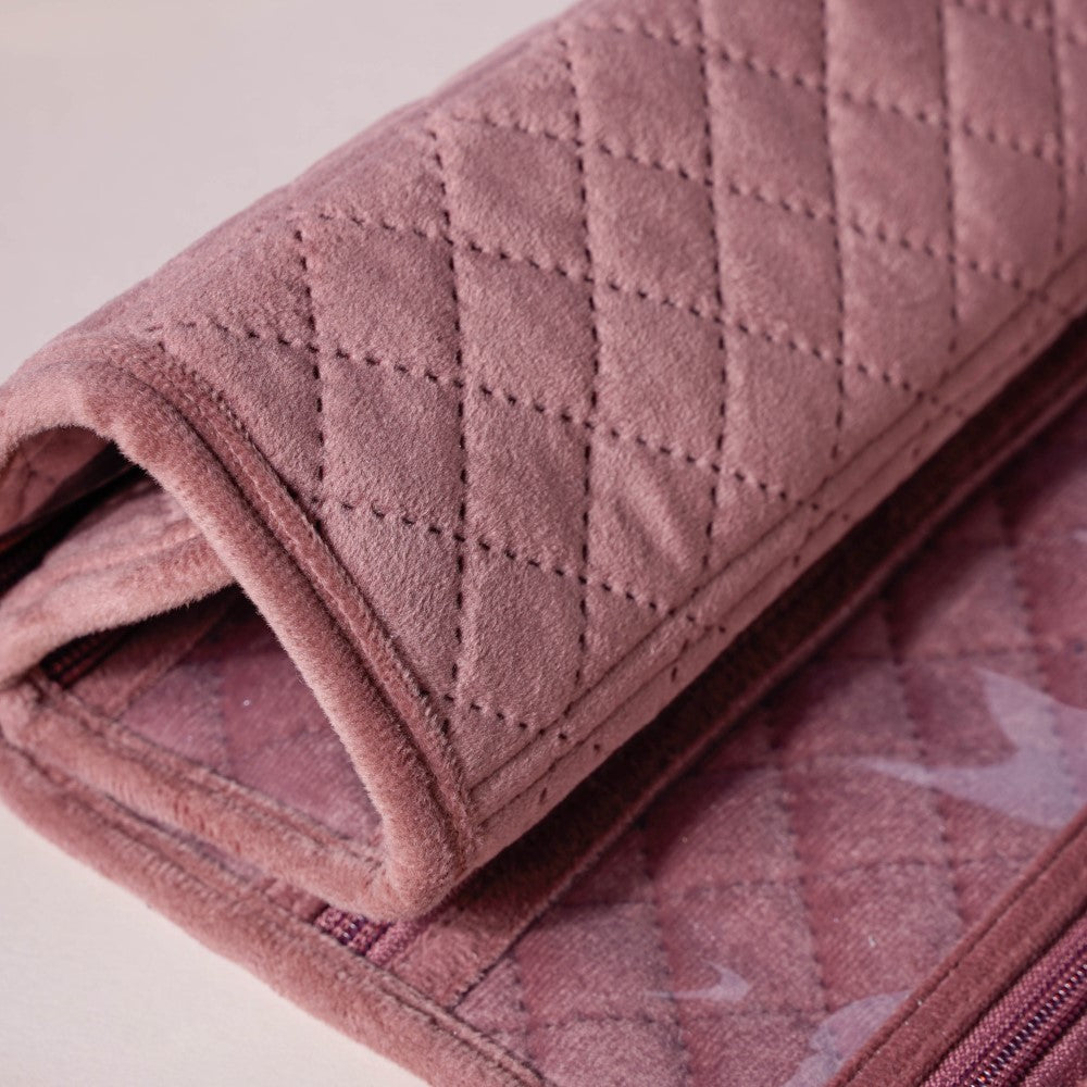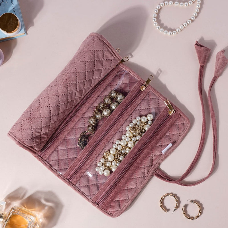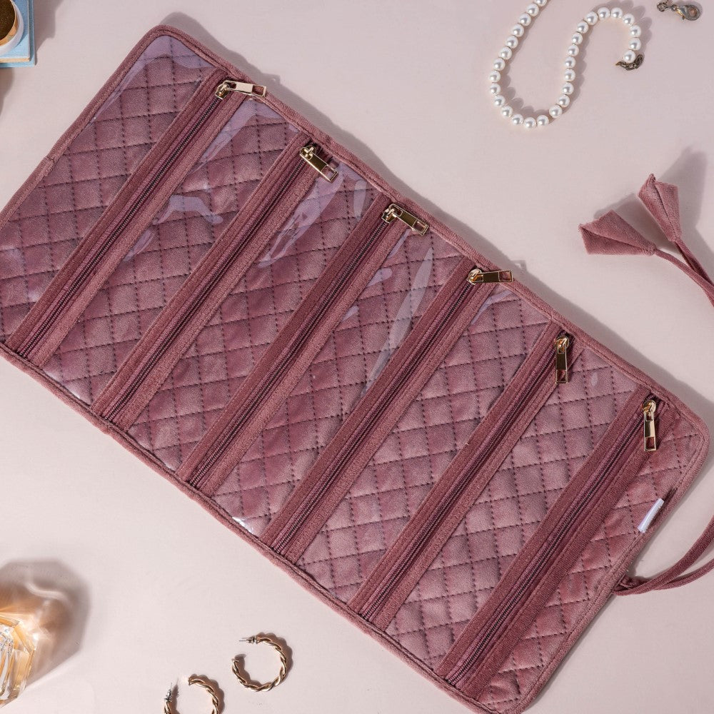 Discover the joy of tangle-free travel with our chic and practical pink foldable jewellery pouch. The quilted jewellery pouch is made from high-quality velvet fabric and has six zipped PVC pockets for organizing your earrings, necklaces, bracelets, and other jewellery pieces.