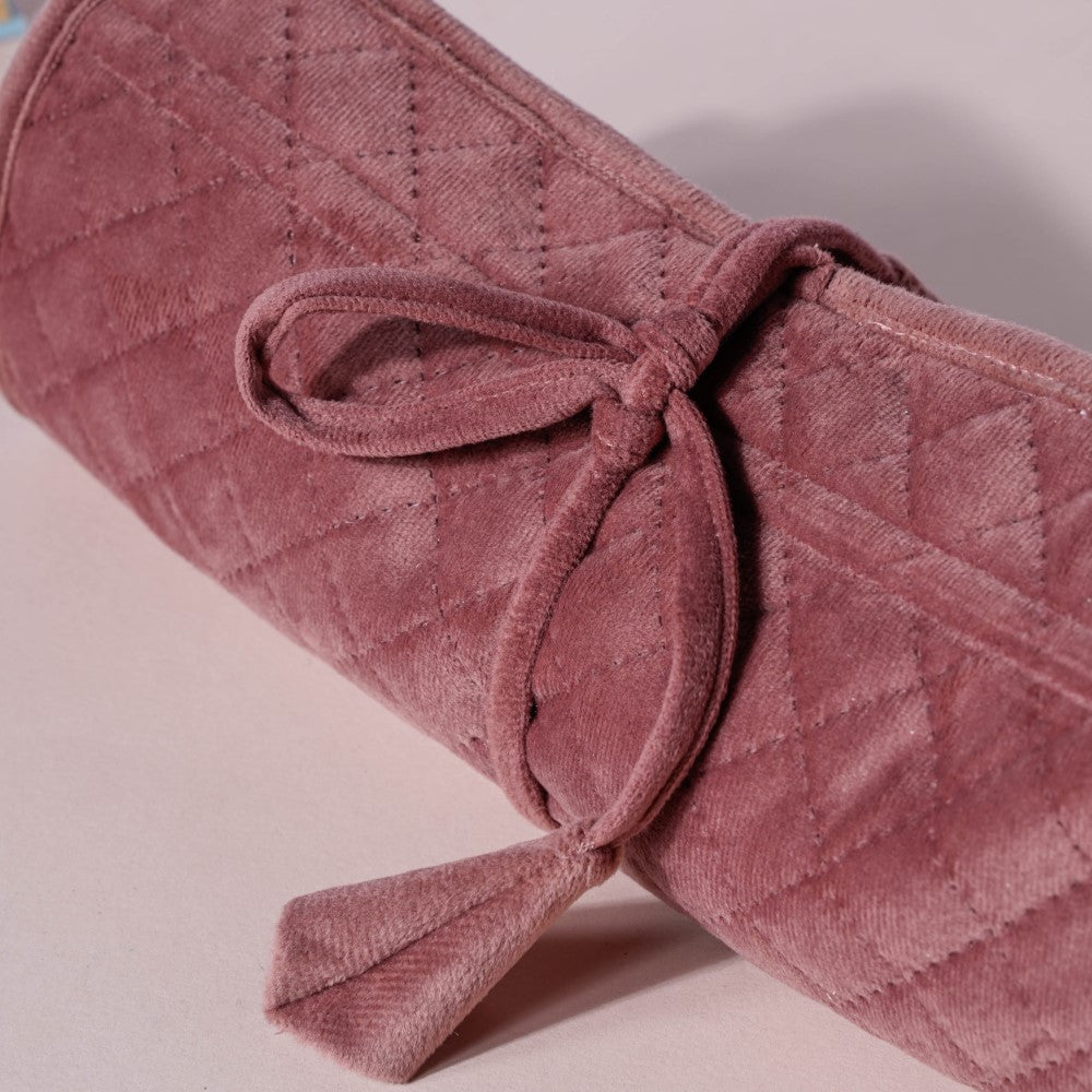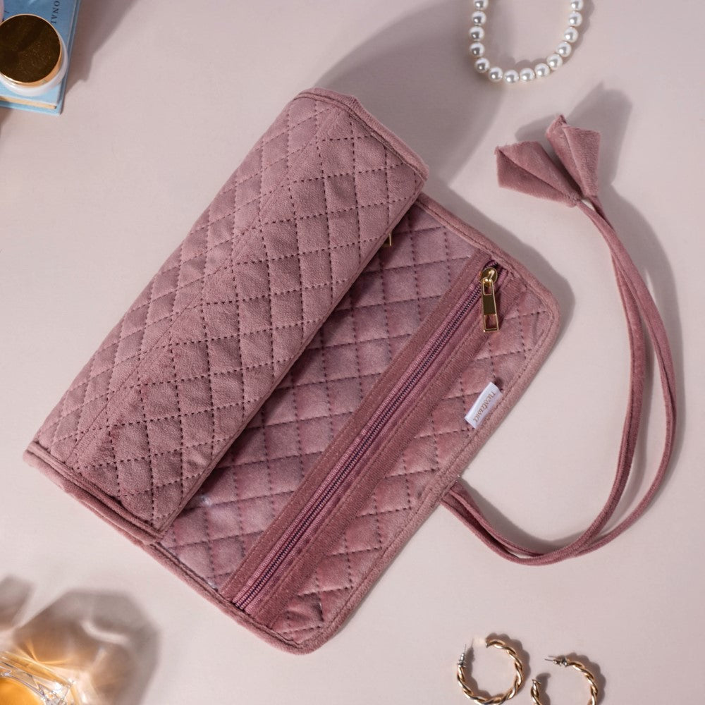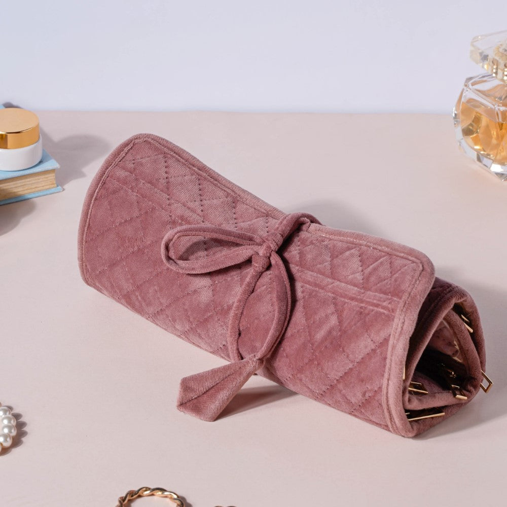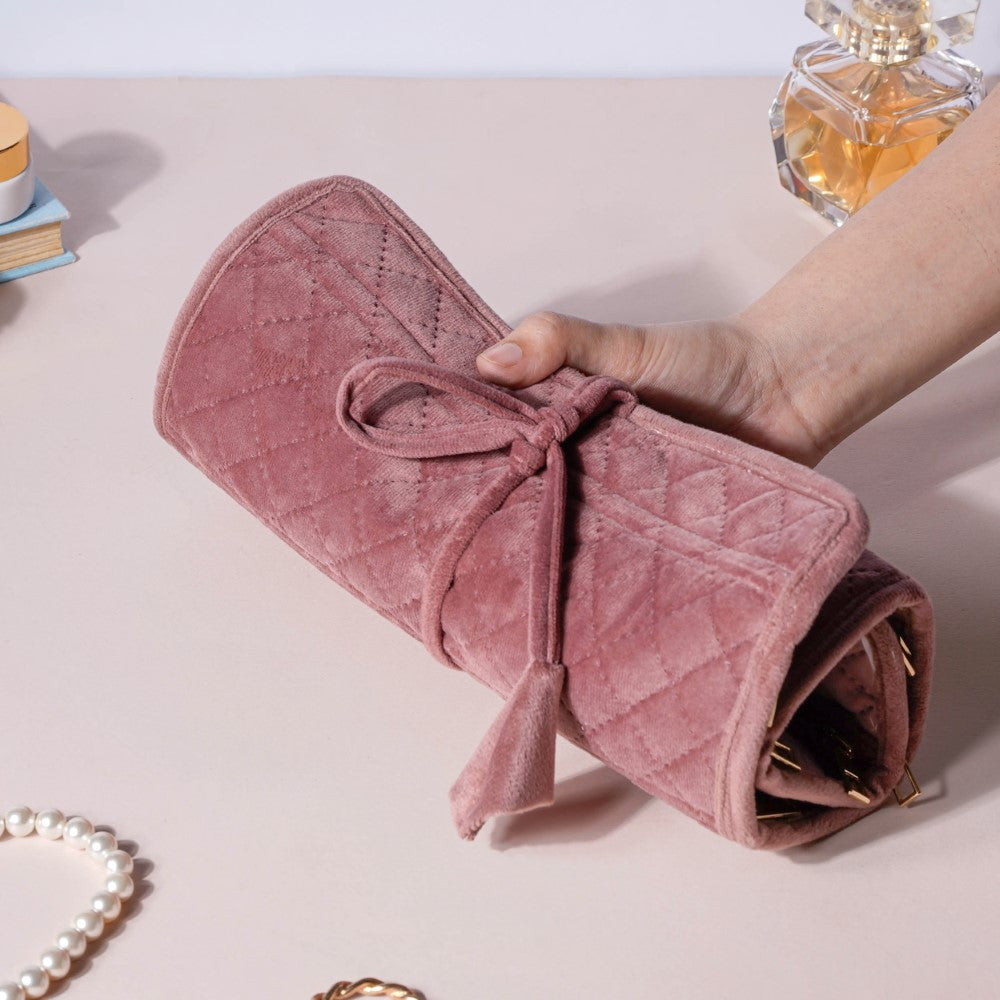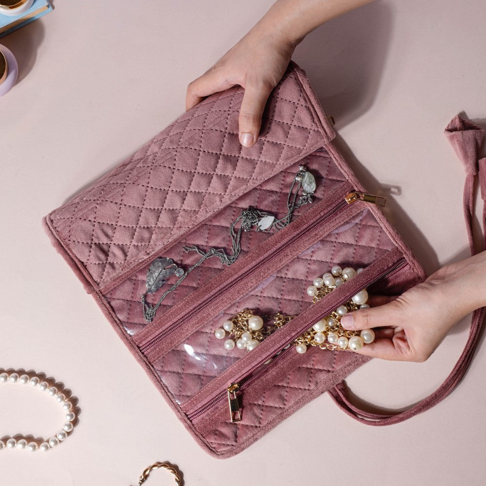 Discover the joy of tangle-free travel with our chic and practical pink foldable jewellery pouch. The quilted jewellery pouch is made from high-quality velvet fabric and has six zipped PVC pockets for organizing your earrings, necklaces, bracelets, and other jewellery pieces.