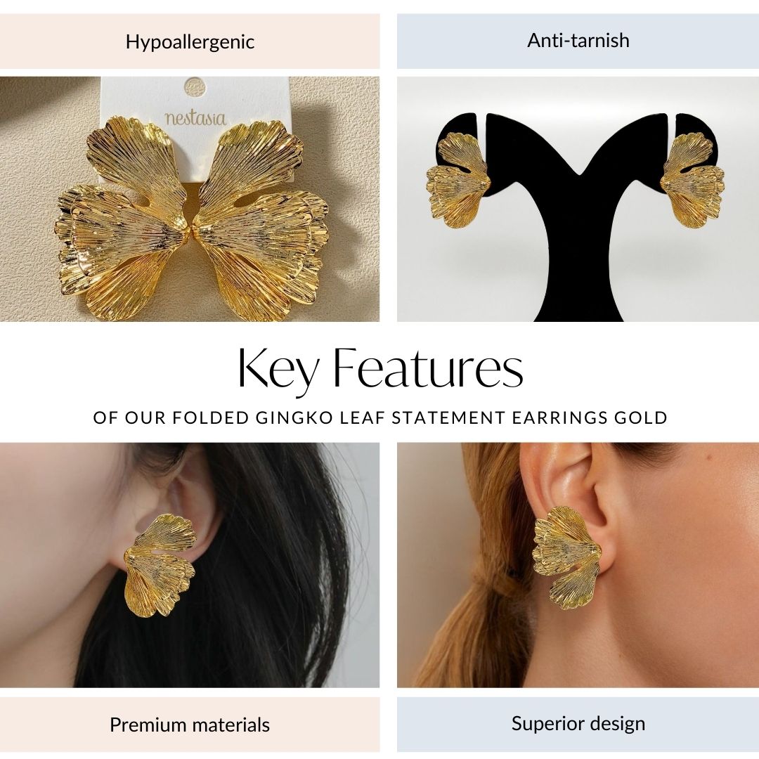 Inspired by the graceful elegance of nature, these gold-toned metal statement earrings showcase a captivating three-dimensional folded Ginkgo leaf design. The intricate folds and delicate curves give the earrings a dynamic, sculptural look, while the rich gold finish adds sophistication. Symbolising resilience and longevity, the Ginkgo leaf inspires both beauty and strength. With their bold yet refined style, these earrings are perfect for making a statement that’s as unique as you are.