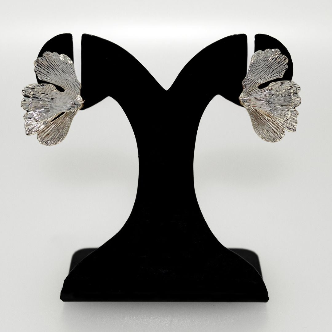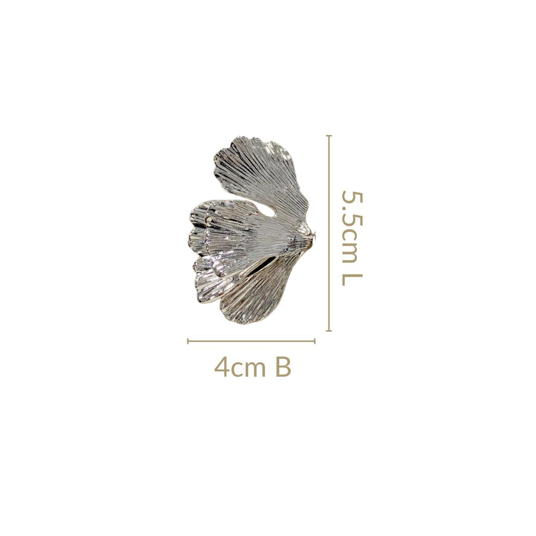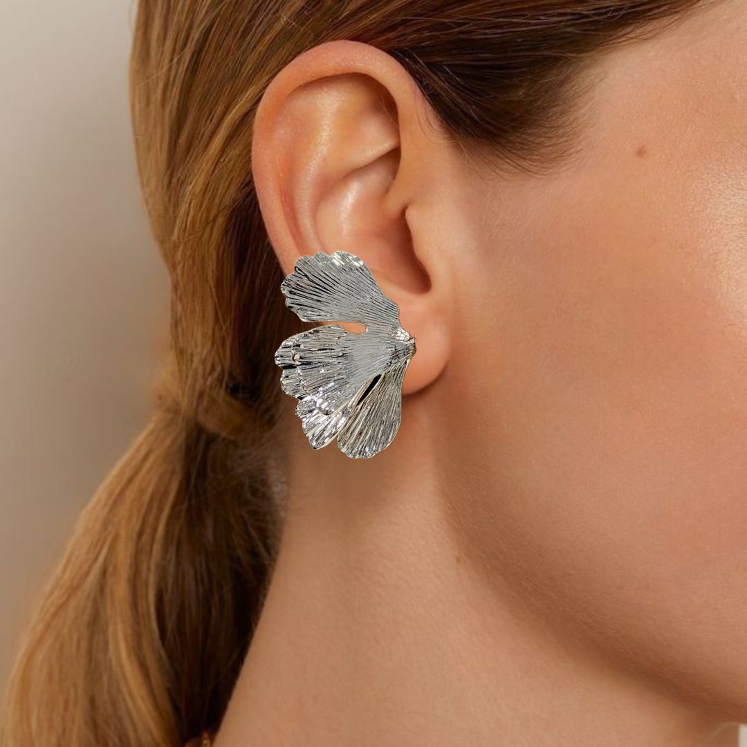 Unfold the beauty of nature with these striking silver-toned statement earrings, designed in the shape of a three-dimensional folded Ginkgo leaf. The sculptural design captures the delicate veins and elegant folds of the Ginkgo, symbolising resilience and longevity. Crafted from high-quality metal, these earrings offer a modern, artistic flair that effortlessly enhances any outfit. Inspired by the enduring Ginkgo tree, they are a tribute to timeless beauty and strength. Perfect for adding a bold, nature-inspired statement to your look, these earrings are an essential accessory for any occasion.