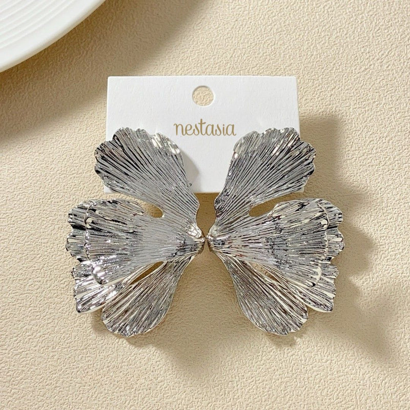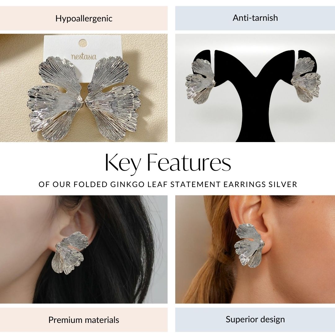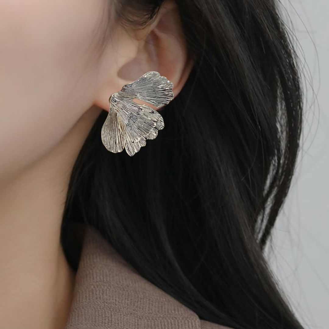 Unfold the beauty of nature with these striking silver-toned statement earrings, designed in the shape of a three-dimensional folded Ginkgo leaf. The sculptural design captures the delicate veins and elegant folds of the Ginkgo, symbolising resilience and longevity. Crafted from high-quality metal, these earrings offer a modern, artistic flair that effortlessly enhances any outfit. Inspired by the enduring Ginkgo tree, they are a tribute to timeless beauty and strength. Perfect for adding a bold, nature-inspired statement to your look, these earrings are an essential accessory for any occasion.