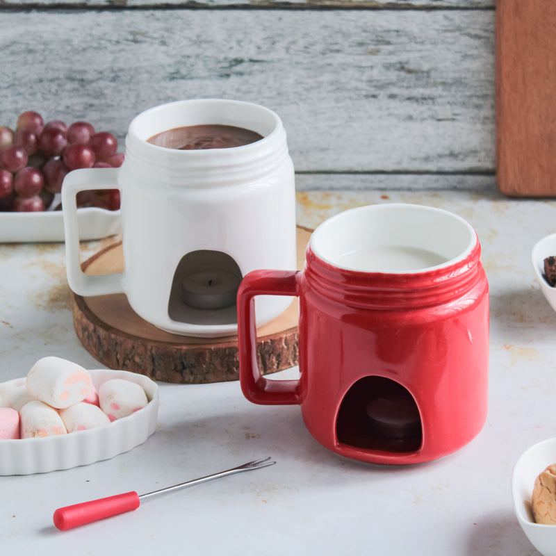 Fondue set that is in the shape of a cup or a mug is a quirky set to have. The chocolate fondue set comes as a cup that has a fondue burner with a tea light candle, a skewer stick and a handle to lift and place the ceramic fondue set. The cheese fondue set is perfect for an individual serving that can make for an exciting fondue serving at home, while hosting guests. Pair the fondue set with plates to serve bread croutons, veggies, fruits or marshmallows.