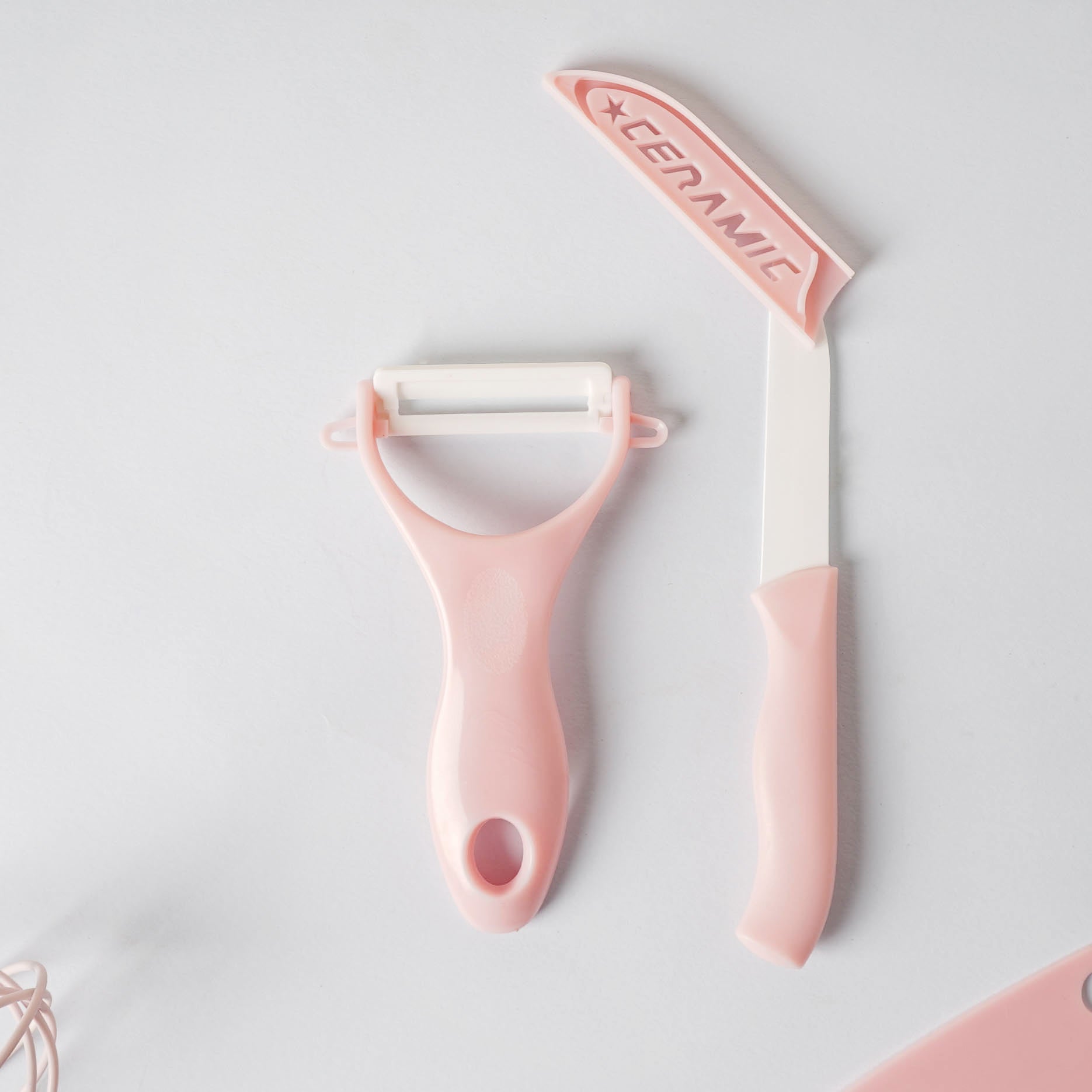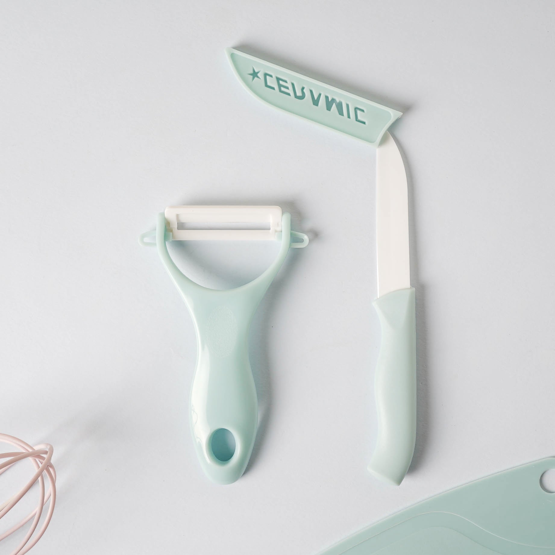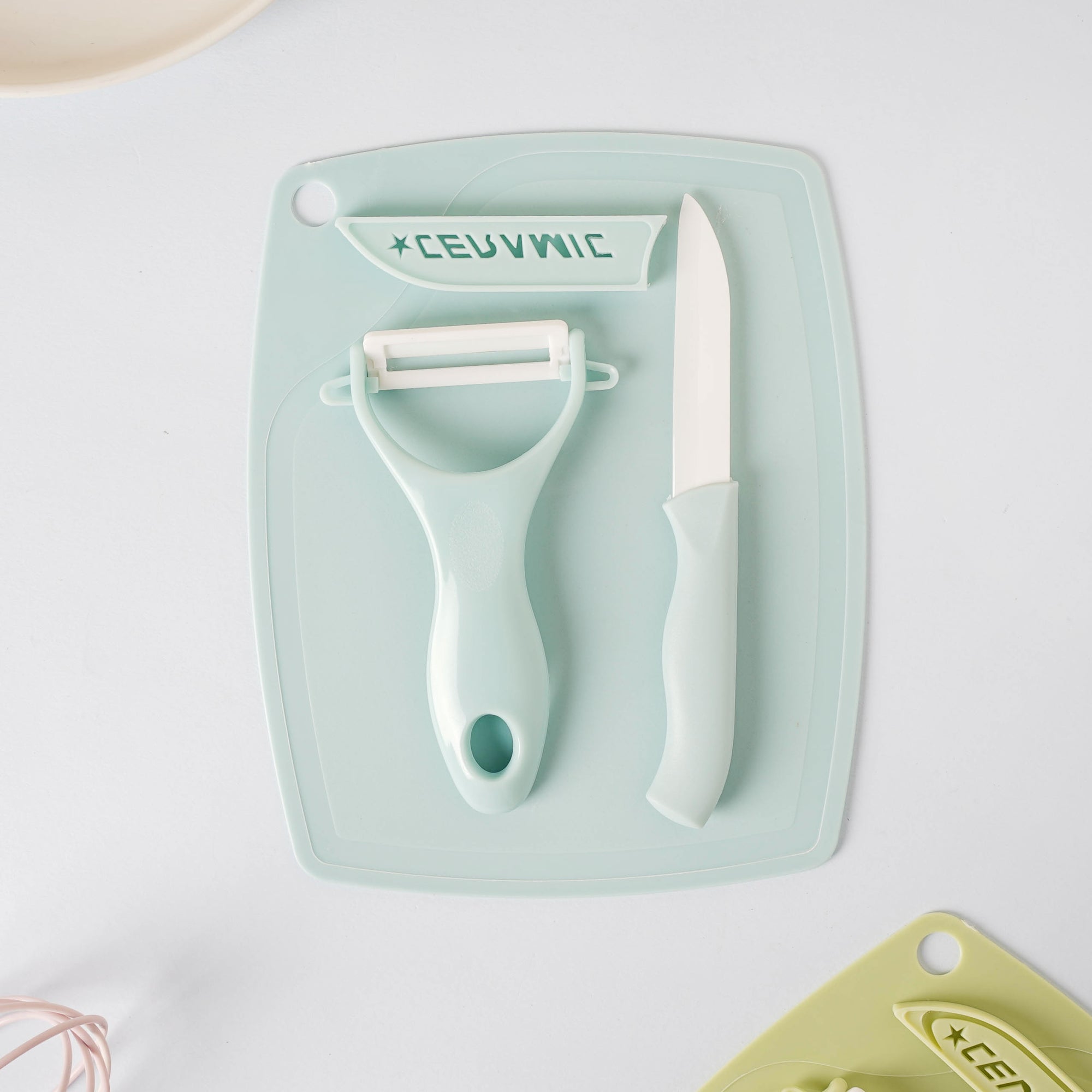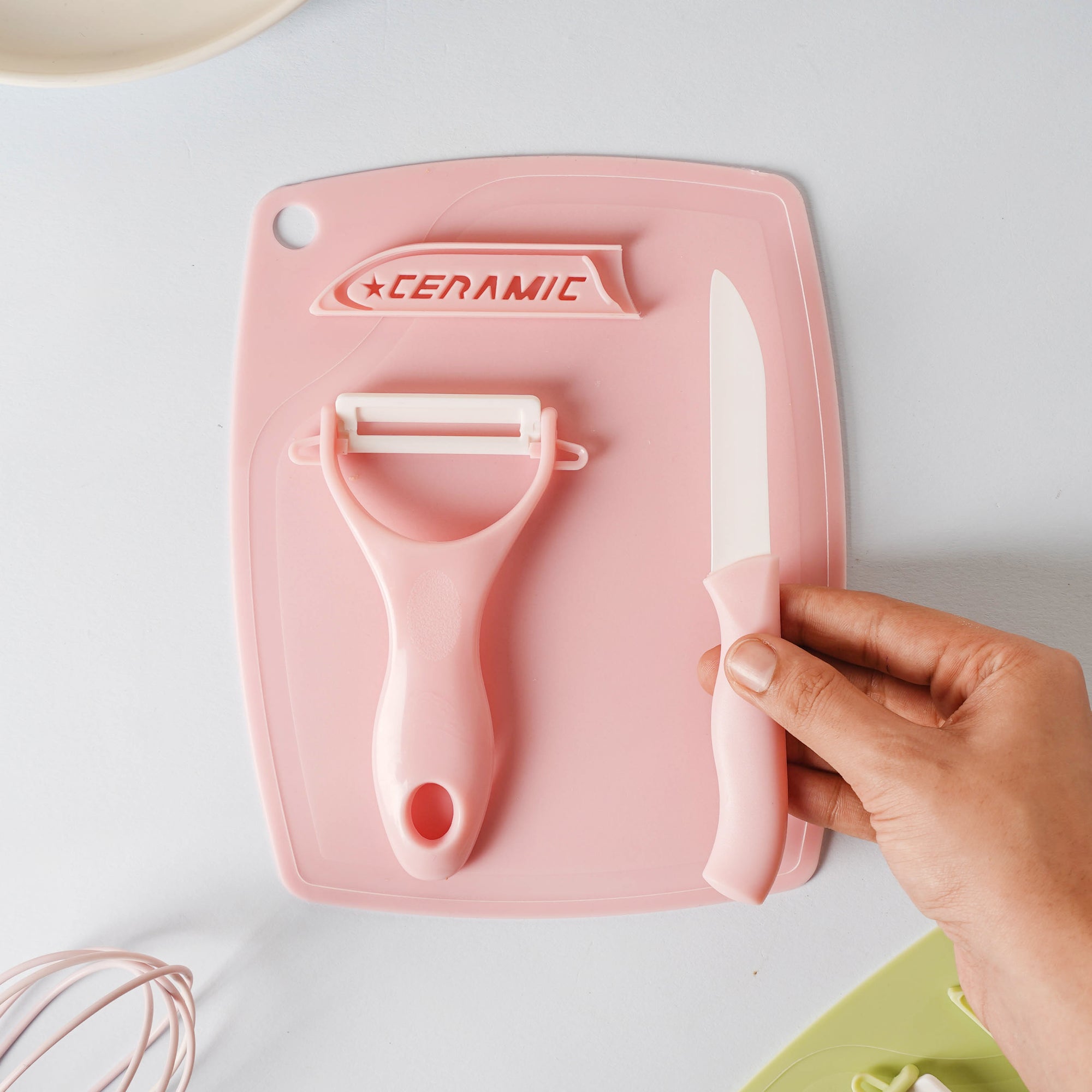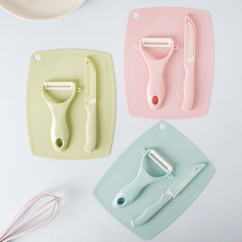The food cutter set contains a knife, a peeler and a chopping board, and it comes in three different colour variants in pastel shades. The food cutter set is a must-have for any well organised kitchen.