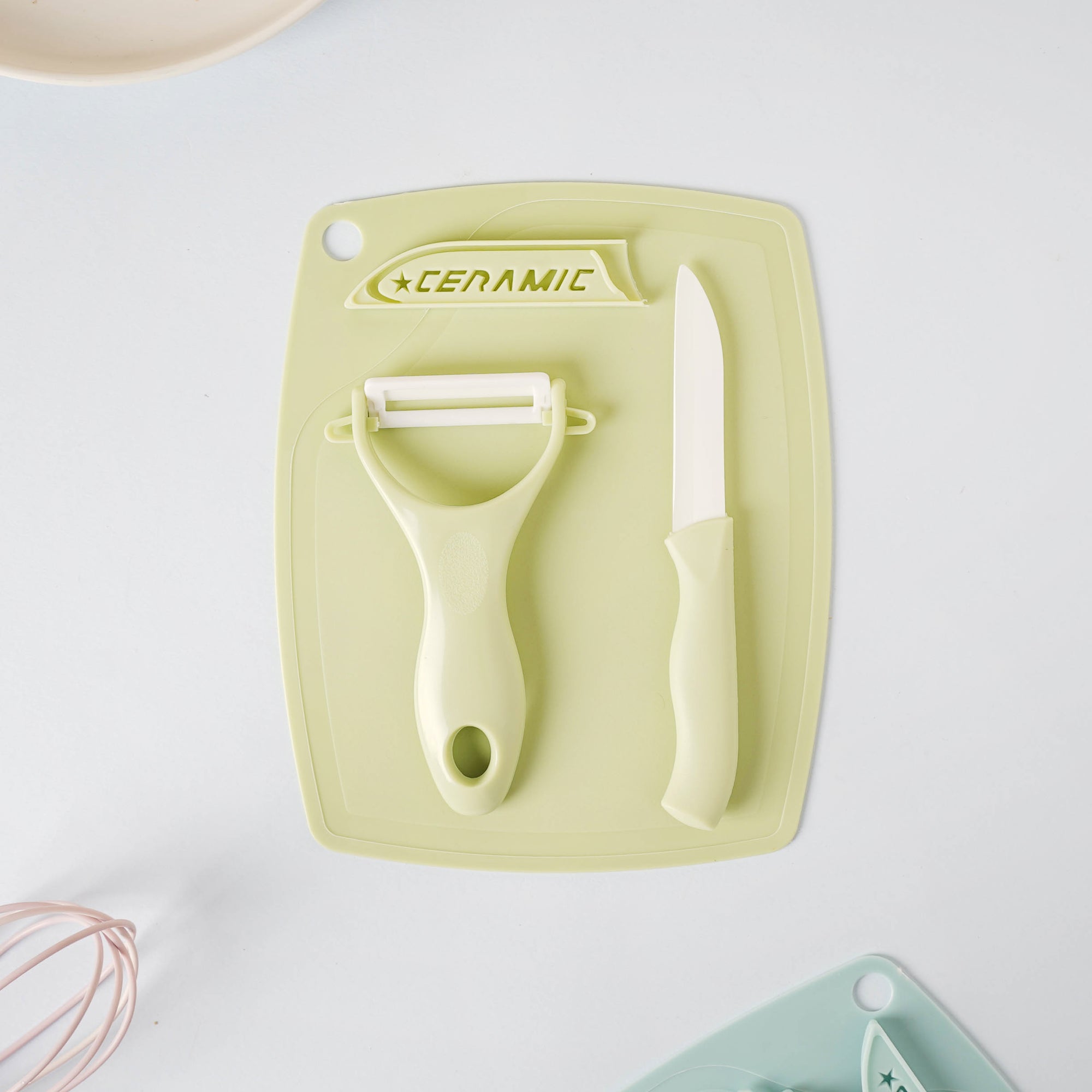 Size: Knife - 16. 5 cm x 2 cm Peeler - 13 cm x 8 cm Board - 20 cm x 13 cm x 8 cm