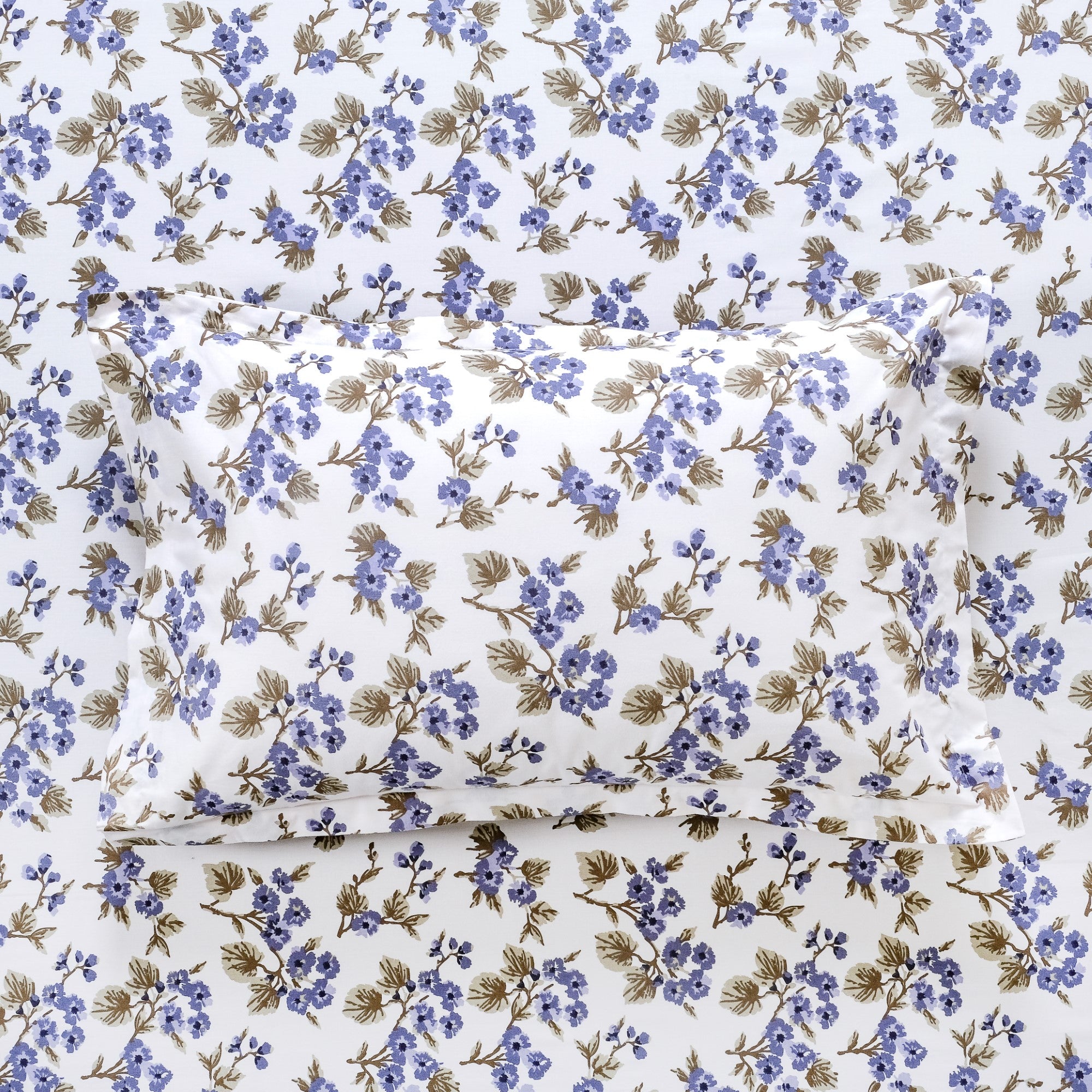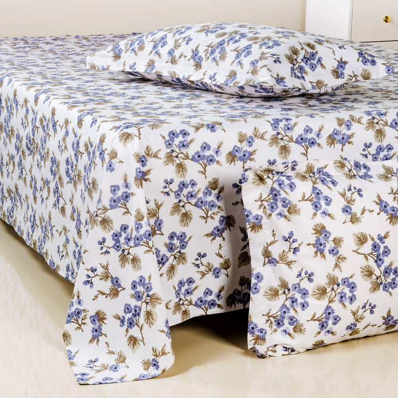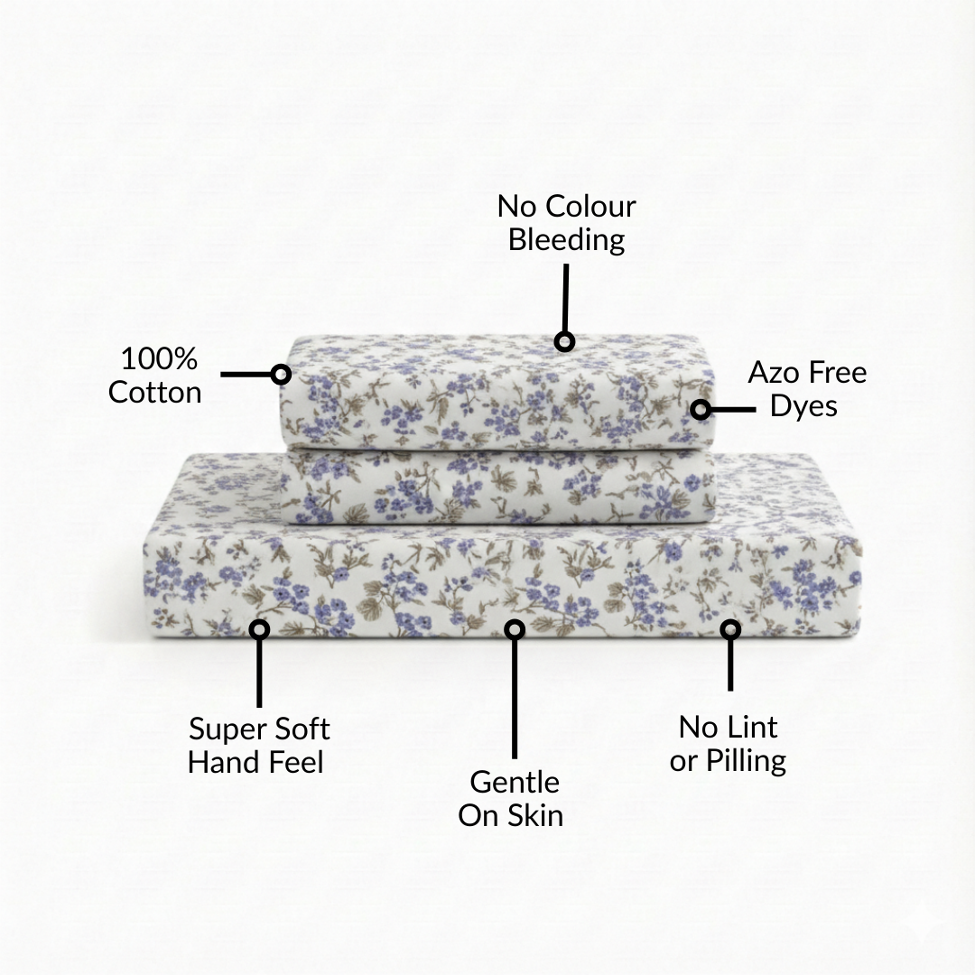 Design: This bedding set features an elegant botanical print of delicate floral sprigs set against a clean white background. The pattern showcases clusters of soft cornflower and periwinkle blue blossoms, beautifully balanced with muted sage-green leaves and slender branching stems. The print is consistent in the king-size bedsheet and matching pillowcases.