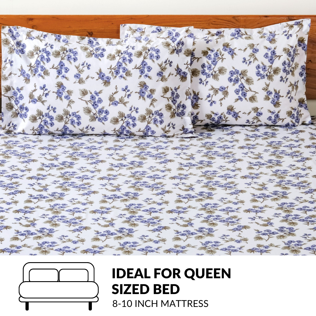 Design: Features a botanical print of delicate sprigs, this bedding set has a clean white background. The pattern showcases clusters of soft cornflower and periwinkle blue blossoms balanced with muted sage-green leaves and slender branching stems. The print is consistent in the queen-size bedsheet and matching pillowcases, making it a beautiful addition to any room.