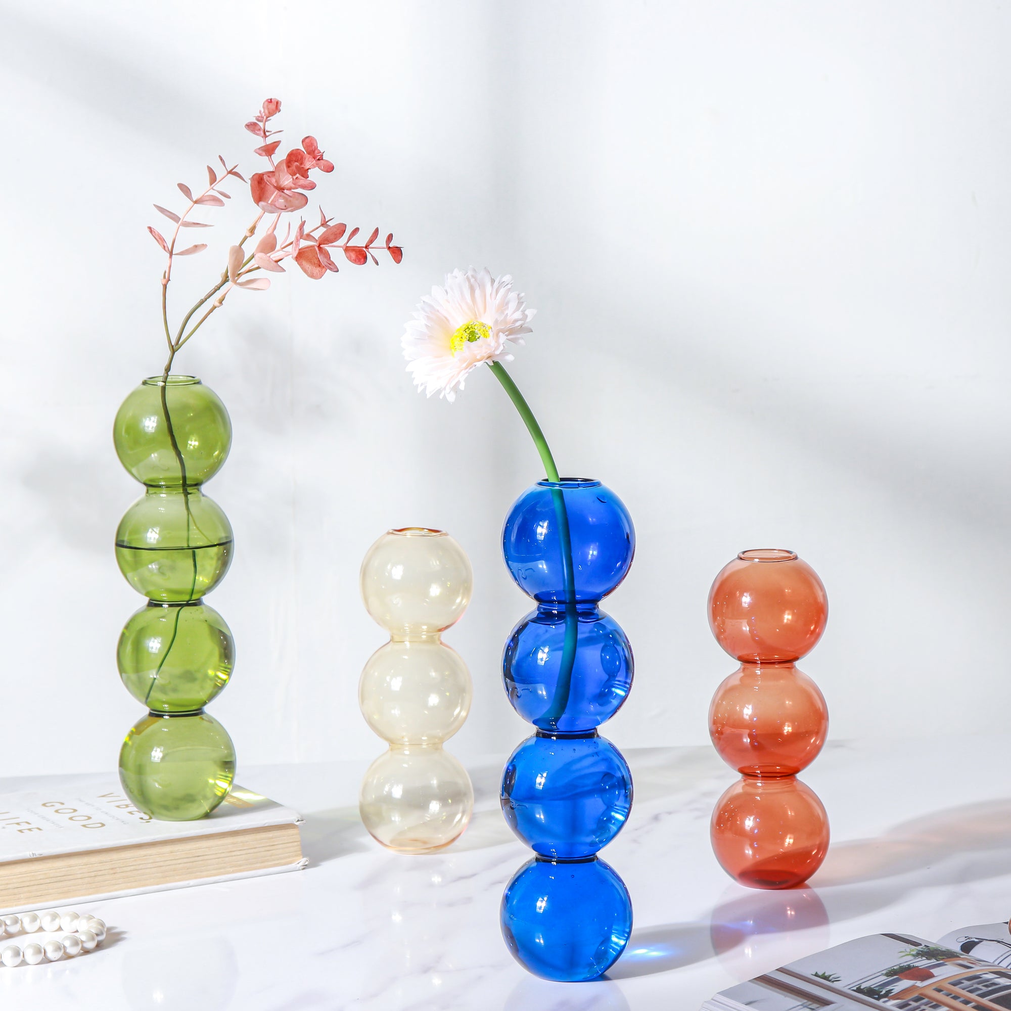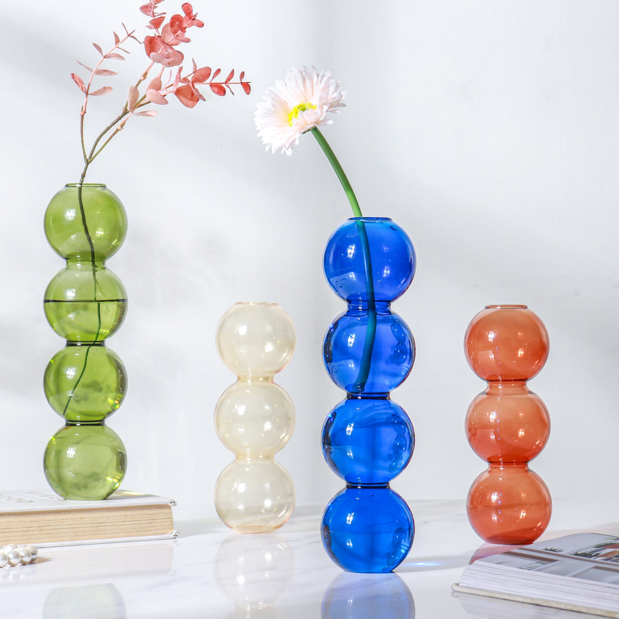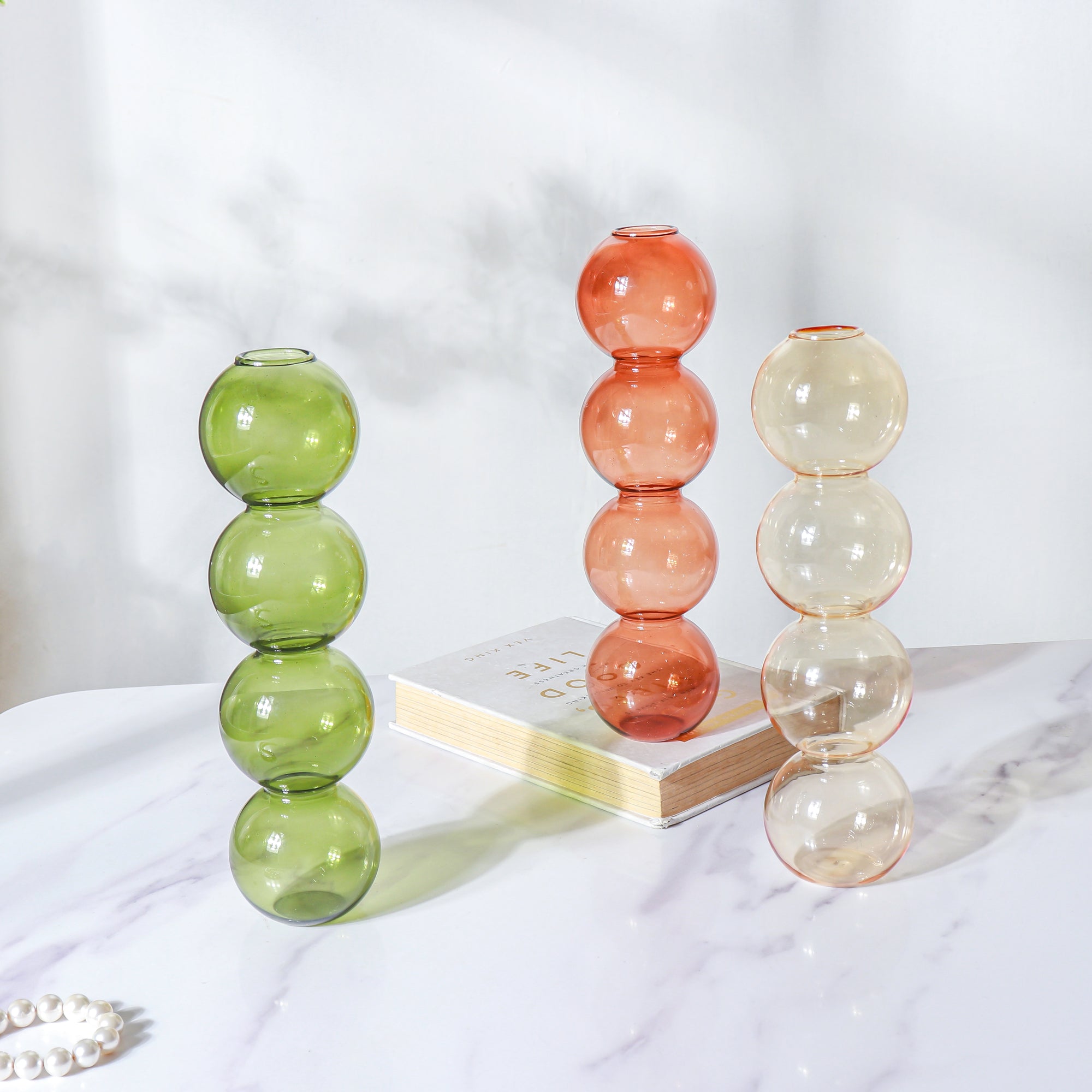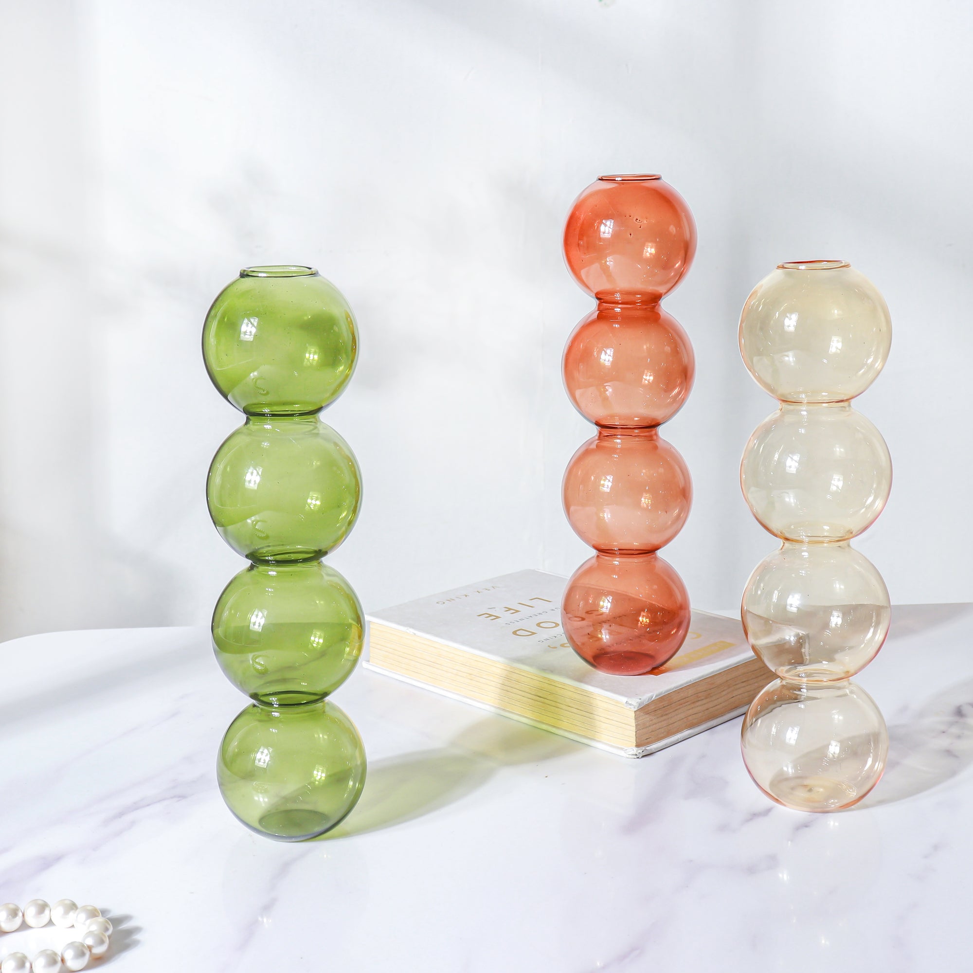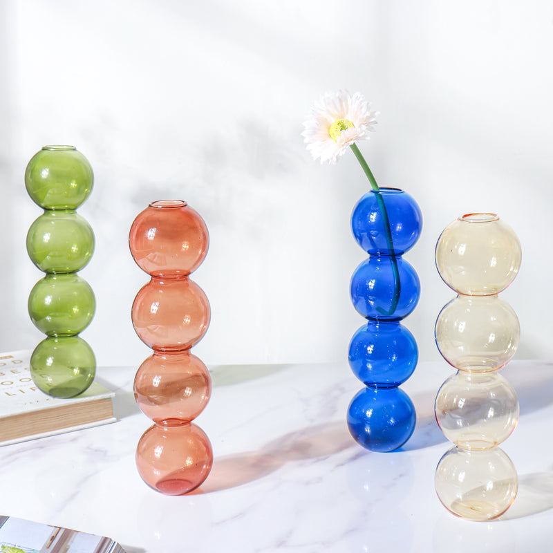 The round glass vase is created exclusively to amp the decor game. The vase's simple design allows it to blend in with any color scheme and complement any décor. It is made up of four colored glass rings that are stacked on top of one other to make a sculptural glass vase.
