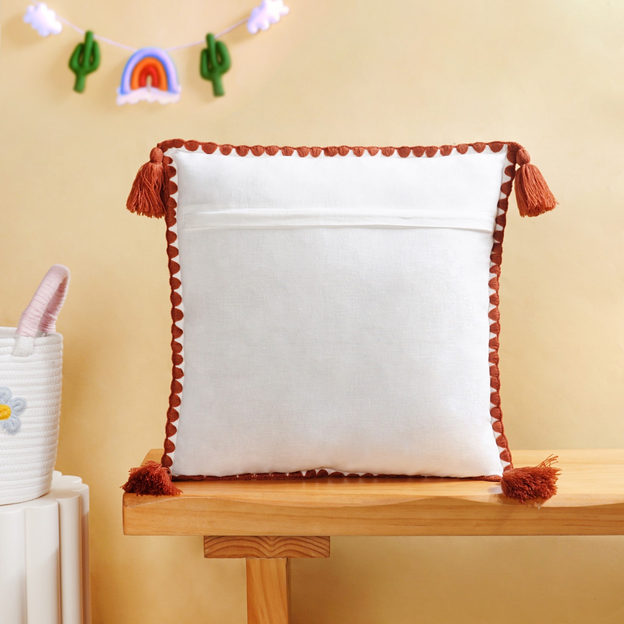 Design: Soft, breathable cotton in a square shape fits easily on beds, chairs, or reading corners. A detailed fox face sits at the centre, framed by a sturdy embroidered border and rustic brown tassels on every corner. Warm cream and burnt orange tones complement each other flawlessly. A slight post-wash shrink will result in a snug, lived-in feel. A light press with an iron will guide the fabric back to its original shape.