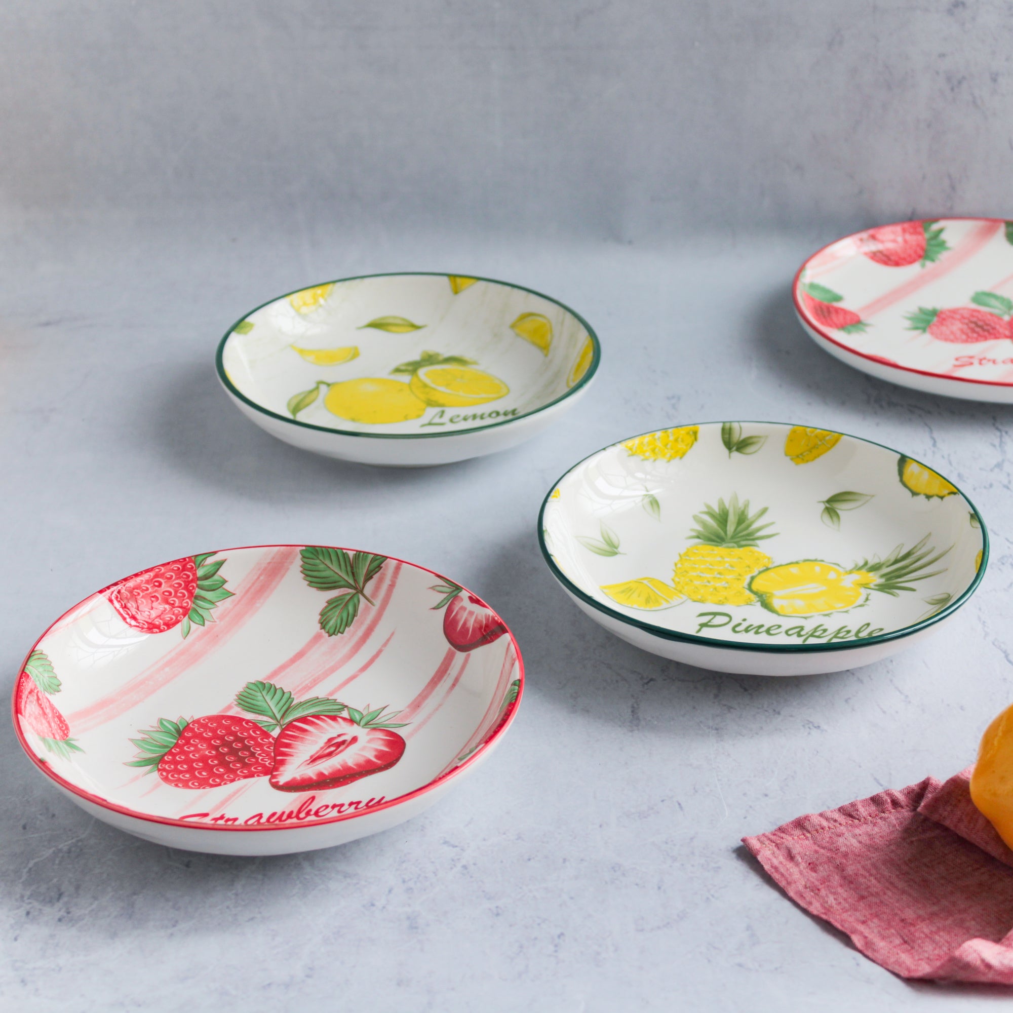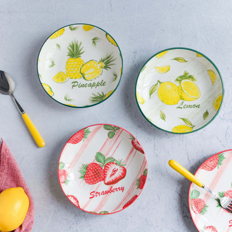 Ceramic dessert plates used for serving cakes, tarts, cookies and waffles at the end of a meal. The unique feature of the deep plates are the striking fresh fruit designs printed on the inner surface of the glossy white plates. One can easily use the ceramic deep plates for serving fresh fruits, pasta, lasagna or any dish with slight gravy. Ranging between bright green and red strawberry prints and warm yellow toned pineapple prints, the round plates are available in variations, and add a splash of fruity fun to any crockery collection.