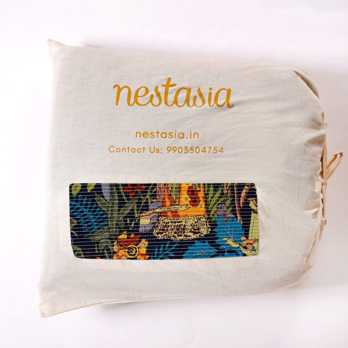 Design: Set against a dark blue backdrop, this bedcover features Frida Kahlo-inspired prints surrounded by vivid leaves, blooming flowers, and mysterious trees. The striking prints painted with popping hues bring a sense of storytelling to the bedcover. The artistic quilted pattern adds depth while enhancing the overall comfort level of the piece. It is expertly stitched with white threads for a tailored look. All in all, this iconic bedcover looks charming and is highly functional.