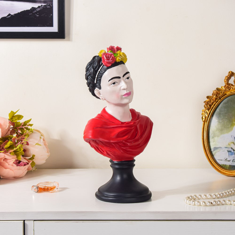 The resin sculpture on a pedestal exhibits the Mexican artist, Frida Kahlo. Known for her portraits, self-portraits, and a blend of vibrant colours in them, she is one of the most popular feminists of her time. The artful showpiece is a tribute to Frida Kahlo's art and her undying spirit to hold onto what's the most treasured to her- her expression through portraits. Bring home a token of art revolution that's named 'Frida', molded in fine quality resin and carefully crafted by skilled artisans. The resin showpiece with a pedestal can be an excellent choice for living room decor, bedroom decor, table decor, or can be kept near the entrance.