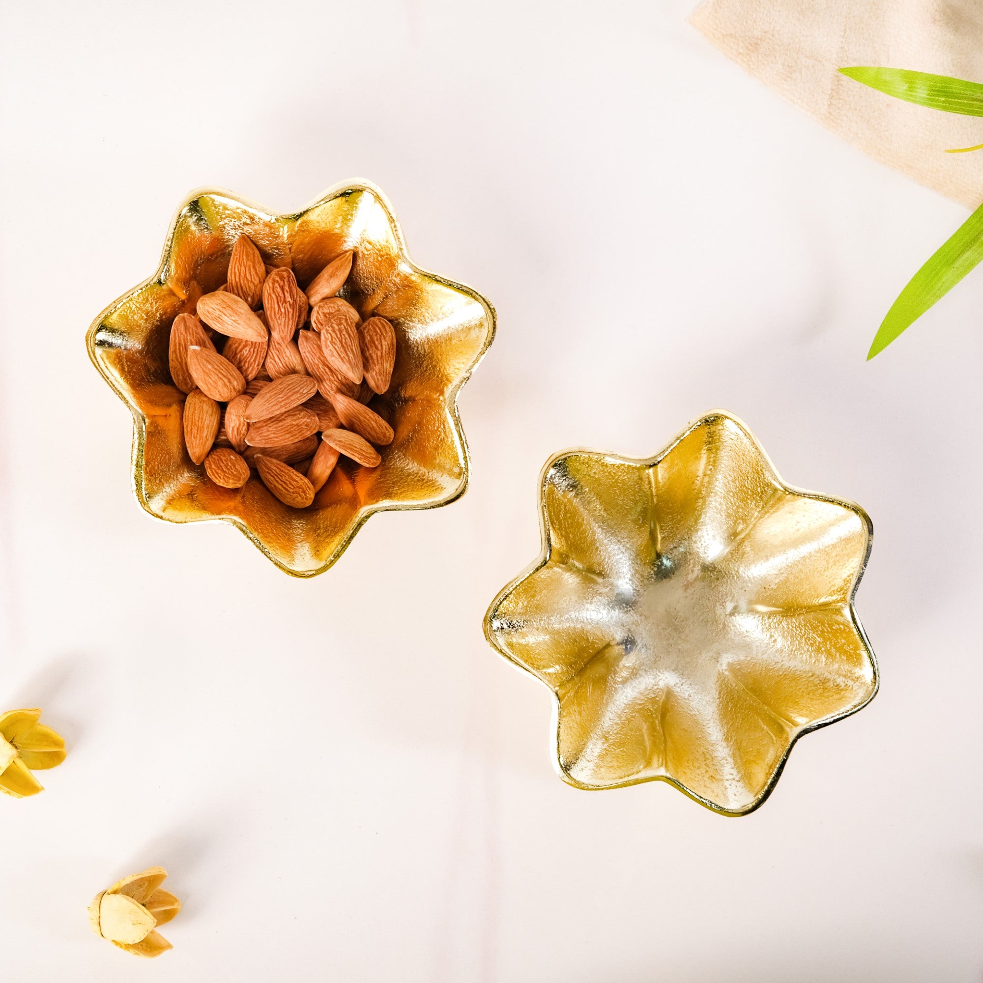 Design: This set of jewellery display bowls is designed in a unique floral silhouette with eight gently curved petals. Made from durable metal with a warm, golden finish, this set combines timeless charm with modern sophistication. The subtly hammered texture on the interior enhances its artisanal appeal, catching the light beautifully without being overly reflective. Perfectly sized for storing jewellery, keys, or other small essentials, it brings both function and style to vanities, entryways, or tabletops. A refined accent for any decor.
