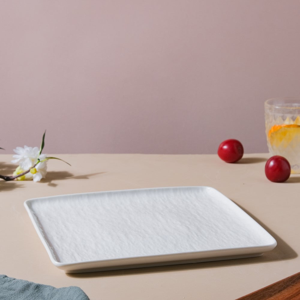 The square ceramic dinner plate is a classic addition to any dinner setting. The textured surface of the plate adds exquisiteness to the simple white plate. Constructed of sturdy ceramic, the plate will last for years with proper maintenance. The square dinner plate is ideal for serving main course meals like pasta, sushi, rice or snacks like pretzels, crackers, rice cakes, fluffy dhoklas, or the classic dry fruits.