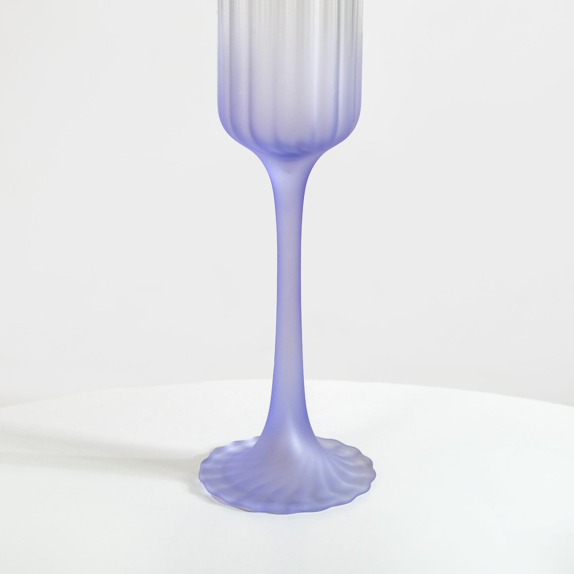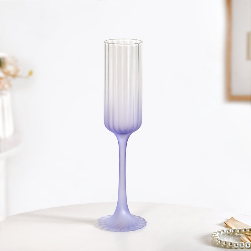 Design: This champagne glass features a frosted base that gradually shifts into a soft purple ombre before fading into a clear upper section. Its elongated flute and slim, refined stem create a modern, romantic silhouette. The smooth colour transition gives the glass a luminous, visually striking appearance.