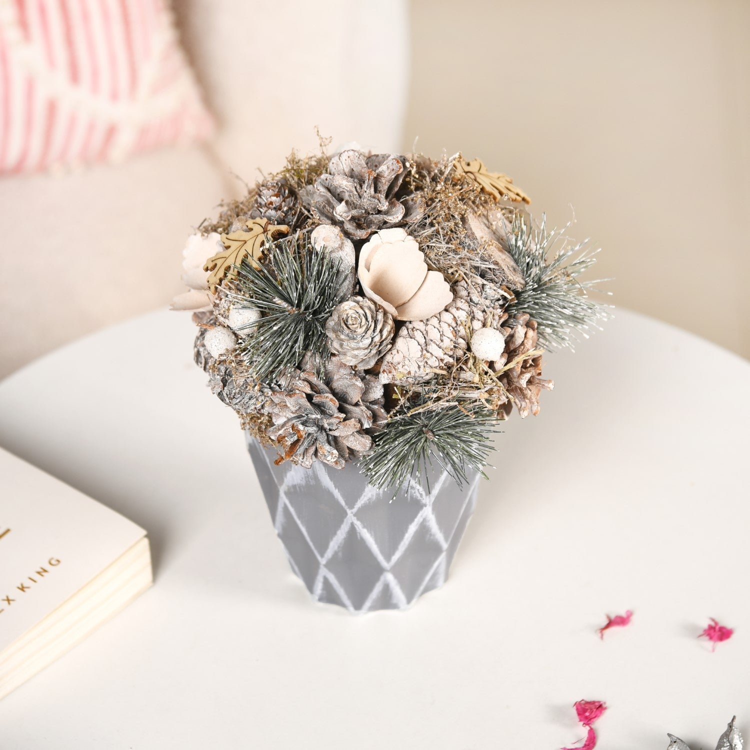 Design: The flower pot features an elegant textured diamond pattern, giving it a sophisticated look that complements any Christmas display. It is adorned with dried pine cones, faux pine leaves in white, and small white balls, creating a wintery, woodland-inspired aesthetic. Wooden leaf decorations and decorative wooden flowers in white add a rustic charm to the overall arrangement, enhancing the seasonal appeal.