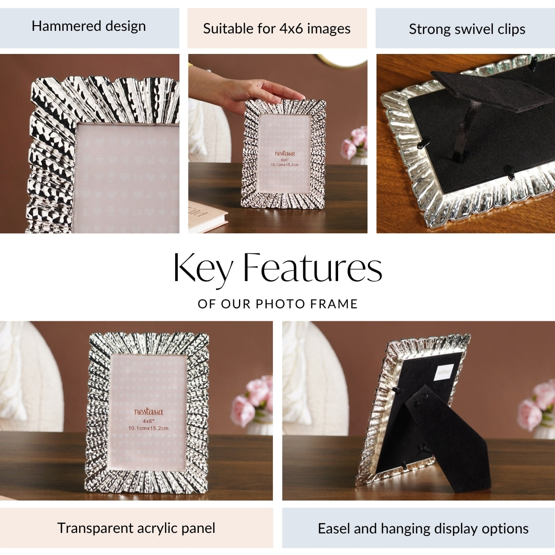 Design: This exquisite photo frame is crafted from high-quality resin with a radiant silver finish that instantly catches the eye. Its border features a textured, hammered pleated design that fans outward like sunburst rays, creating depth and dimension. Each ridge reflects light beautifully, adding a subtle sparkle and enhancing the overall look. The smooth acrylic cover keeps the focus on the photograph, while the neat rectangular shape lends it a modern charm. Compact and lightweight, it pairs sophistication with durability.