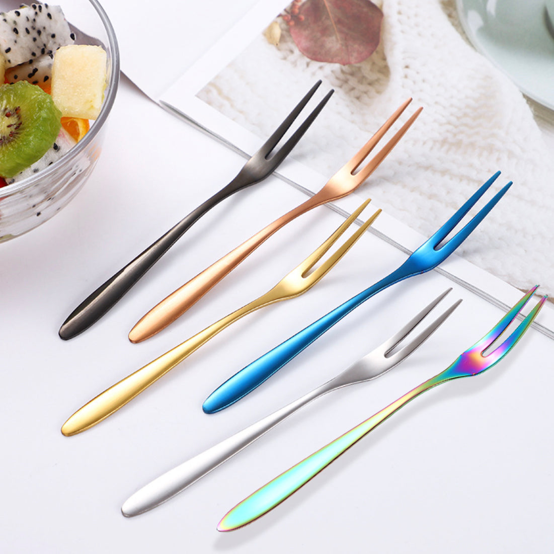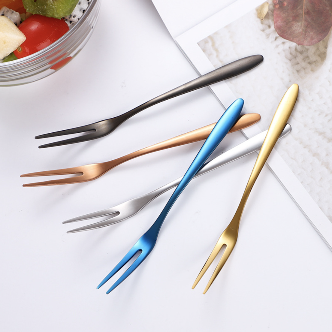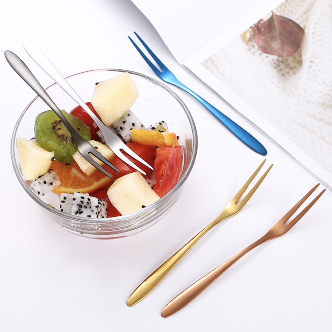 Products included: 1 set of 4 fruit forks of the same color