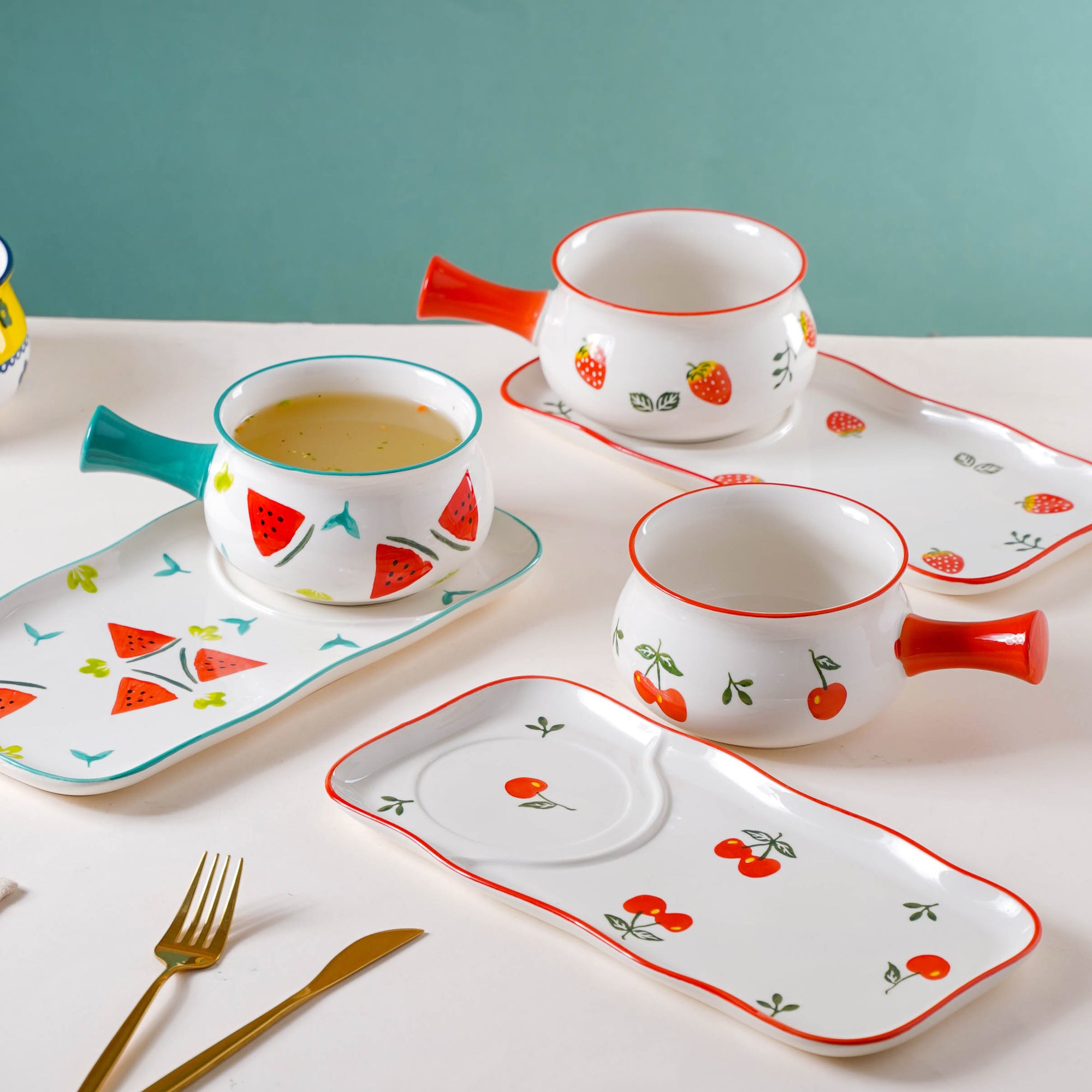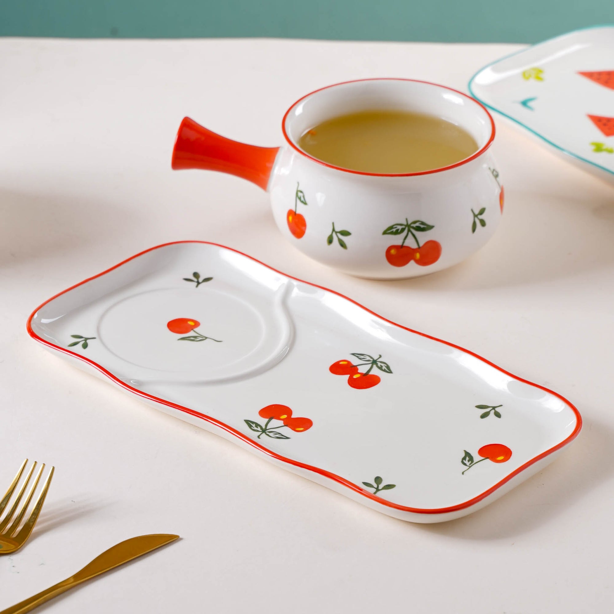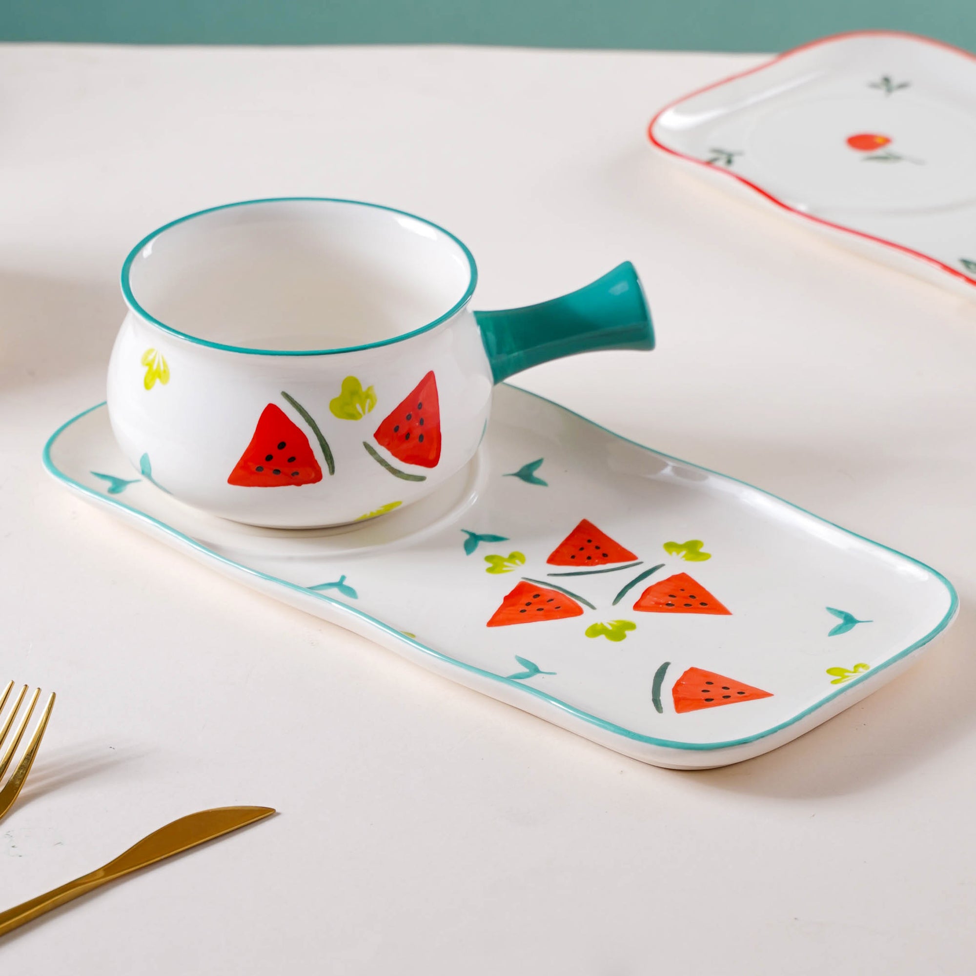 Ceramic platter with matching pot which is a great addition to the kitchen collection. The ceramic pot with plate can be used for a modernist kitchen style, and is a great complement to any dinnerware collection. The plate and bowl set is made completely of ceramic and includes a deep bowl with a long handle and a wavy-rimmed, distinctively shaped starter plate with a part specifically designed for placing the bowl. Soup with breads and buns can be served on the tray. Curries and breads can be served in the bowl and dish set, as well as sweets such brownies, waffles, and pancakes with a side of chocolate sauce. The fun fruity prints definitely make it a quirky addition to the kitchen collection.