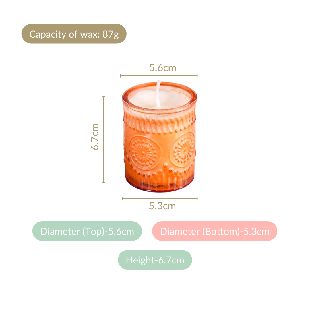 Design: Each scented candle is beautifully encased in meticulously crafted glass jars with vibrant sunset hues, adding a pop of colour to your decor. The intricate geometric patterns, reminiscent of delicate sunflowers and dandelions, not only add an artistic touch but also provide a secure grip, allowing you to light these candles with ease.