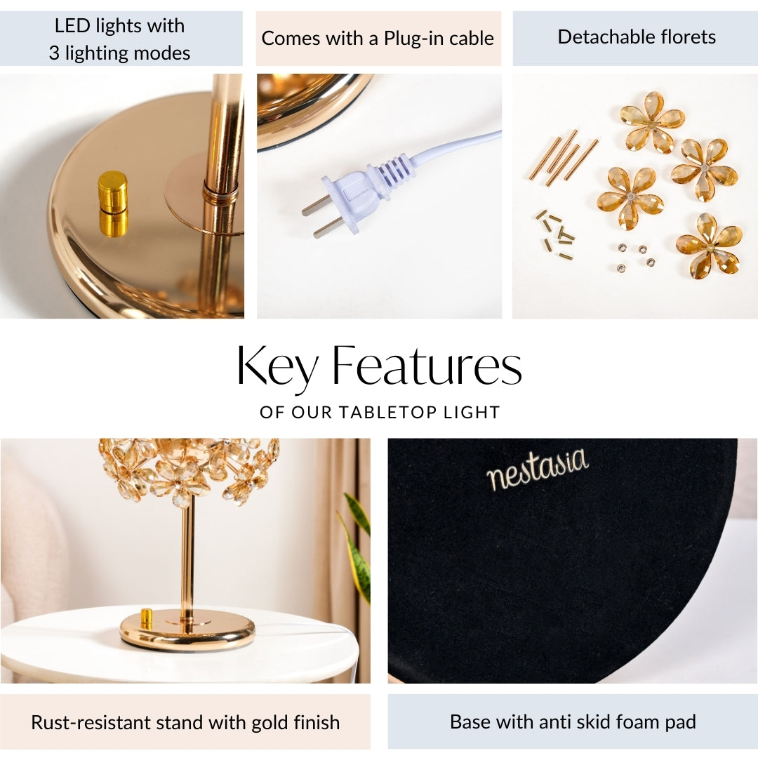This tabletop LED Light brings sparkle to the everyday with playful floral charm. A crystal dome, plug-in cable, and metallic finish make this light a must-have decorative LED lamp for compact spaces.