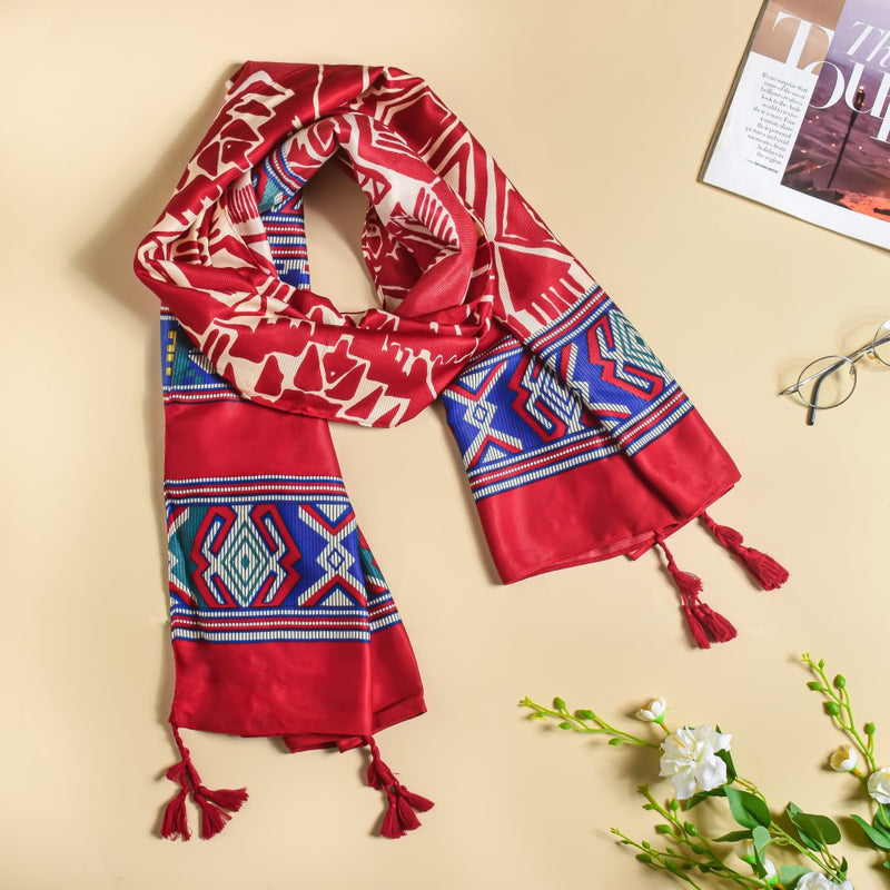 The polyester scarf comes in a vibrant red colour featuring abstract and geometric prints in white, blue, and purple, making the printed scarf an instant showstopper. The polyester fabric ensures that the long scarf is super-soft and smooth to the touch without causing any rashes or skin irritations. Pair the ladies' scarf with jackets or pullovers of contrasting colours to create a trendy and fashionable look.