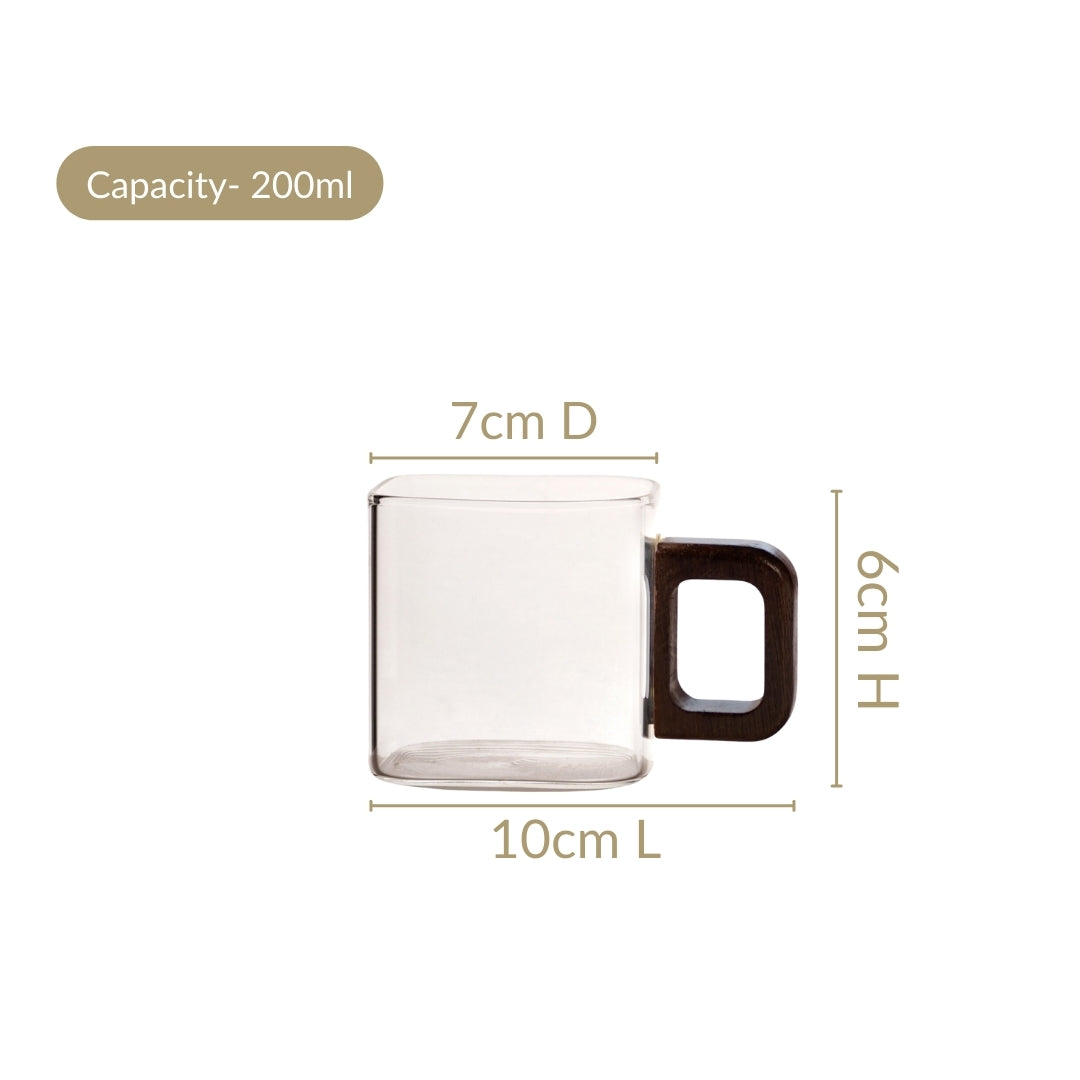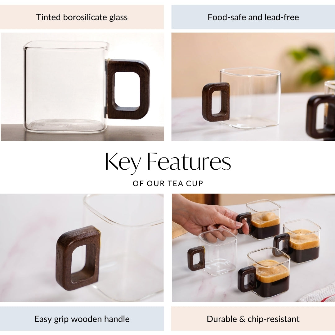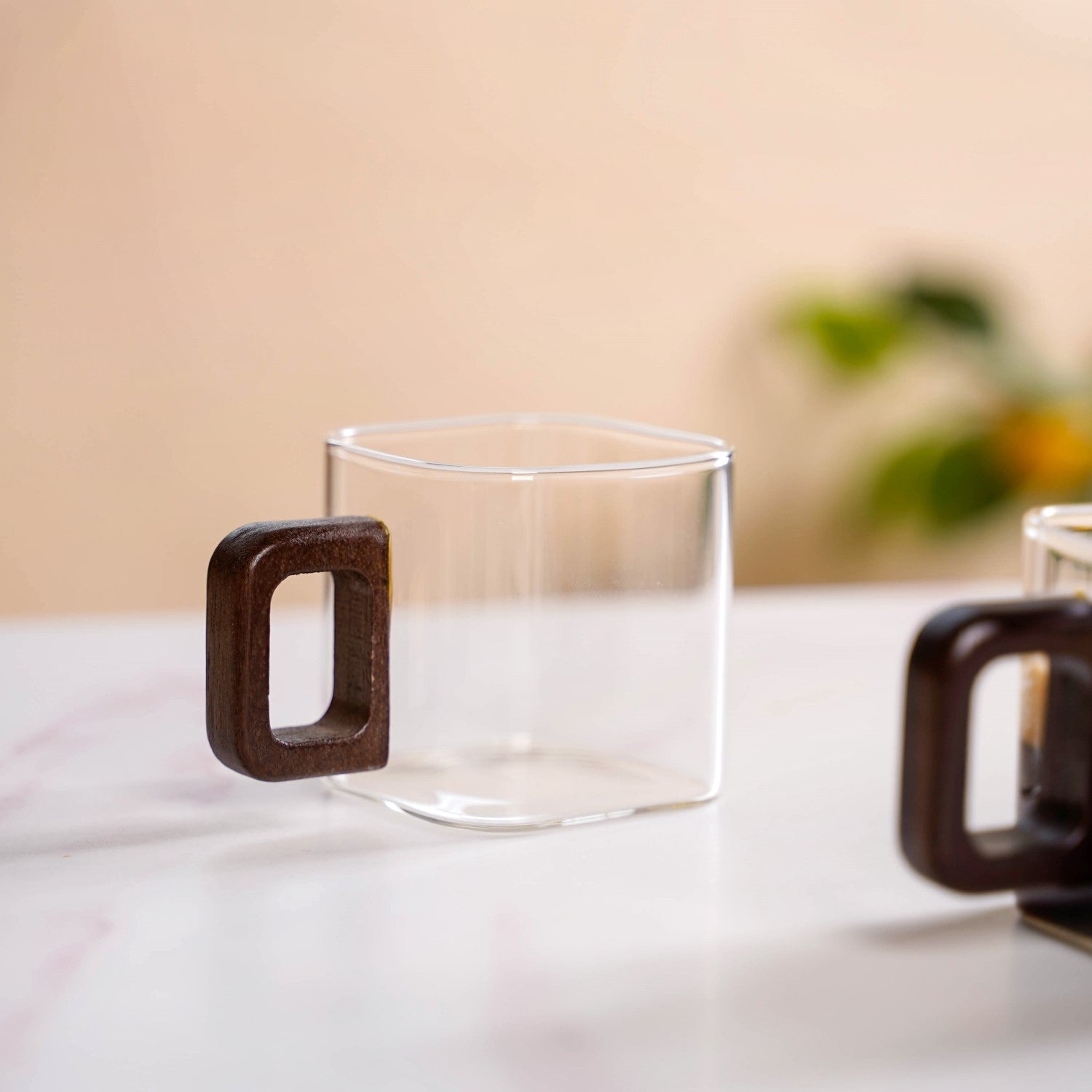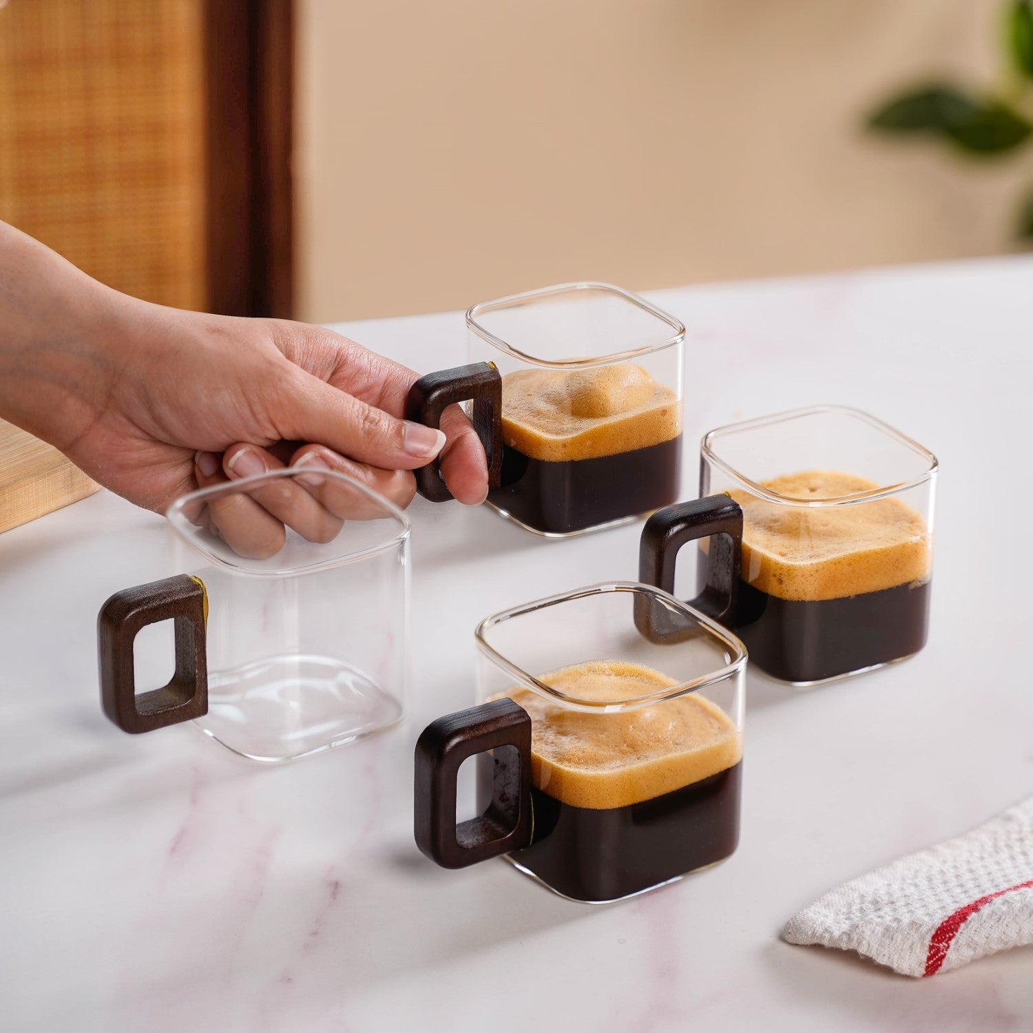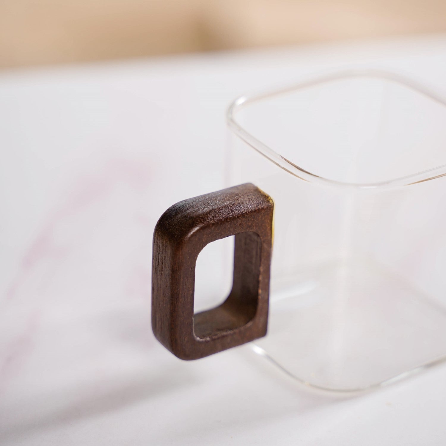 Design: This set includes four transparent cups, meticulously crafted from clear, heat-resistant borosilicate glass. Each cup rests on a square base and tapers upward to a smooth, finely finished rim, defined by clean, angular lines that lend a sleek, modern aesthetic. Thoughtfully designed with minimalism in mind, these cups blend seamlessly into any setting. The spacious wooden handle, accented with a square cutout, not only adds visual contrast but also provides a comfortable and stylish grip.