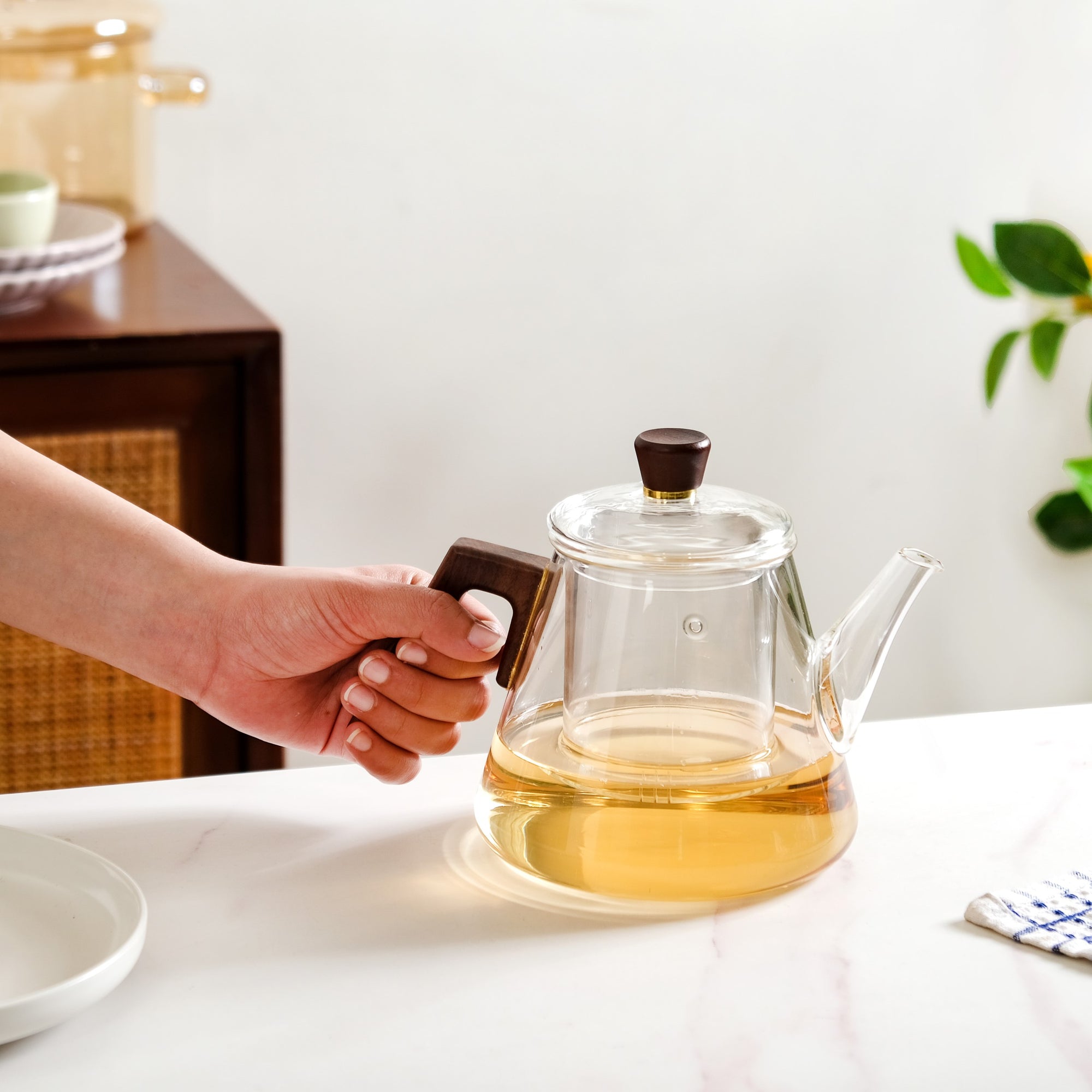 Design: The transparent teapot features a generous silhouette and a refined, long spout for easy pouring. Its sleek surface shows off the tea’s colour while enhancing the table’s aesthetic. The wooden handle adds a warm, rustic contrast and ensures a firm, cool grip. The infuser cum strainer, also made from high borosilicate glass, includes bottom slits for optimal steeping and a steam vent for ventilation. The borosilicate lid fits snugly, topped with a wooden knob and a built-in steam release for safe and steady brewing.