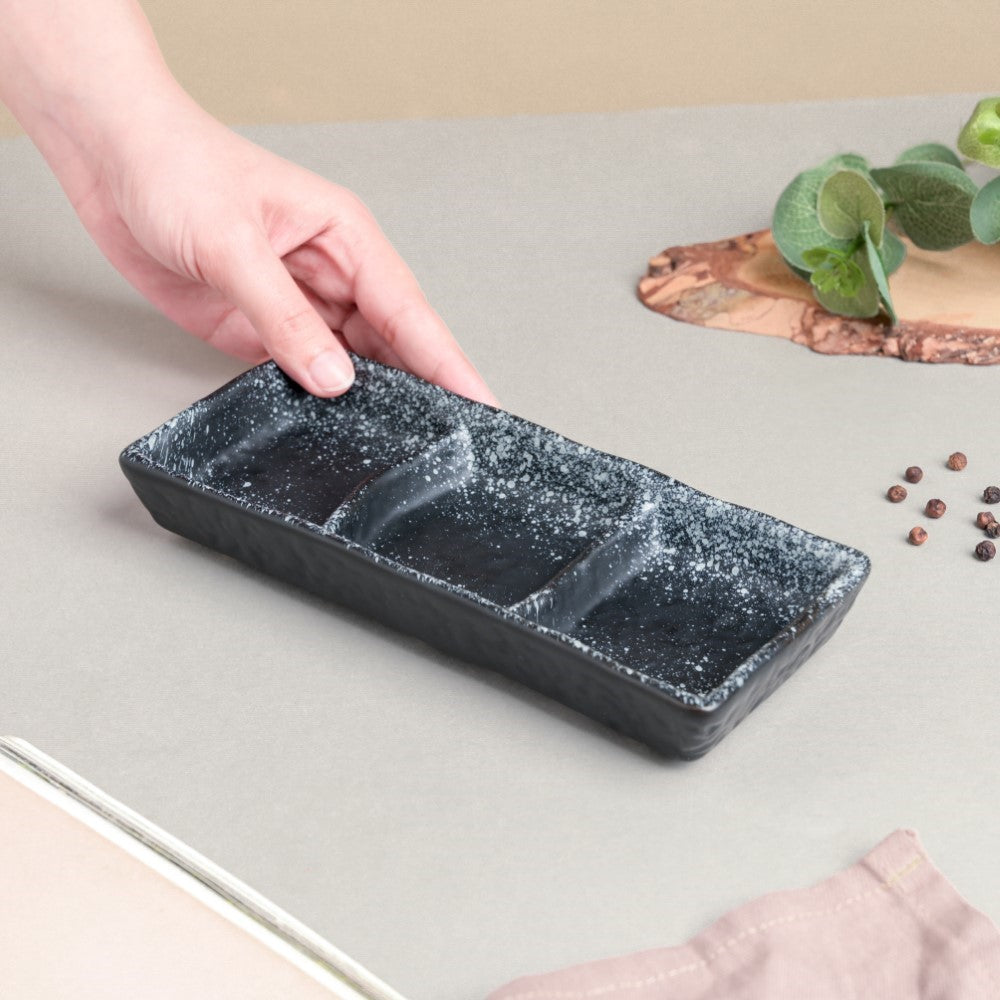 The stoneware sectioned plate with its speckled pattern implements a contemporary vibe to the table. Any chutneys or dips can be served on the clay ceramic plate which features a matte black colour with speckled grey patterns. The 3-sectioned plate can also be used as a trinket dish to hold trinkets or for organizing small essentials. The ceramic plate may be paired with black ceramic snack dishes to complete the table setting.