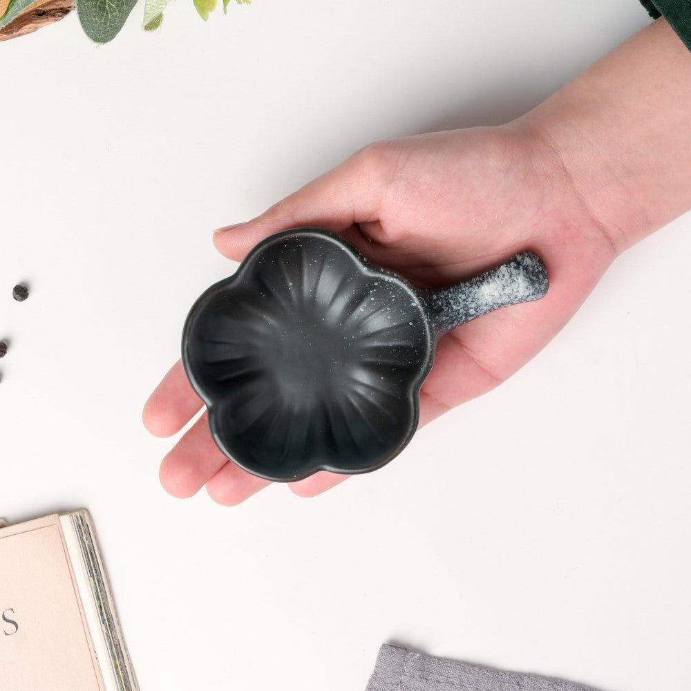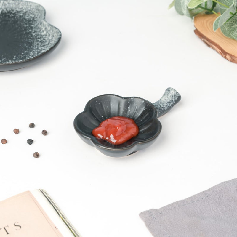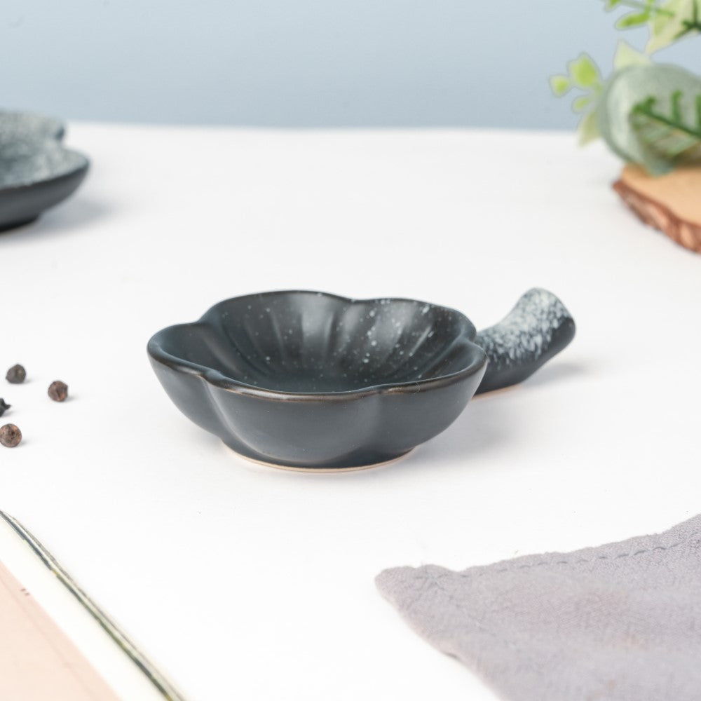 The dip bowl has a floral shape and has been hand-crafted of high-quality ceramic clay with a sleek black colour. The striking colour is a wonderful addition to one's ceramics collection and provides the ideal way to serve sauces with evening munchies. The dip bowl is suitable for different cuisines, whether it be a mint mayo or a spicy chutney. One can even place their chopsticks on the extended handle of the dip dish.