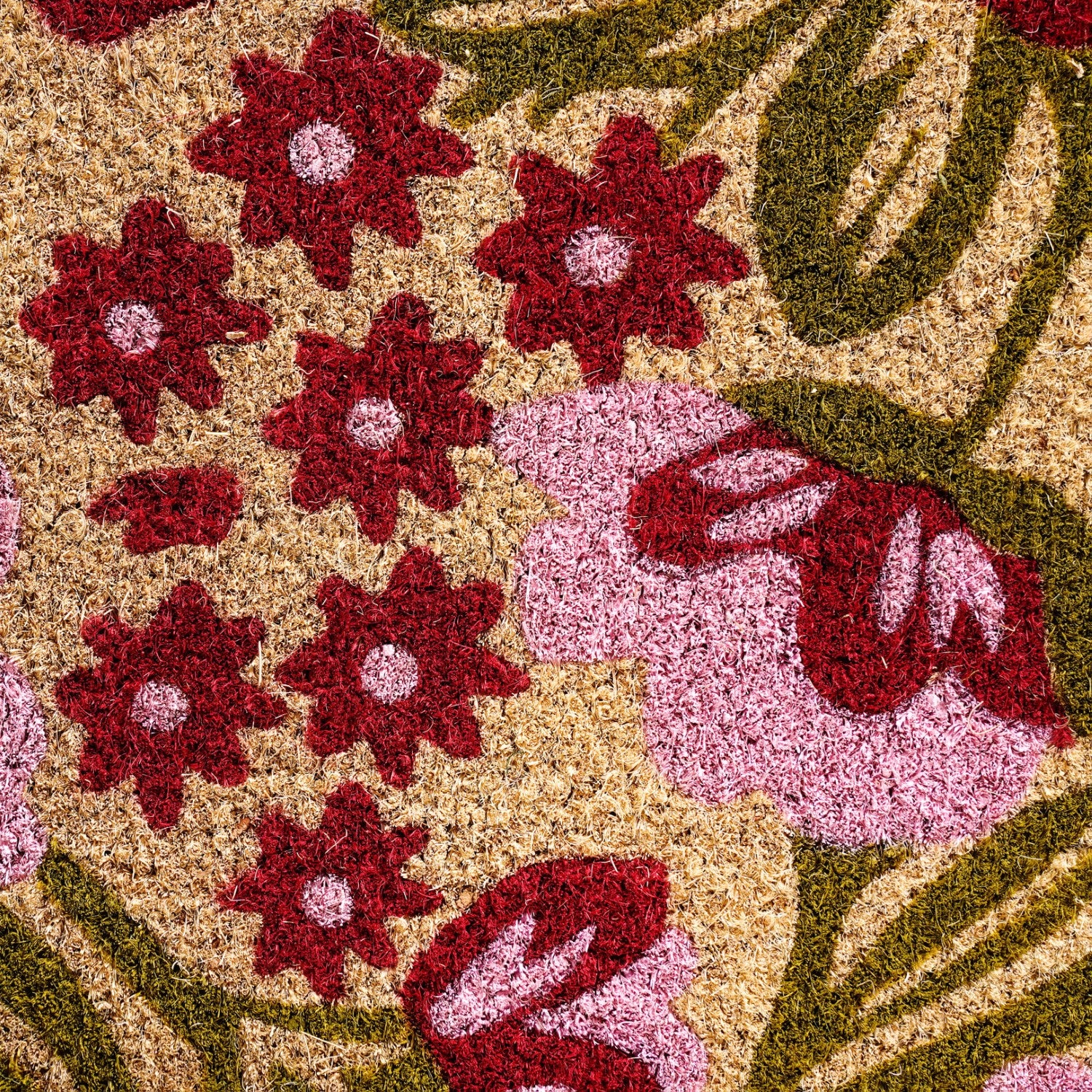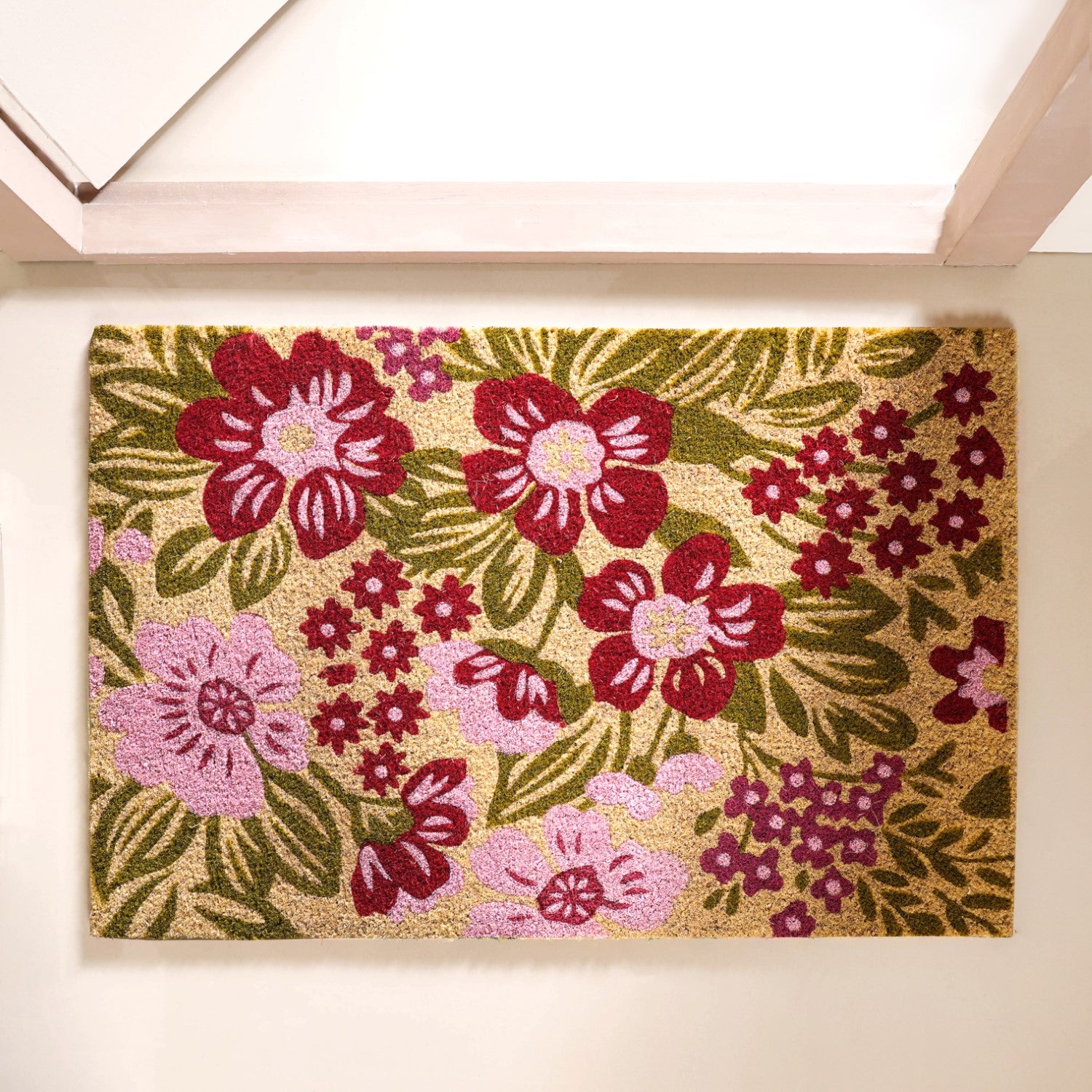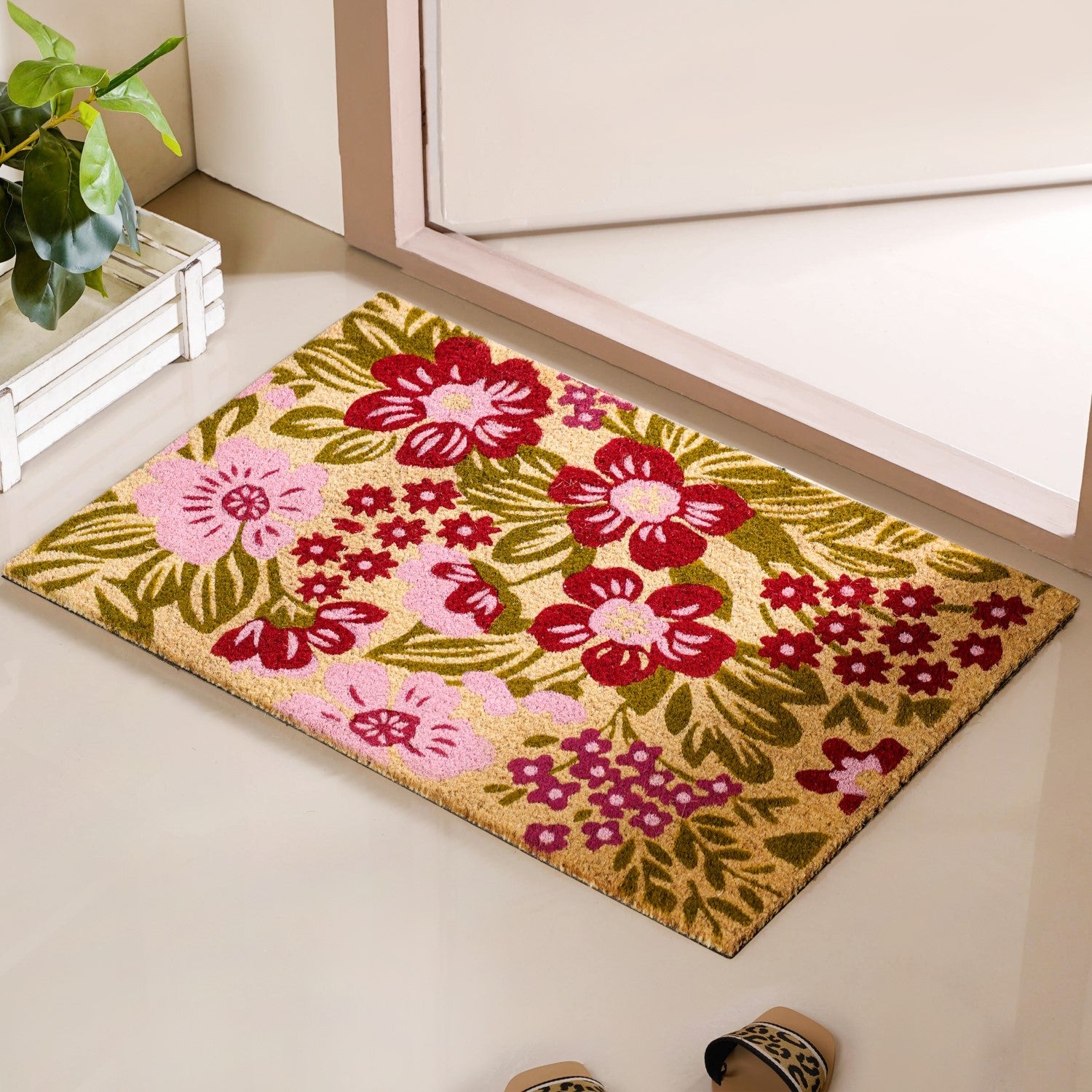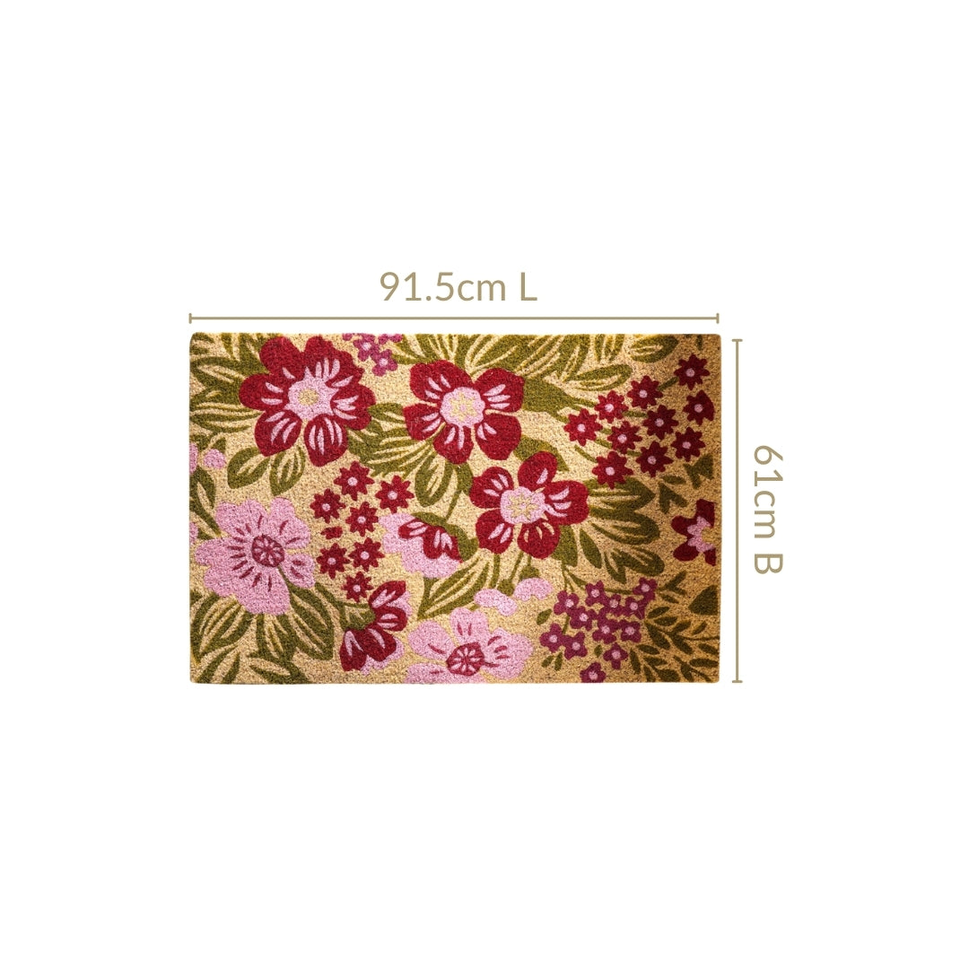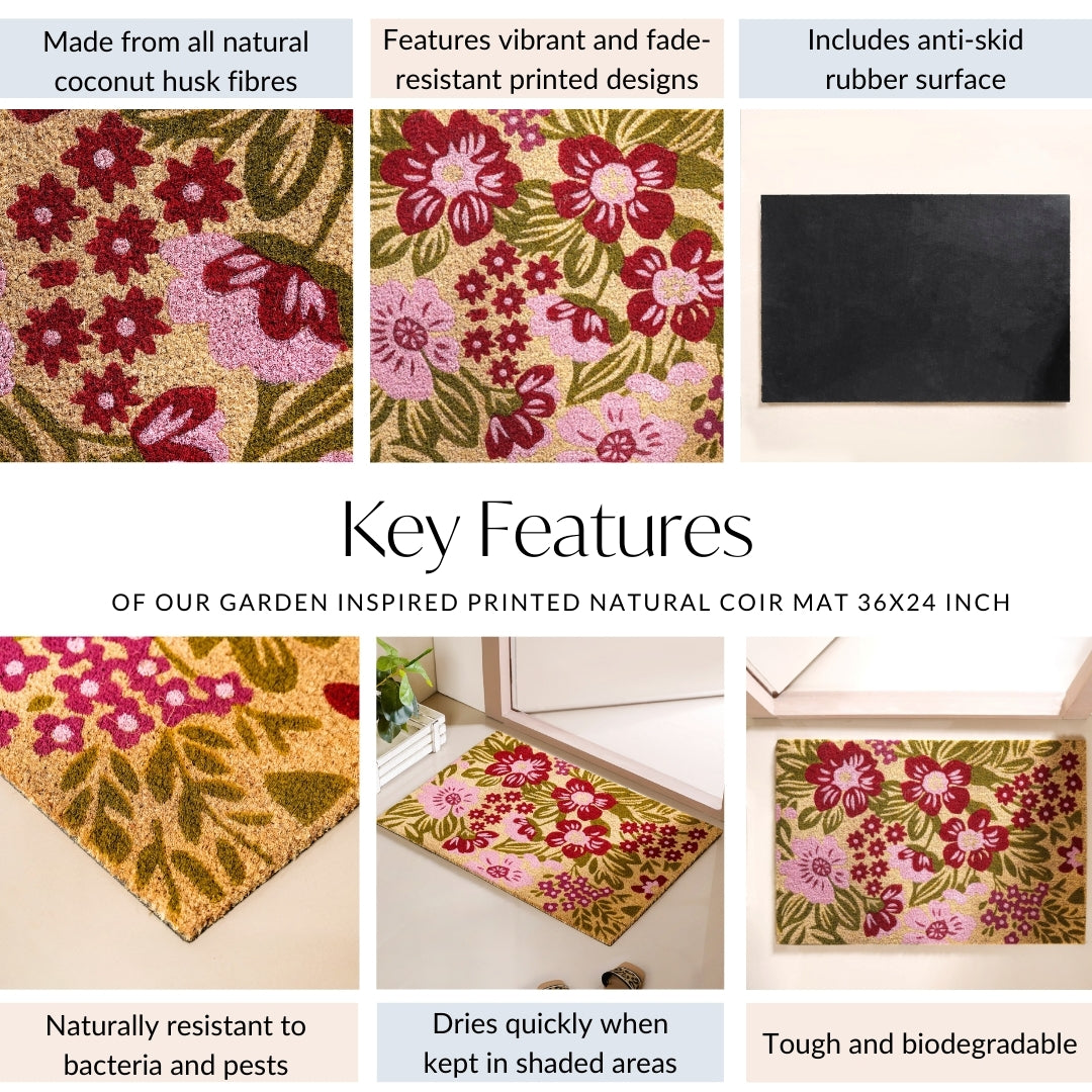 Design: A smart pick for your doorstep, this coir mat blends natural texture with everyday practicality. Made using coarse coconut coir fibres, the mat is designed to be tough on dirt while still being gentle underfoot. The thick bristles clean off shoes effectively, helping you keep indoor spaces mess-free. Printed using fade-resistant dyes, the floral surface stays vibrant even with regular use. Its sturdy anti-slip rubber backing holds the mat in place, preventing slips and bunching. With a generous rectangular shape and bold pink begonia print, this eco-friendly, natural fibre mat adds charm to covered balconies, patios, and entranceways while serving as a functional outdoor doormat.