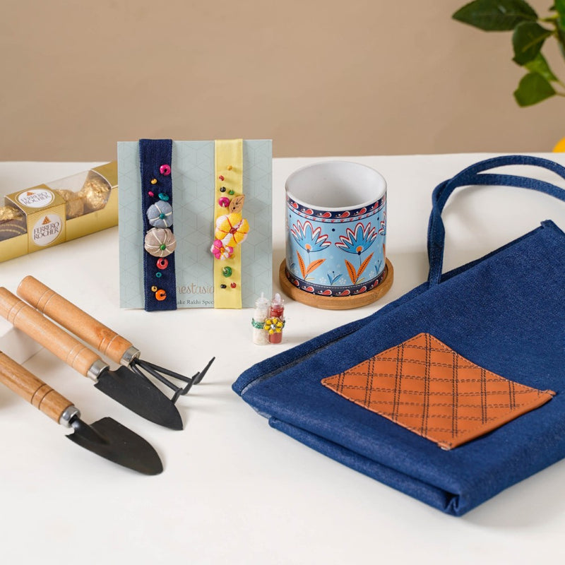 Nurture the bond of love and celebrate the green spirit with the Rakhi Hamper, thoughtfully curated to delight the green thumbs in your life. Encourage their passion with the elegant planter and coaster set, creating a perfect home for blossoms and greenery. The apron adds a touch of practicality while keeping them clean during gardening. Equip them with the essentials using the set of planter tools, including a trowel, shovel, and hand cultivator, for a seamless gardening experience.