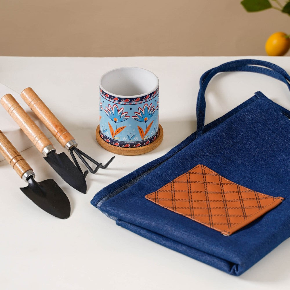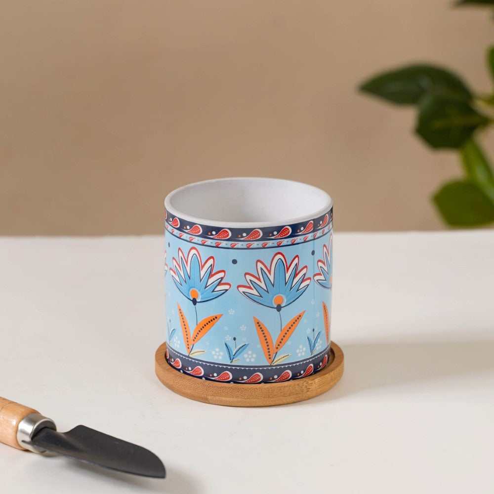 Cerulean Bloom Botanical Planter With Wooden Coaster |