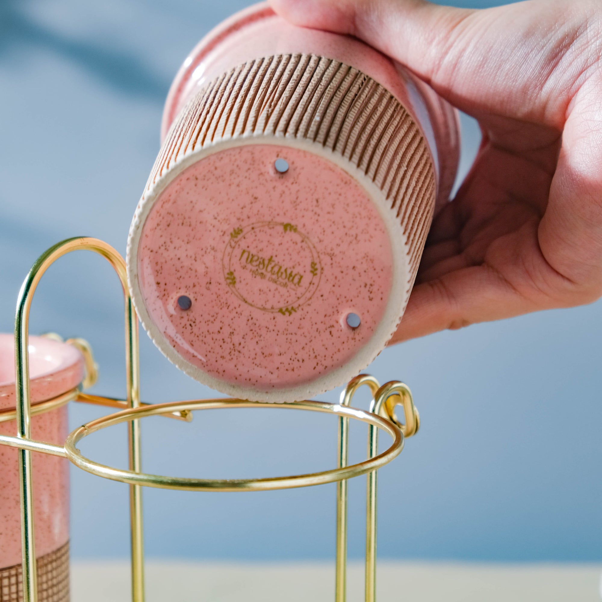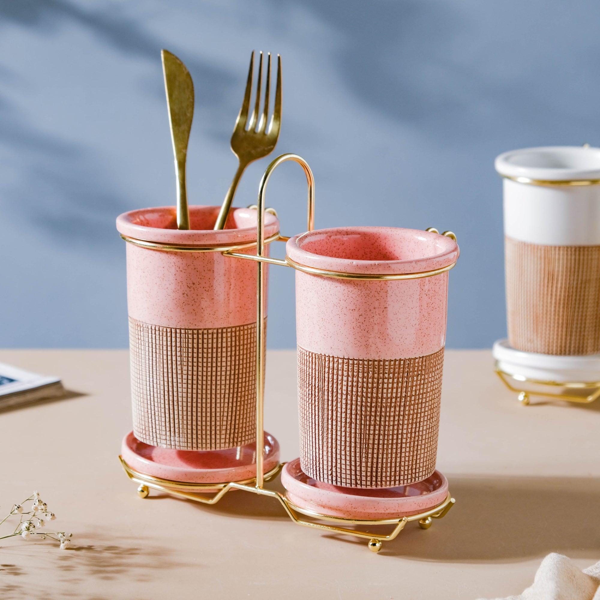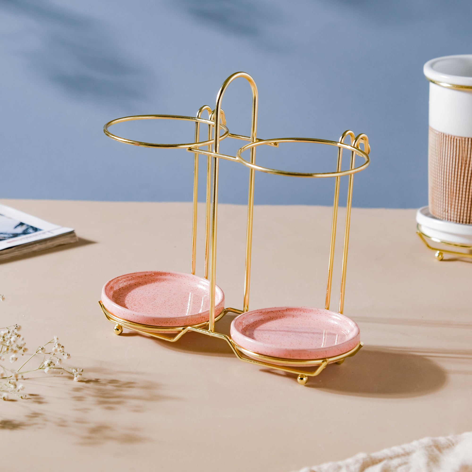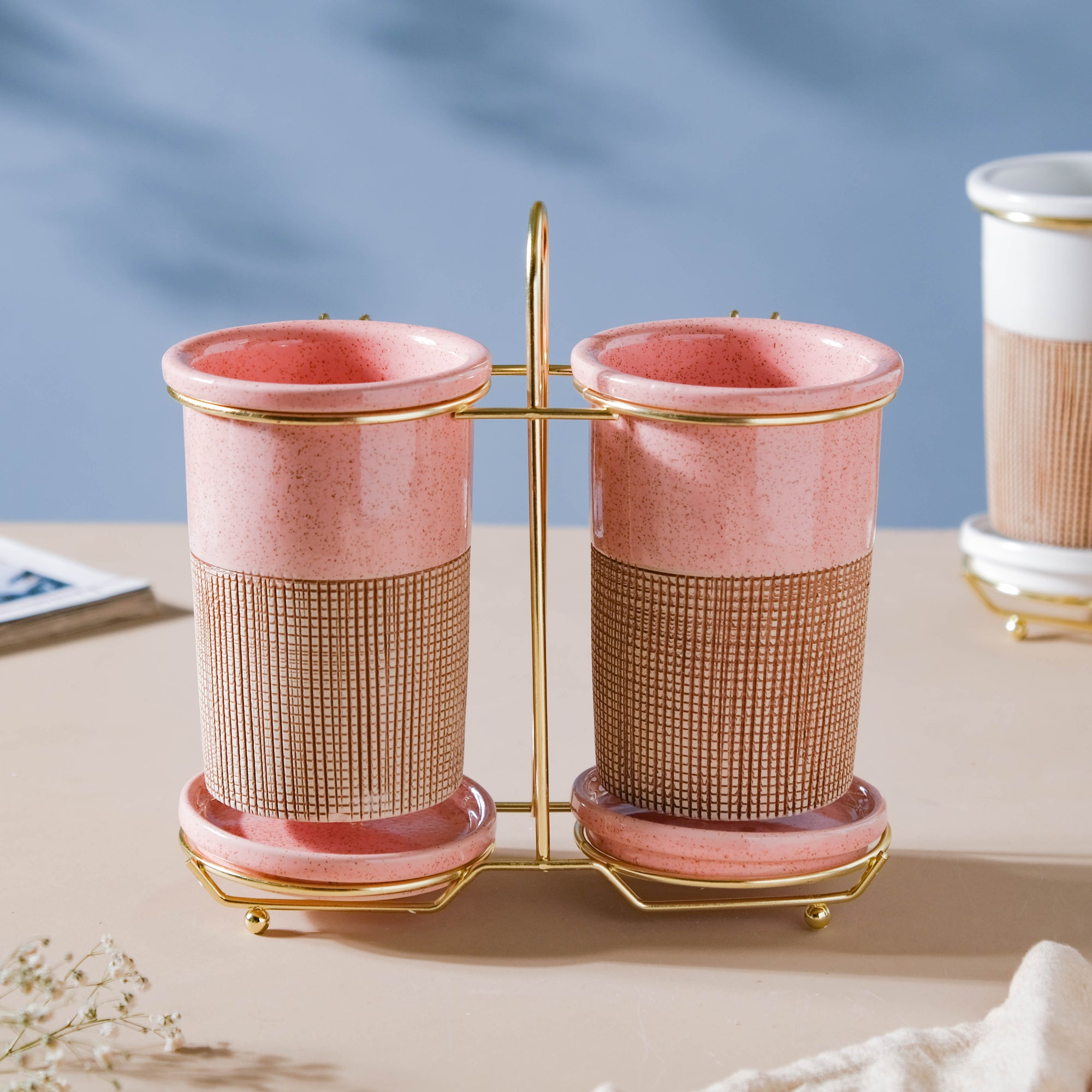 The body of the tumbler is painted with a creamy pink hue and is enhanced by a brown checkered band. The tumblers are capped with a lid and are kept together with the help of a golden-colored stand. The pair of tumblers can be a great addition to a tabletop, or in a kitchen. Other than these, the tumblers can also be used as a: