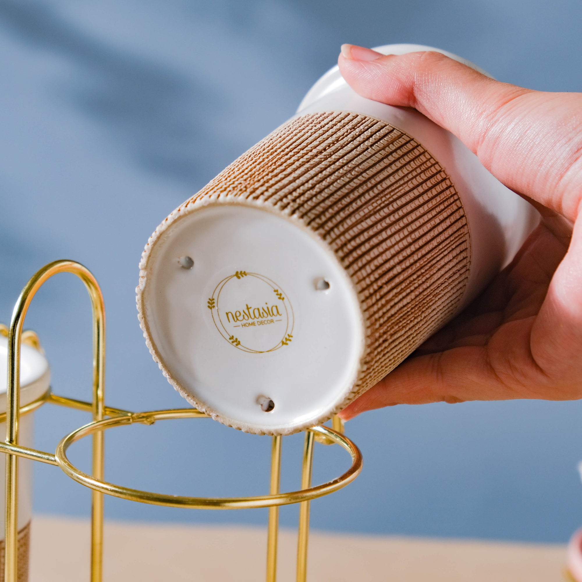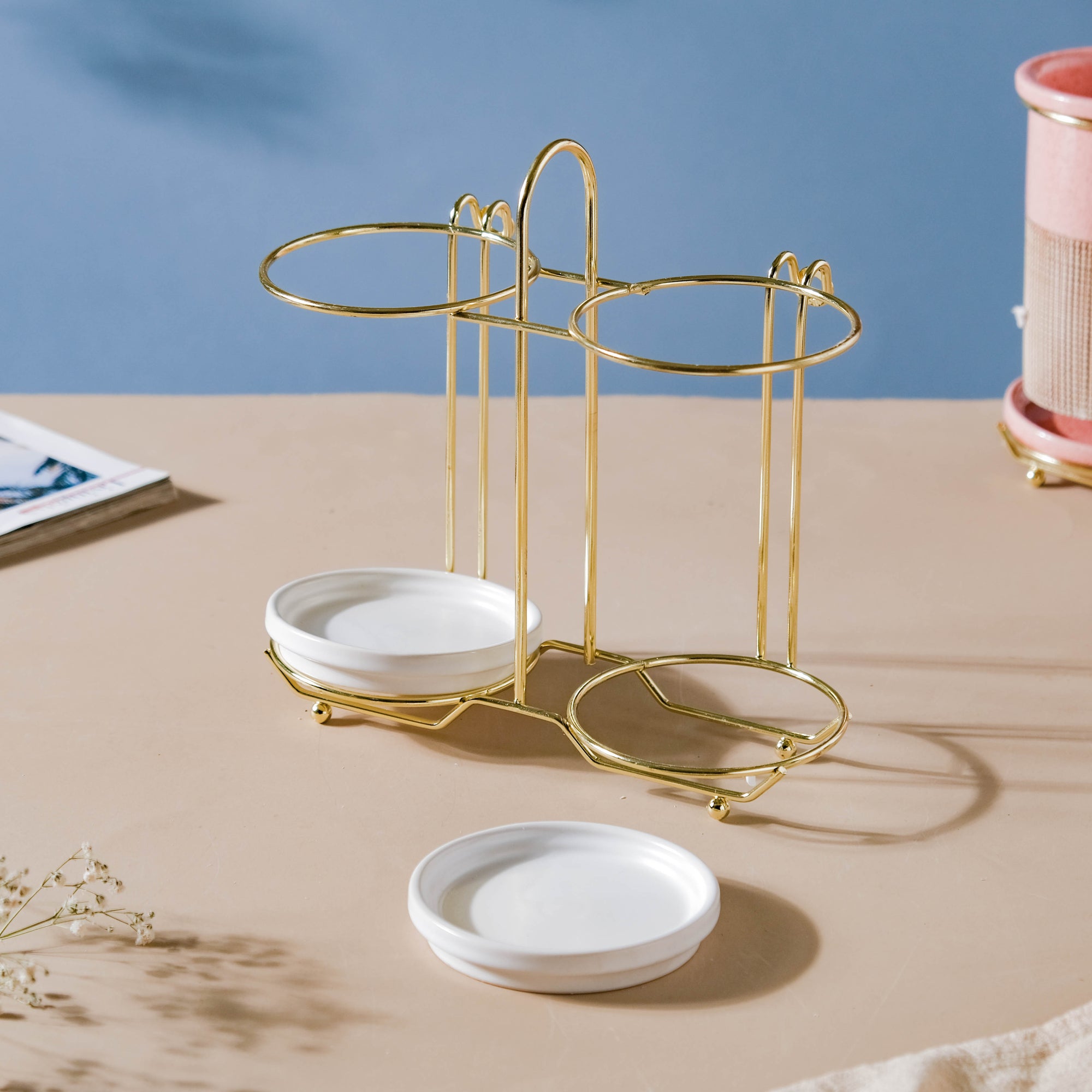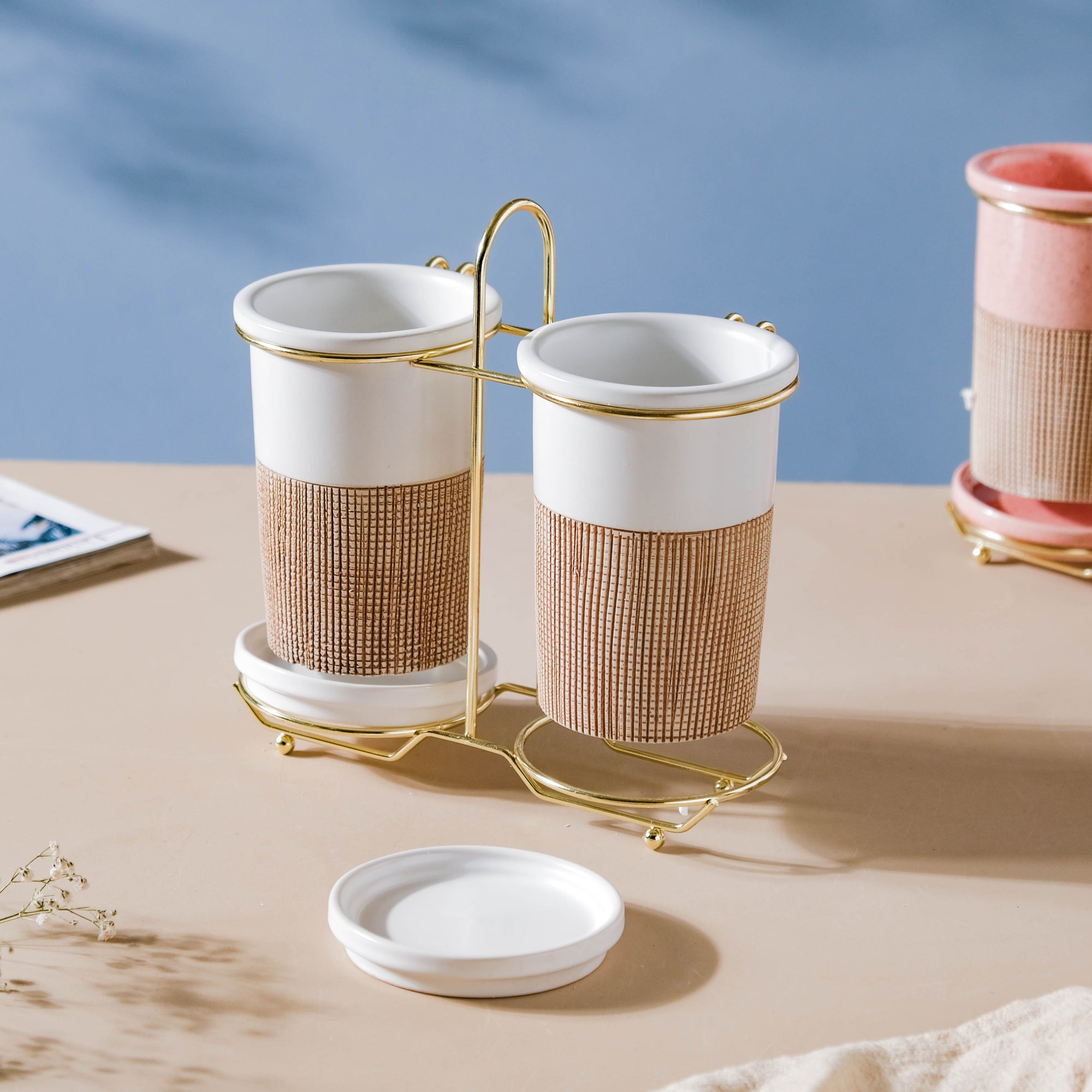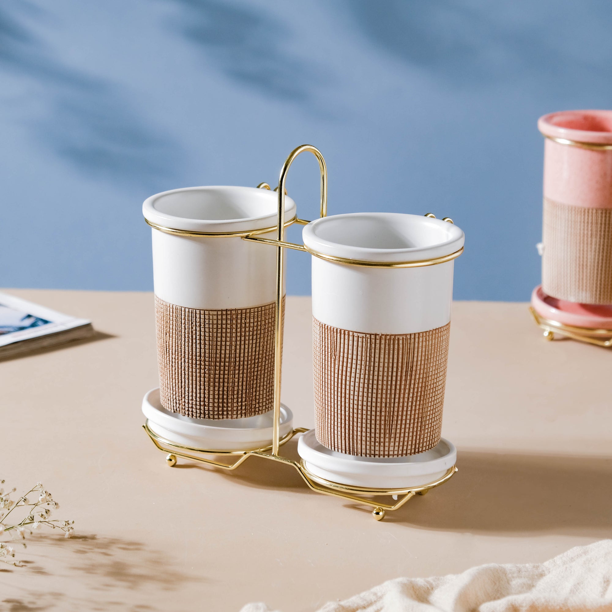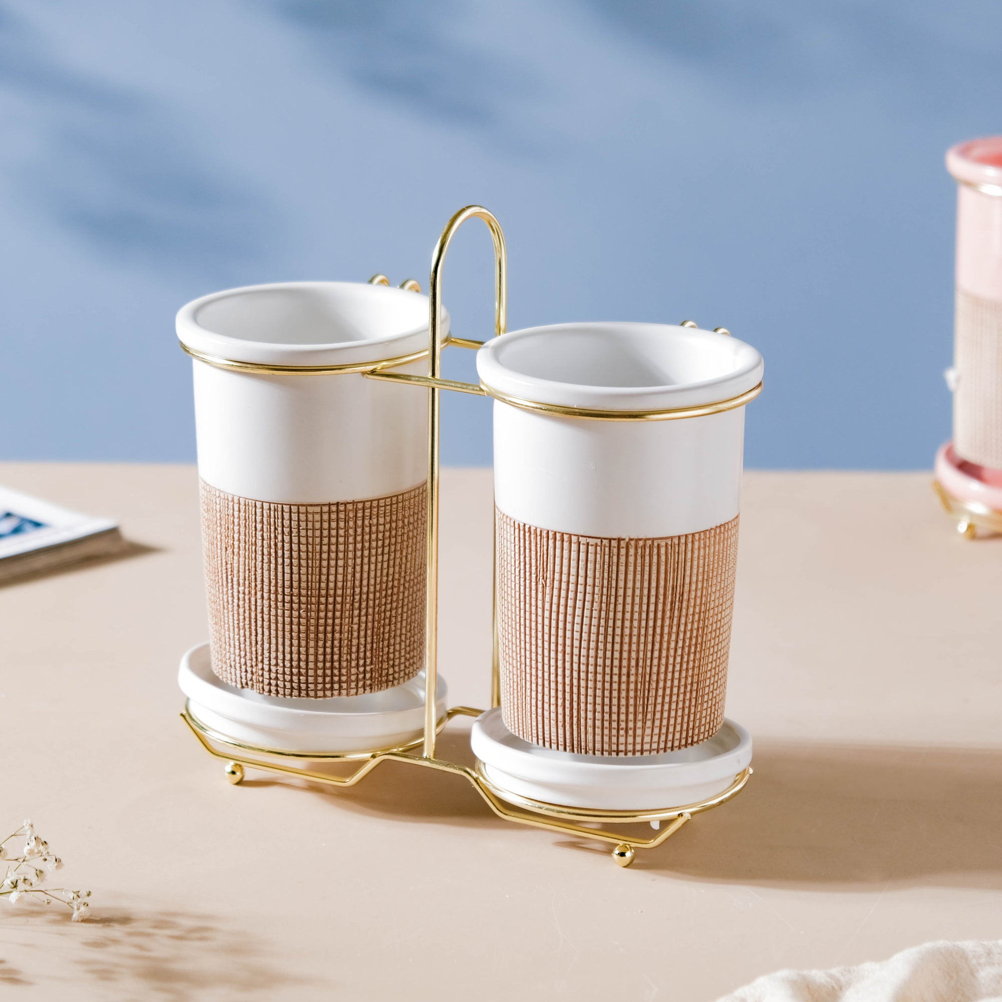 White, a color that can be a shelter to multiple colors residing in the crayon kingdom. Just as white can be a banyan tree to other colors, the tumblers too come with ample space to hold the daily essentials. The minimalist white tumblers are given a touch of fabrication with a brown band on their bodies. The two tumblers are supported by a golden-colored stand and can be kept anywhere- on the dresser, on a table, or on a bathroom rack. The tumblers can also be used as a: