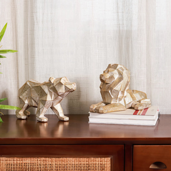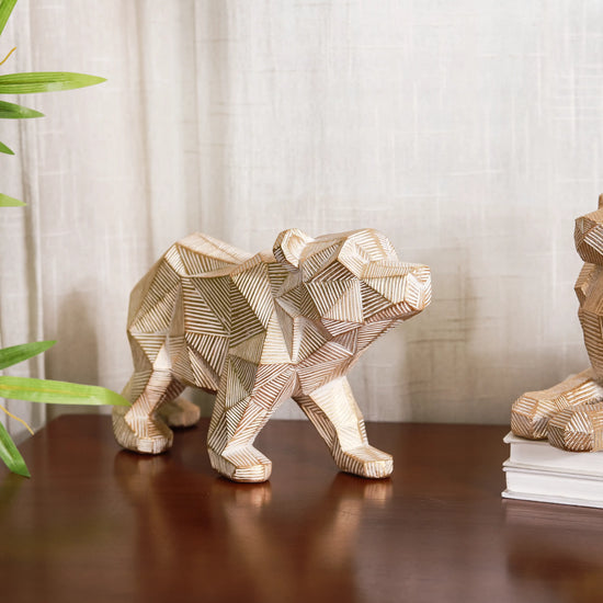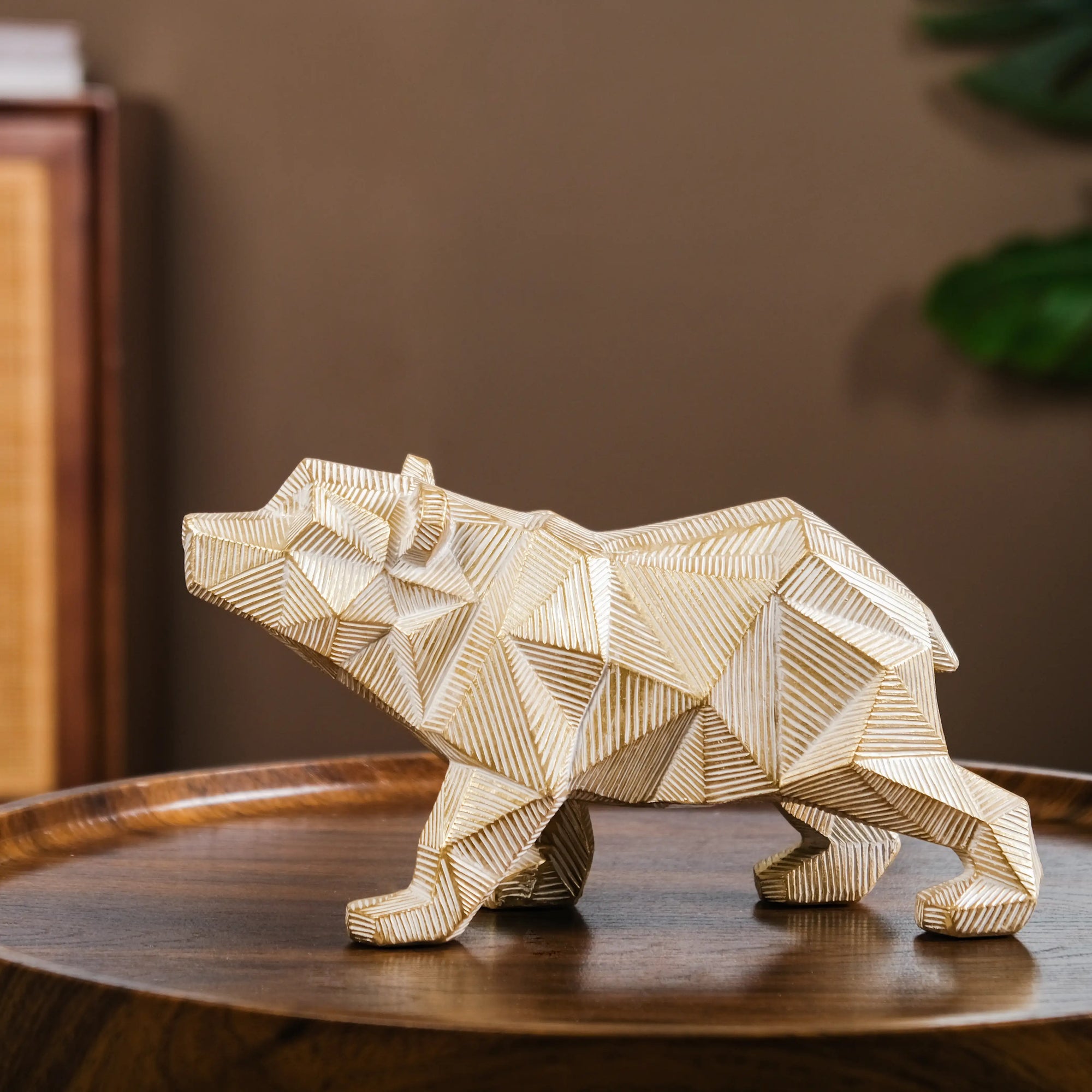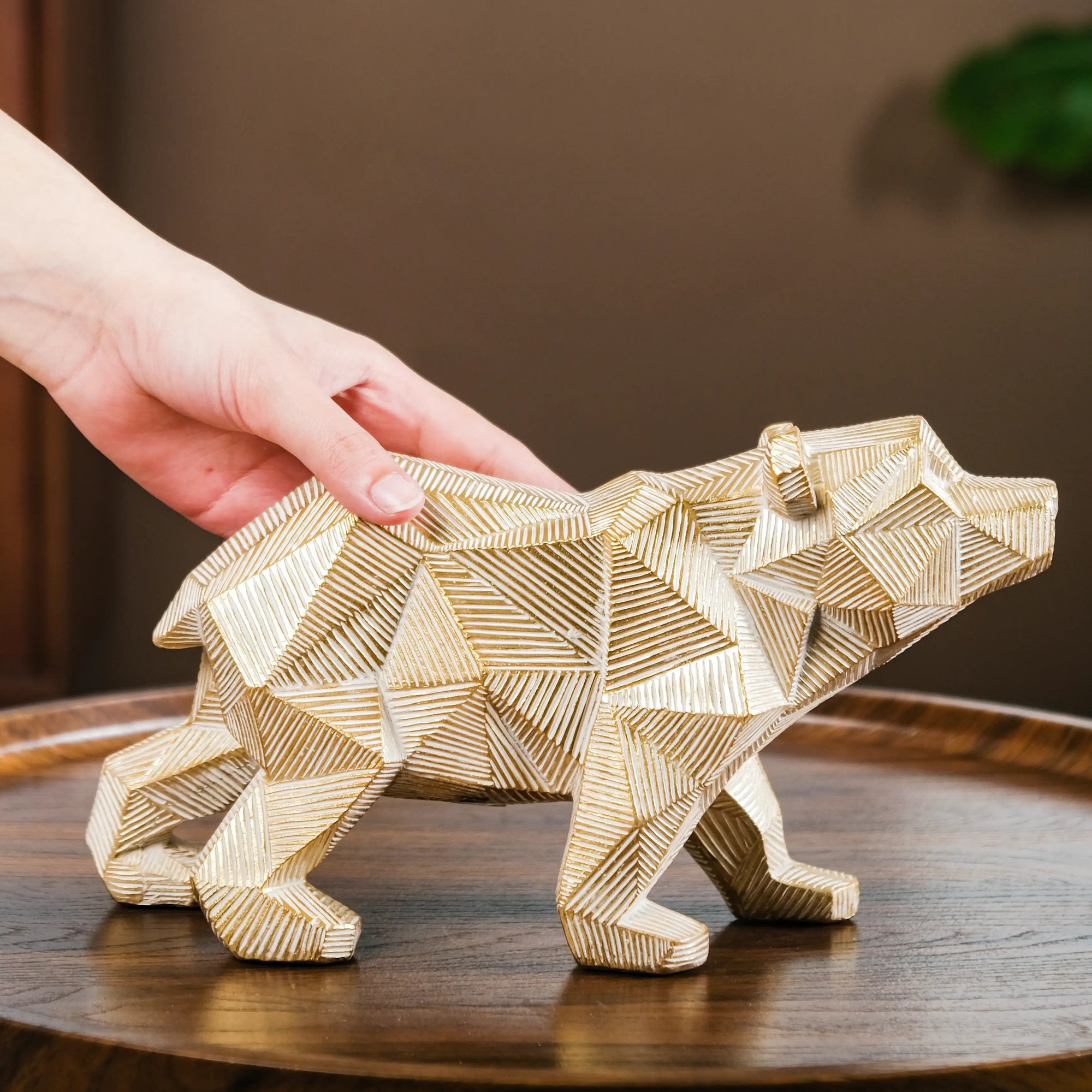 The geometrical walking bear showpiece in a lustrous golden shade is a masterpiece that harmoniously fuses modern aesthetics and timeless elegance. Meticulously crafted from resin, its opulent golden finish exudes luxury. The abstract form, defined by geometric edges, captivates with its visual allure. The walking bear design radiates strength and grace, seamlessly enhancing contemporary or traditional interiors. Whether on a shelf, mantel, or accent table, this showpiece claims the spotlight, infusing sophistication and artistic charisma into your home.
