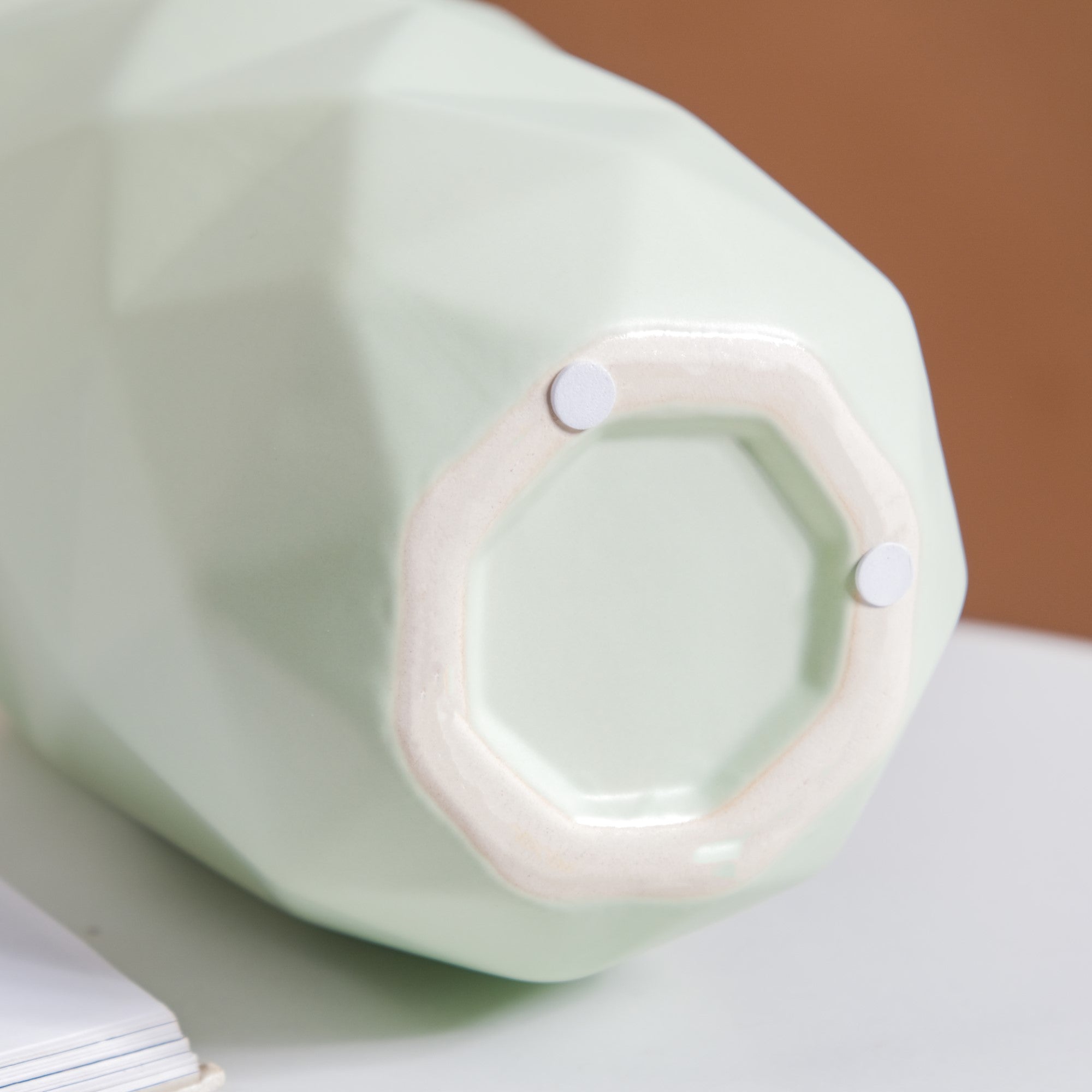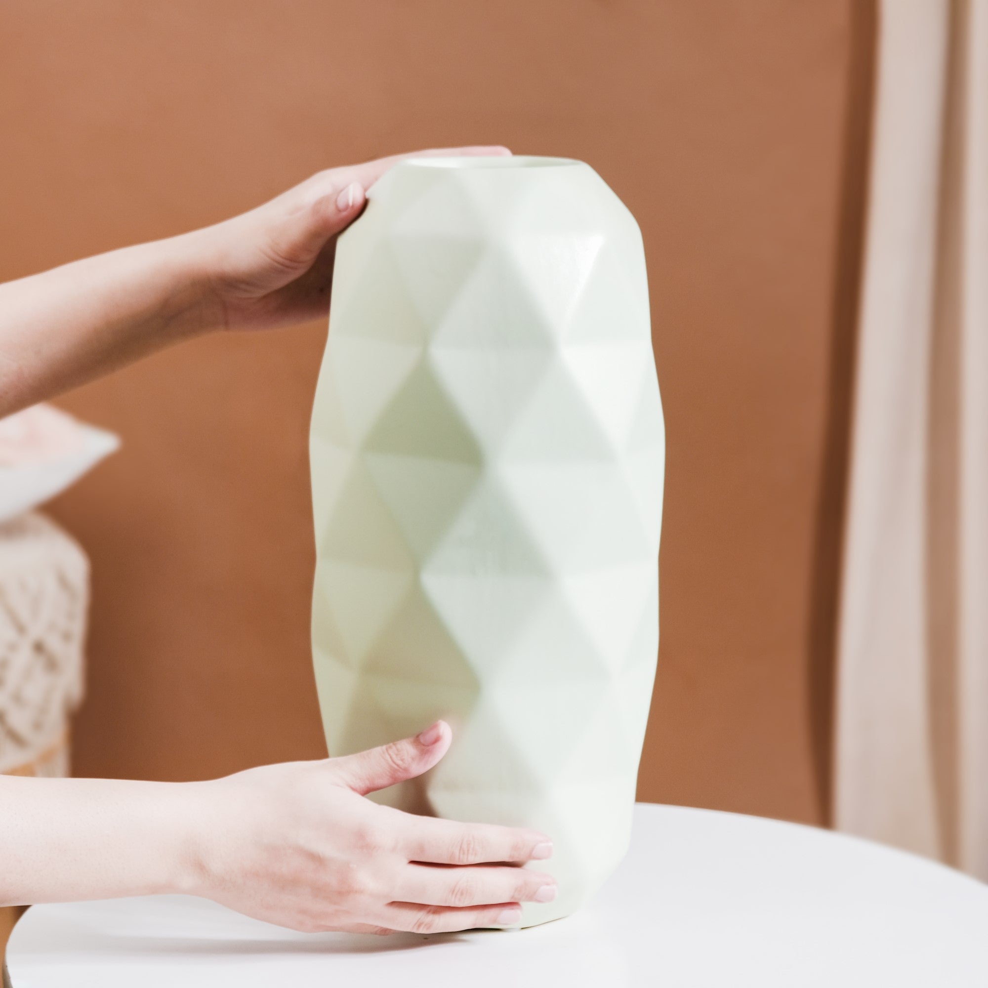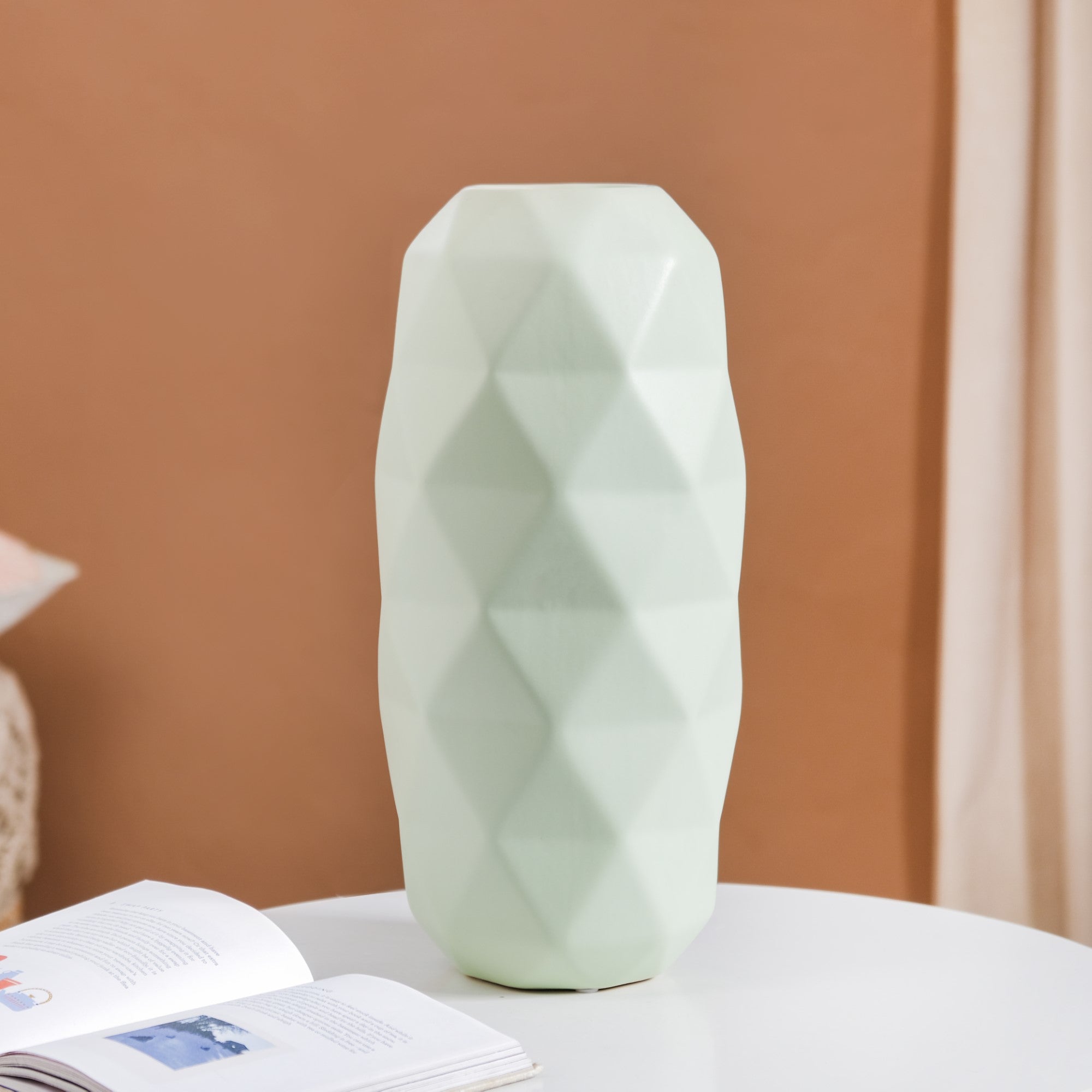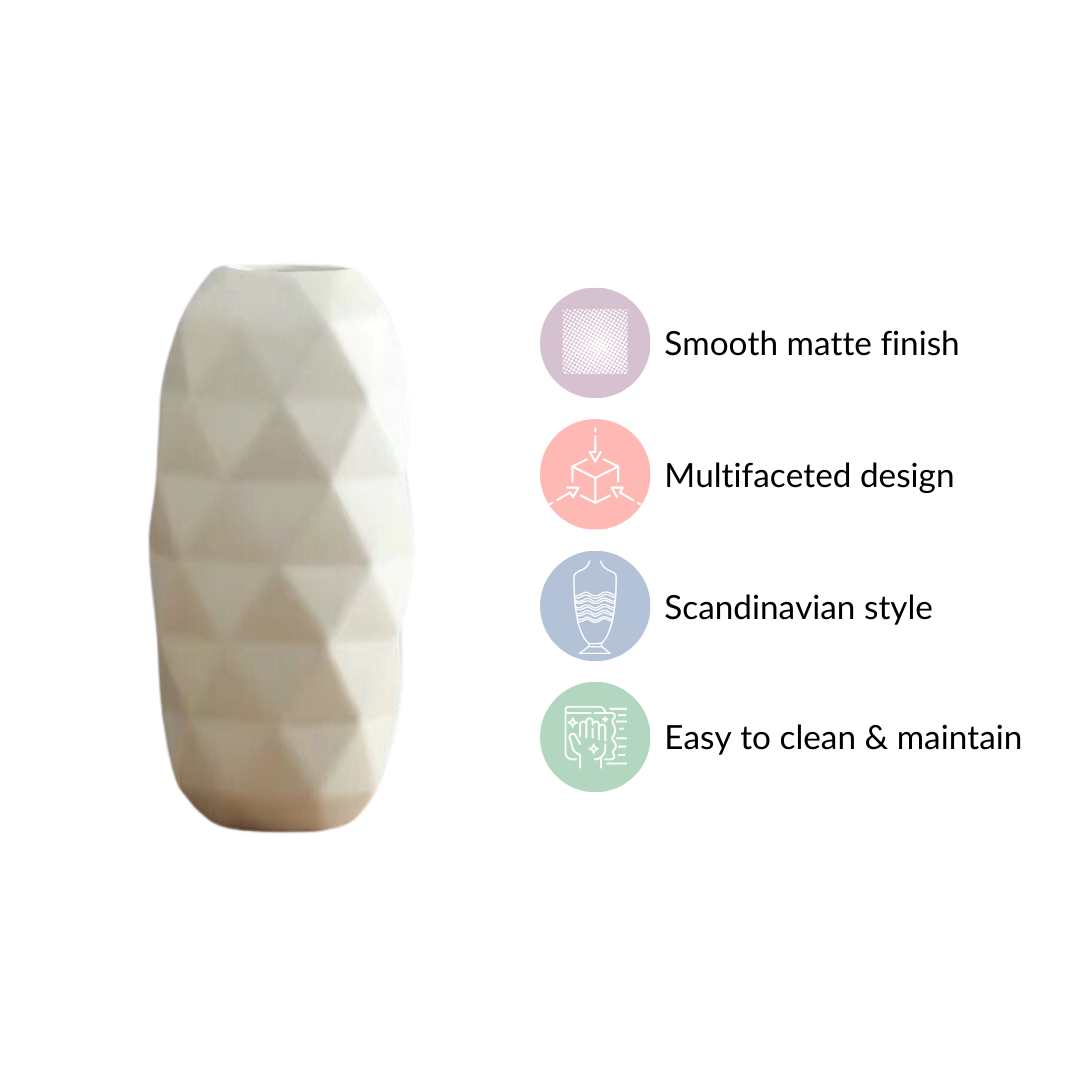 Enhance your living space with our meticulously crafted ceramic flower vase. Featuring a diamond-textured exterior and a sleek matte finish, it radiates sophistication, embodying the essence of Scandinavian decor. Its multifaceted design lends a modern touch to the classic ceramic vase, while the anti-skid foam base ensures stability and surface protection. This decorative vase combines artistry and functionality, accommodating large flower arrangements to bring nature indoors. Easy cleaning and maintenance make it a hassle-free addition to your living room, offering a seamless blend of style and practicality.