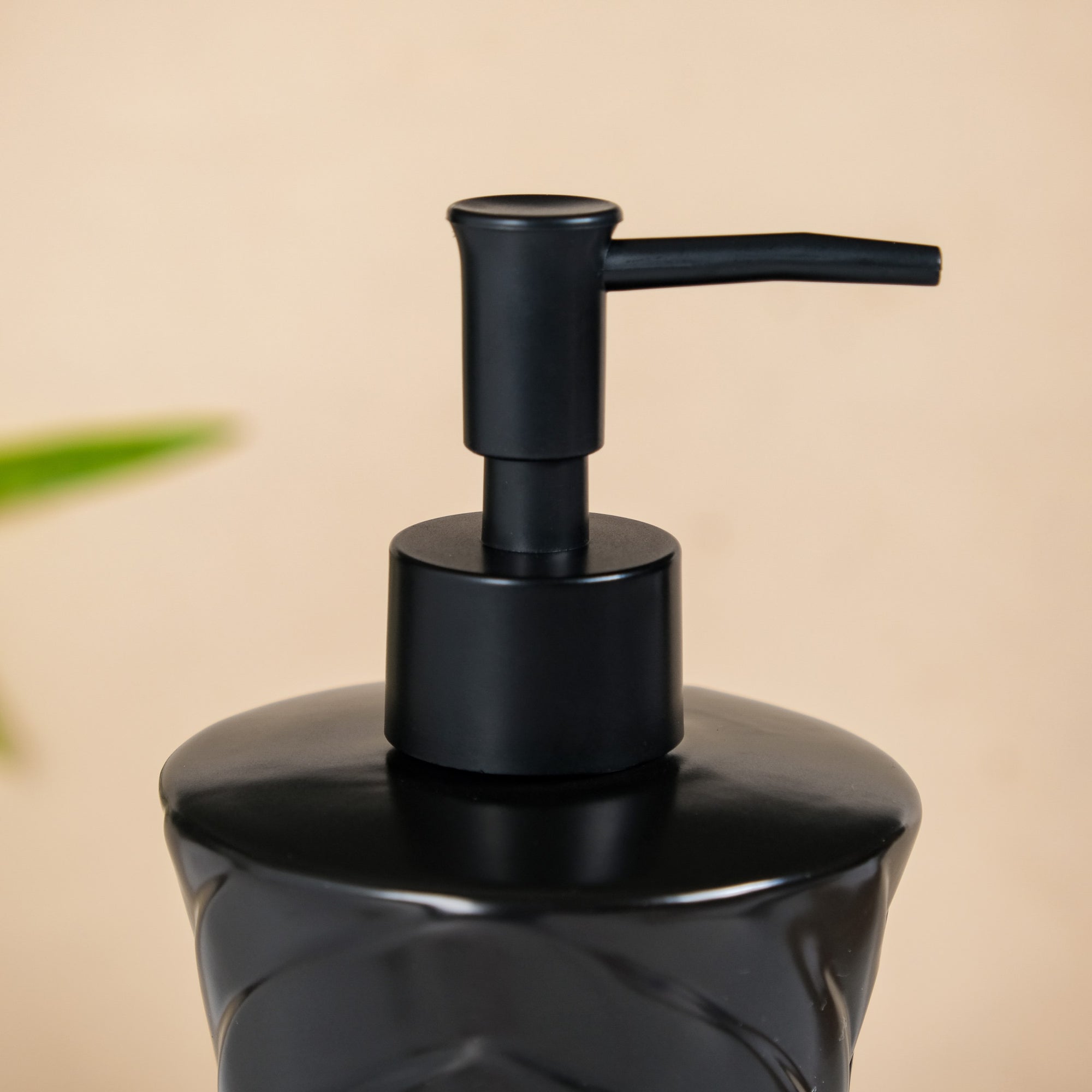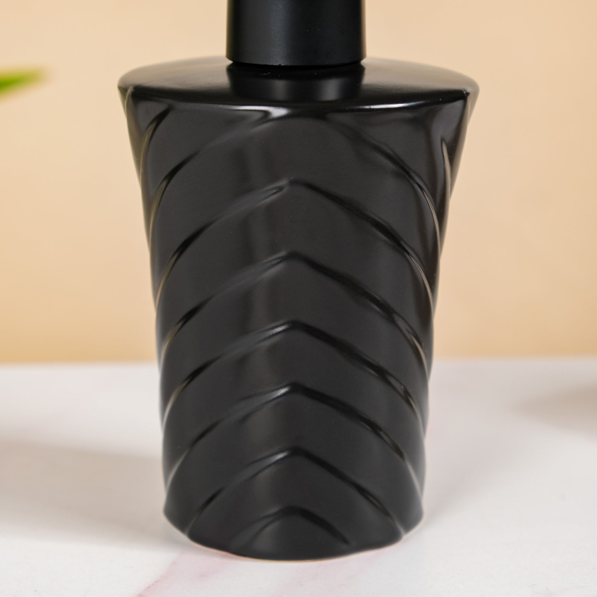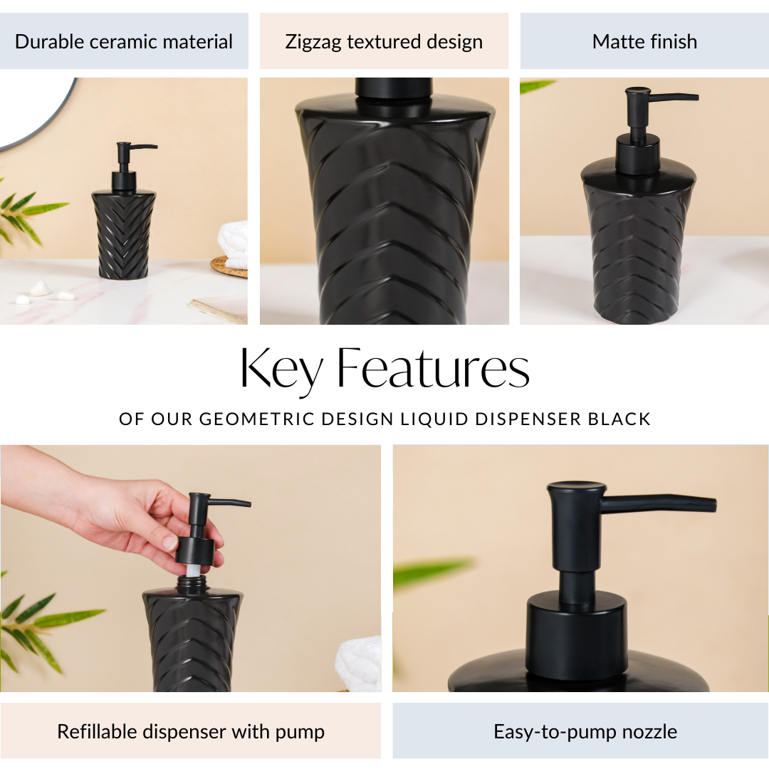 Transform your space with our expertly crafted soap dispenser. Made from durable ceramic material, this refillable handwash dispenser features a sleek look, a unique zigzag textured design, and a modern matte finish. The captivating all-black shade creates a statement in every setting. Moving on to the functional side, the easy-to-pump nozzle of this liquid soap dispenser and its considerable capacity ensure smooth dispensing and lasting use, promising excellent performance for your bathroom or kitchen.