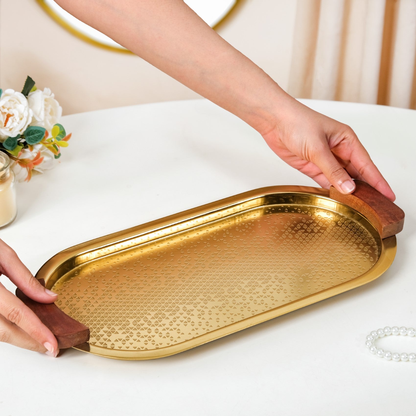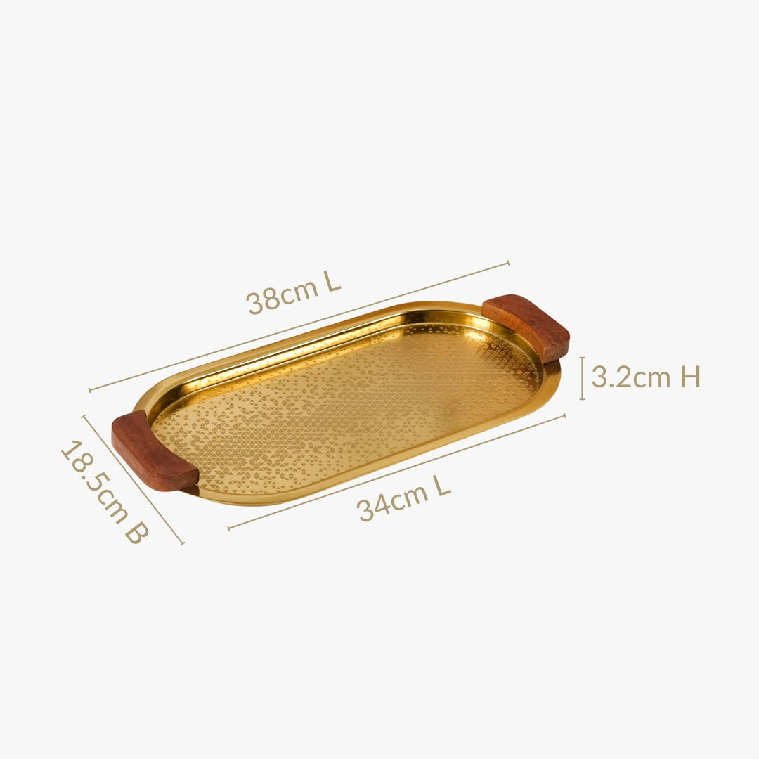 Design: Drenched in a rich gold finish, this oval serving tray is a vision of understated luxury. The surface features an intricate etched triangle pattern, creating a mesmerising visual effect. Thoughtfully crafted, the two mango wood handles add a natural contrast to the metallic sheen, ensuring a comfortable grip when serving. The addition of the anti-slip foam pads not only provides stability but also protects the surface of your tables, ensuring they don't get scratched.