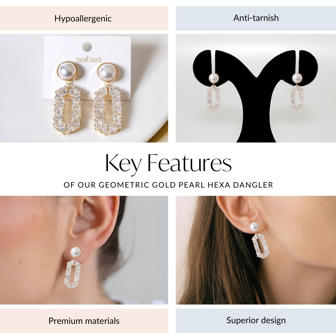 Nestyle: Pair the pearl hexa dangler with an off-shoulder or sleek high-neck outfit to highlight its intricate design. Keep your hair in a chic bun or soft waves to let the geometric elegance shine.