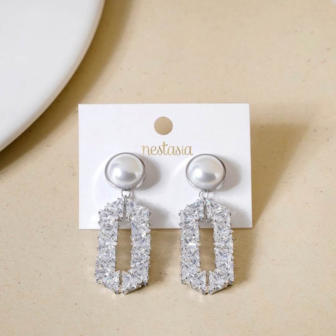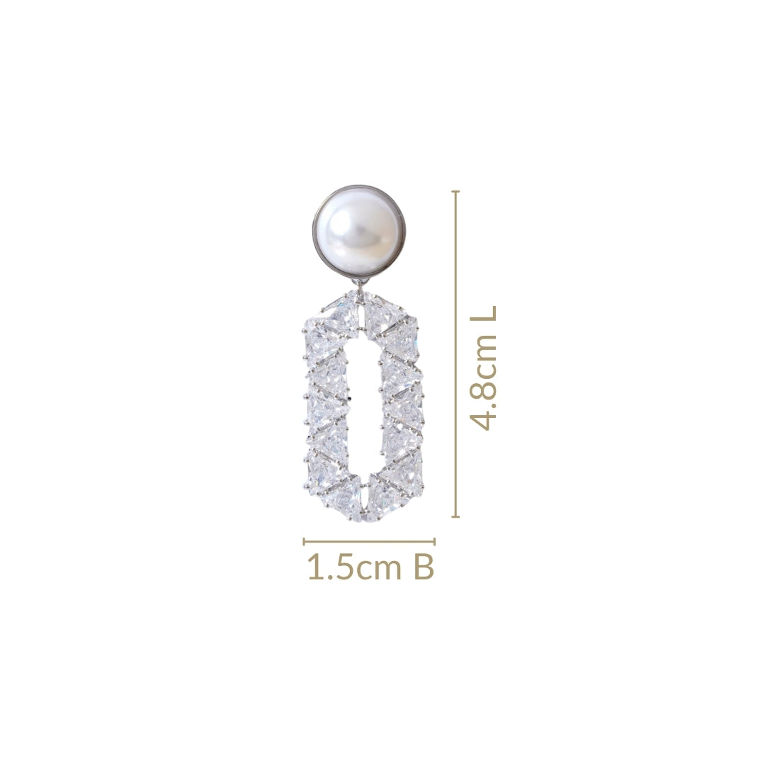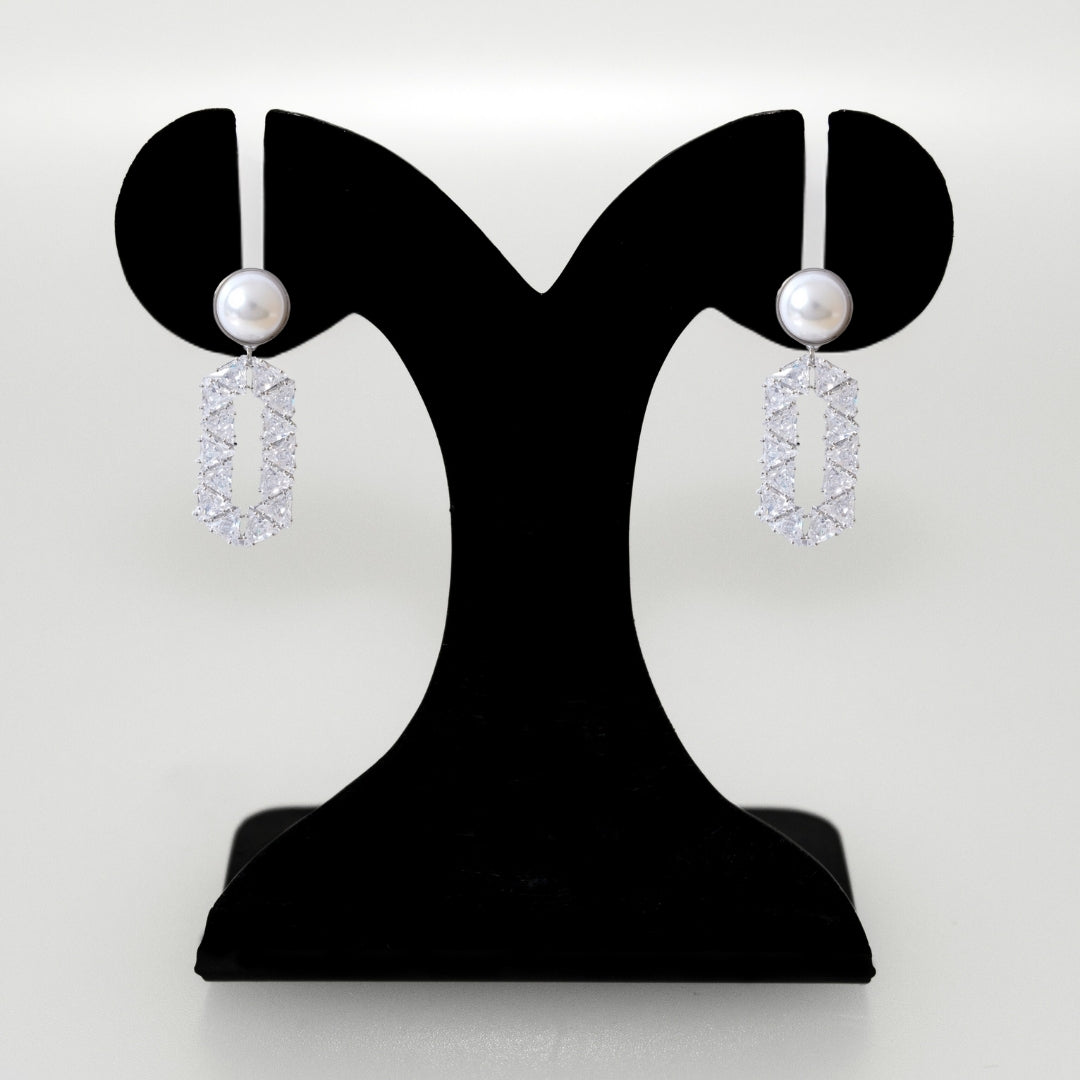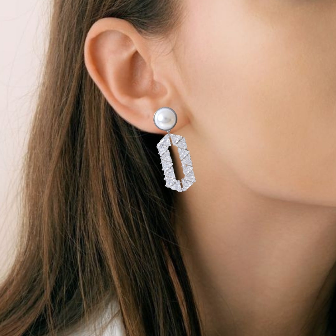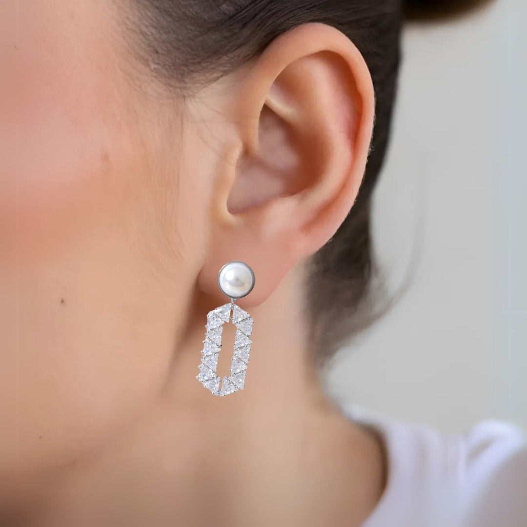 Step into the world of elegance and allure with the captivating silver pearl dangler. A stunning round pearl that is delicately encircled by a shimmering gold metal border, gracefully adorns your earlobe. Suspended from this exquisite pearl is an elongated hexagonal pendant that draws the eye with its unique silhouette. This striking piece is adorned with an array of sparkling stones, meticulously arranged in a symmetrical triangular pattern that dances with light at every turn.
